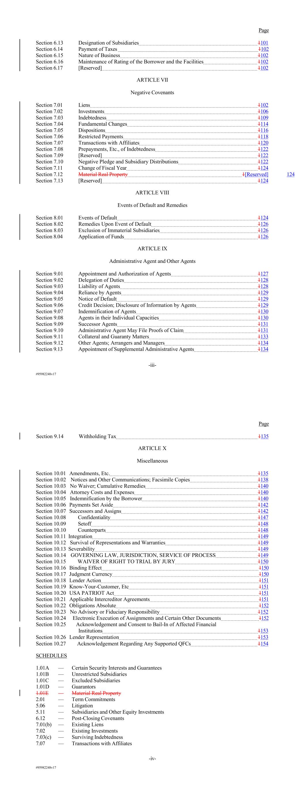 #95982248v17 Page Section 6.13 Designation of Subsidiaries 1101 Section 6.14 Payment of Taxes 1102 Section 6.15 Nature of Business 1102 Section 6.16 Maintenance of Rating of the Borrower and the Facilities 1102 Section 6.17 [Reserved] 1102 ARTICLE VII Negative Covenants Section 7.01 Liens 1102 Section 7.02 Investments 1106 Section 7.03 Indebtedness 1109 Section 7.04 Fundamental Changes 1114 Section 7.05 Dispositions 1116 Section 7.06 Restricted Payments 1118 Section 7.07 Transactions with Affiliates 1120 Section 7.08 Prepayments, Etc., of Indebtedness 1122 Section 7.09 [Reserved] 1122 Section 7.10 Negative Pledge and Subsidiary Distributions 1122 Section 7.11 Change of Fiscal Year 1124 Section 7.12 Material Real Property 1[Reserved] 124 Section 7.13 [Reserved] 1124 ARTICLE VIII Events of Default and Remedies Section 8.01 Events of Default 1124 Section 8.02 Remedies Upon Event of Default 1126 Section 8.03 Exclusion of Immaterial Subsidiaries 1126 Section 8.04 Application of Funds 1126 ARTICLE IX Administrative Agent and Other Agents Section 9.01 Appointment and Authorization of Agents 1127 Section 9.02 Delegation of Duties 1128 Section 9.03 Liability of Agents 1128 Section 9.04 Reliance by Agents 1129 Section 9.05 Notice of Default 1129 Section 9.06 Credit Decision; Disclosure of Information by Agents 1129 Section 9.07 Indemnification of Agents 1130 Section 9.08 Agents in their Individual Capacities 1130 Section 9.09 Successor Agents 1131 Section 9.10 Administrative Agent May File Proofs of Claim 1131 Section 9.11 Collateral and Guaranty Matters 1133 Section 9.12 Other Agents; Arrangers and Managers 1134 Section 9.13 Appointment of Supplemental Administrative Agents 1134 -iii- #95982248v17 Page Section 9.14 Withholding Tax 1135 ARTICLE X Miscellaneous Section 10.01 Amendments, Etc. 1135 Section 10.02 Notices and Other Communications; Facsimile Copies 1138 Section 10.03 No Waiver; Cumulative Remedies 1140 Section 10.04 Attorney Costs and Expenses 1140 Section 10.05 Indemnification by the Borrower 1140 Section 10.06 Payments Set Aside 1142 Section 10.07 Successors and Assigns 1142 Section 10.08 Confidentiality 1147 Section 10.09 Setoff 1148 Section 10.10 Counterparts 1148 Section 10.11 Integration 1149 Section 10.12 Survival of Representations and Warranties 1149 Section 10.13 Severability 1149 Section 10.14 GOVERNING LAW, JURISDICTION, SERVICE OF PROCESS 1149 Section 10.15 WAIVER OF RIGHT TO TRIAL BY JURY 1150 Section 10.16 Binding Effect 1150 Section 10.17 Judgment Currency 1150 Section 10.18 Lender Action 1151 Section 10.19 Know-Your-Customer, Etc 1151 Section 10.20 USA PATRIOT Act 1151 Section 10.21 Applicable Intercreditor Agreements 1151 Section 10.22 Obligations Absolute 1152 Section 10.23 No Advisory or Fiduciary Responsibility 1152 Section 10.24 Electronic Execution of Assignments and Certain Other Documents 1152 Section 10.25 Acknowledgement and Consent to Bail-In of Affected Financial Institutions 1153 Section 10.26 Lender Representation 1153 Section 10.27 Acknowledgement Regarding Any Supported QFCs 1154 SCHEDULES 1.01A — Certain Security Interests and Guarantees 1.01B — Unrestricted Subsidiaries 1.01C — Excluded Subsidiaries 1.01D — Guarantors 1.01E — Material Real Property 2.01 — Term Commitments 5.06 — Litigation 5.11 — Subsidiaries and Other Equity Investments 6.12 — Post-Closing Covenants 7.01(b) — Existing Liens 7.02 — Existing Investments 7.03(c) — Surviving Indebtedness 7.07 — Transactions with Affiliates -iv-