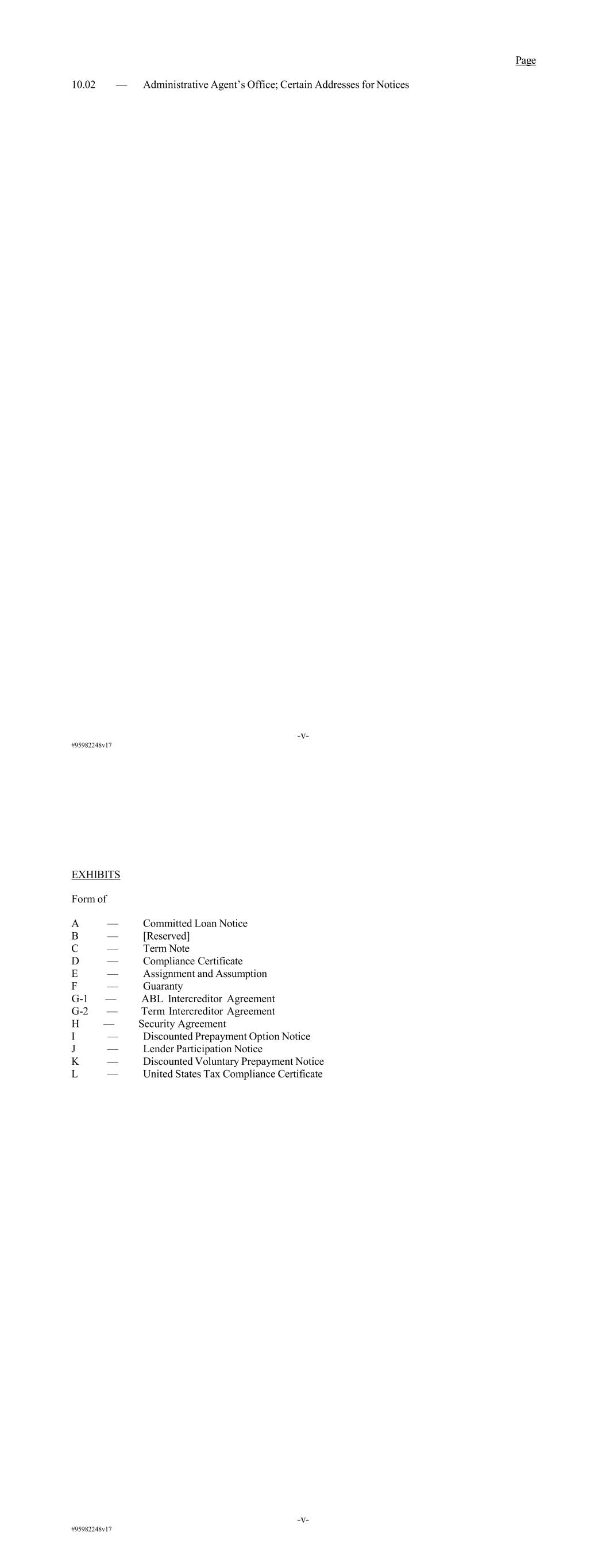 -v- #95982248v17 Page 10.02 — Administrative Agent’s Office; Certain Addresses for Notices -v- #95982248v17 EXHIBITS Form of A — Committed Loan Notice B — [Reserved] C — Term Note D — Compliance Certificate E — Assignment and Assumption F — Guaranty G-1 — ABL Intercreditor Agreement G-2 — Term Intercreditor Agreement H — Security Agreement I — Discounted Prepayment Option Notice J — Lender Participation Notice K — Discounted Voluntary Prepayment Notice L — United States Tax Compliance Certificate