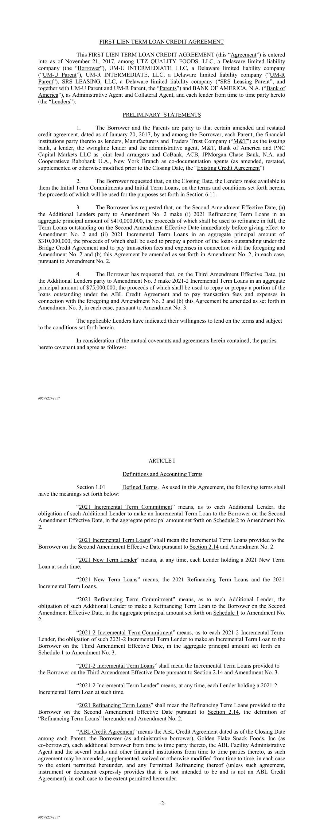 #95982248v17 FIRST LIEN TERM LOAN CREDIT AGREEMENT This FIRST LIEN TERM LOAN CREDIT AGREEMENT (this “Agreement”) is entered into as of November 21, 2017, among UTZ QUALITY FOODS, LLC, a Delaware limited liability company (the “Borrower”), UM-U INTERMEDIATE, LLC, a Delaware limited liability company (“UM-U Parent”), UM-R INTERMEDIATE, LLC, a Delaware limited liability company (“UM-R Parent”), SRS LEASING, LLC, a Delaware limited liability company (“SRS Leasing Parent”, and together with UM-U Parent and UM-R Parent, the “Parents”) and BANK OF AMERICA, N.A. (“Bank of America”), as Administrative Agent and Collateral Agent, and each lender from time to time party hereto (the “Lenders”). PRELIMINARY STATEMENTS 1. The Borrower and the Parents are party to that certain amended and restated credit agreement, dated as of January 20, 2017, by and among the Borrower, each Parent, the financial institutions party thereto as lenders, Manufacturers and Traders Trust Company (“M&T”) as the issuing bank, a lender, the swingline lender and the administrative agent, M&T, Bank of America and PNC Capital Markets LLC as joint lead arrangers and CoBank, ACB, JPMorgan Chase Bank, N.A. and Cooperatieve Rabobank U.A., New York Branch as co-documentation agents (as amended, restated, supplemented or otherwise modified prior to the Closing Date, the “Existing Credit Agreement”). 2. The Borrower requested that, on the Closing Date, the Lenders make available to them the Initial Term Commitments and Initial Term Loans, on the terms and conditions set forth herein, the proceeds of which will be used for the purposes set forth in Section 6.11. 3. The Borrower has requested that, on the Second Amendment Effective Date, (a) the Additional Lenders party to Amendment No. 2 make (i) 2021 Refinancing Term Loans in an aggregate principal amount of $410,000,000, the proceeds of which shall be used to refinance in full, the Term Loans outstanding on the Second Amendment Effective Date immediately before giving effect to Amendment No. 2 and (ii) 2021 Incremental Term Loans in an aggregate principal amount of $310,000,000, the proceeds of which shall be used to prepay a portion of the loans outstanding under the Bridge Credit Agreement and to pay transaction fees and expenses in connection with the foregoing and Amendment No. 2 and (b) this Agreement be amended as set forth in Amendment No. 2, in each case, pursuant to Amendment No. 2. 4. The Borrower has requested that, on the Third Amendment Effective Date, (a) the Additional Lenders party to Amendment No. 3 make 2021-2 Incremental Term Loans in an aggregate principal amount of $75,000,000, the proceeds of which shall be used to repay or prepay a portion of the loans outstanding under the ABL Credit Agreement and to pay transaction fees and expenses in connection with the foregoing and Amendment No. 3 and (b) this Agreement be amended as set forth in Amendment No. 3, in each case, pursuant to Amendment No. 3. The applicable Lenders have indicated their willingness to lend on the terms and subject to the conditions set forth herein. In consideration of the mutual covenants and agreements herein contained, the parties hereto covenant and agree as follows: #95982248v17 ARTICLE I Definitions and Accounting Terms Section 1.01 Defined Terms. As used in this Agreement, the following terms shall have the meanings set forth below: “2021 Incremental Term Commitment” means, as to each Additional Lender, the obligation of such Additional Lender to make an Incremental Term Loan to the Borrower on the Second Amendment Effective Date, in the aggregate principal amount set forth on Schedule 2 to Amendment No. 2. “2021 Incremental Term Loans” shall mean the Incremental Term Loans provided to the Borrower on the Second Amendment Effective Date pursuant to Section 2.14 and Amendment No. 2. “2021 New Term Lender” means, at any time, each Lender holding a 2021 New Term Loan at such time. “2021 New Term Loans” means, the 2021 Refinancing Term Loans and the 2021 Incremental Term Loans. “2021 Refinancing Term Commitment” means, as to each Additional Lender, the obligation of such Additional Lender to make a Refinancing Term Loan to the Borrower on the Second Amendment Effective Date, in the aggregate principal amount set forth on Schedule 1 to Amendment No. 2. “2021-2 Incremental Term Commitment” means, as to each 2021-2 Incremental Term Lender, the obligation of such 2021-2 Incremental Term Lender to make an Incremental Term Loan to the Borrower on the Third Amendment Effective Date, in the aggregate principal amount set forth on Schedule 1 to Amendment No. 3. “2021-2 Incremental Term Loans” shall mean the Incremental Term Loans provided to the Borrower on the Third Amendment Effective Date pursuant to Section 2.14 and Amendment No. 3. “2021-2 Incremental Term Lender” means, at any time, each Lender holding a 2021-2 Incremental Term Loan at such time. “2021 Refinancing Term Loans” shall mean the Refinancing Term Loans provided to the Borrower on the Second Amendment Effective Date pursuant to Section 2.14, the definition of “Refinancing Term Loans” hereunder and Amendment No. 2. “ABL Credit Agreement” means the ABL Credit Agreement dated as of the Closing Date among each Parent, the Borrower (as administrative borrower), Golden Flake Snack Foods, Inc (as co-borrower), each additional borrower from time to time party thereto, the ABL Facility Administrative Agent and the several banks and other financial institutions from time to time parties thereto, as such agreement may be amended, supplemented, waived or otherwise modified from time to time, in each case to the extent permitted hereunder, and any Permitted Refinancing thereof (unless such agreement, instrument or document expressly provides that it is not intended to be and is not an ABL Credit Agreement), in each case to the extent permitted hereunder. -2-