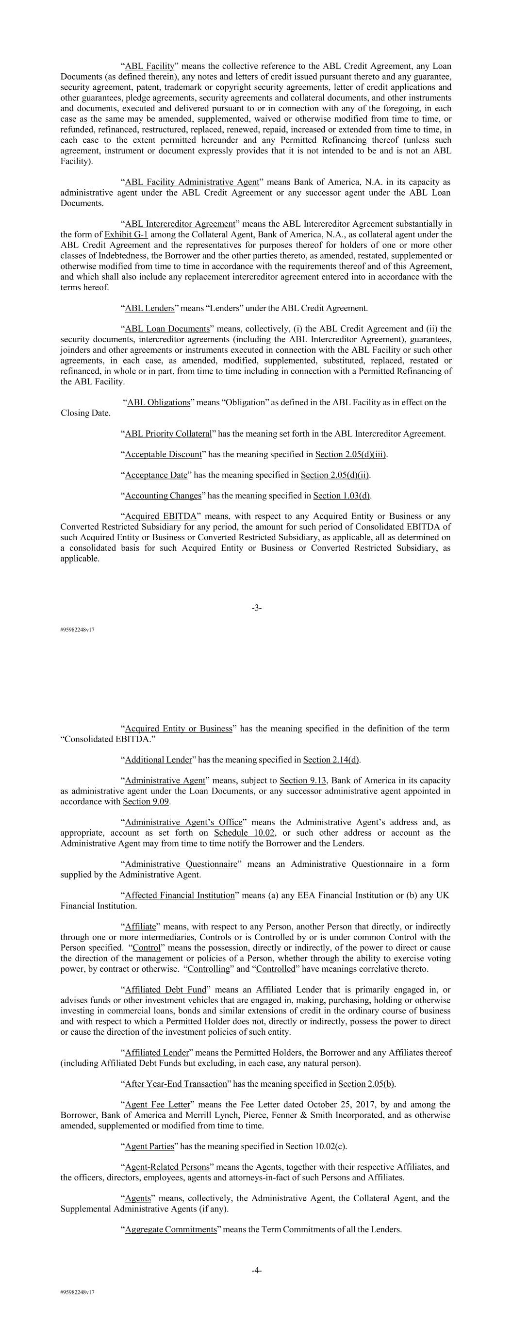 #95982248v17 “ABL Facility” means the collective reference to the ABL Credit Agreement, any Loan Documents (as defined therein), any notes and letters of credit issued pursuant thereto and any guarantee, security agreement, patent, trademark or copyright security agreements, letter of credit applications and other guarantees, pledge agreements, security agreements and collateral documents, and other instruments and documents, executed and delivered pursuant to or in connection with any of the foregoing, in each case as the same may be amended, supplemented, waived or otherwise modified from time to time, or refunded, refinanced, restructured, replaced, renewed, repaid, increased or extended from time to time, in each case to the extent permitted hereunder and any Permitted Refinancing thereof (unless such agreement, instrument or document expressly provides that it is not intended to be and is not an ABL Facility). “ABL Facility Administrative Agent” means Bank of America, N.A. in its capacity as administrative agent under the ABL Credit Agreement or any successor agent under the ABL Loan Documents. “ABL Intercreditor Agreement” means the ABL Intercreditor Agreement substantially in the form of Exhibit G-1 among the Collateral Agent, Bank of America, N.A., as collateral agent under the ABL Credit Agreement and the representatives for purposes thereof for holders of one or more other classes of Indebtedness, the Borrower and the other parties thereto, as amended, restated, supplemented or otherwise modified from time to time in accordance with the requirements thereof and of this Agreement, and which shall also include any replacement intercreditor agreement entered into in accordance with the terms hereof. “ABL Lenders” means “Lenders” under the ABL Credit Agreement. “ABL Loan Documents” means, collectively, (i) the ABL Credit Agreement and (ii) the security documents, intercreditor agreements (including the ABL Intercreditor Agreement), guarantees, joinders and other agreements or instruments executed in connection with the ABL Facility or such other agreements, in each case, as amended, modified, supplemented, substituted, replaced, restated or refinanced, in whole or in part, from time to time including in connection with a Permitted Refinancing of the ABL Facility. “ABL Obligations” means “Obligation” as defined in the ABL Facility as in effect on the Closing Date. “ABL Priority Collateral” has the meaning set forth in the ABL Intercreditor Agreement. “Acceptable Discount” has the meaning specified in Section 2.05(d)(iii). “Acceptance Date” has the meaning specified in Section 2.05(d)(ii). “Accounting Changes” has the meaning specified in Section 1.03(d). “Acquired EBITDA” means, with respect to any Acquired Entity or Business or any Converted Restricted Subsidiary for any period, the amount for such period of Consolidated EBITDA of such Acquired Entity or Business or Converted Restricted Subsidiary, as applicable, all as determined on a consolidated basis for such Acquired Entity or Business or Converted Restricted Subsidiary, as applicable. -3- #95982248v17 “Acquired Entity or Business” has the meaning specified in the definition of the term “Consolidated EBITDA.” “Additional Lender” has the meaning specified in Section 2.14(d). “Administrative Agent” means, subject to Section 9.13, Bank of America in its capacity as administrative agent under the Loan Documents, or any successor administrative agent appointed in accordance with Section 9.09. “Administrative Agent’s Office” means the Administrative Agent’s address and, as appropriate, account as set forth on Schedule 10.02, or such other address or account as the Administrative Agent may from time to time notify the Borrower and the Lenders. “Administrative Questionnaire” means an Administrative Questionnaire in a form supplied by the Administrative Agent. “Affected Financial Institution” means (a) any EEA Financial Institution or (b) any UK Financial Institution. “Affiliate” means, with respect to any Person, another Person that directly, or indirectly through one or more intermediaries, Controls or is Controlled by or is under common Control with the Person specified. “Control” means the possession, directly or indirectly, of the power to direct or cause the direction of the management or policies of a Person, whether through the ability to exercise voting power, by contract or otherwise. “Controlling” and “Controlled” have meanings correlative thereto. “Affiliated Debt Fund” means an Affiliated Lender that is primarily engaged in, or advises funds or other investment vehicles that are engaged in, making, purchasing, holding or otherwise investing in commercial loans, bonds and similar extensions of credit in the ordinary course of business and with respect to which a Permitted Holder does not, directly or indirectly, possess the power to direct or cause the direction of the investment policies of such entity. “Affiliated Lender” means the Permitted Holders, the Borrower and any Affiliates thereof (including Affiliated Debt Funds but excluding, in each case, any natural person). “After Year-End Transaction” has the meaning specified in Section 2.05(b). “Agent Fee Letter” means the Fee Letter dated October 25, 2017, by and among the Borrower, Bank of America and Merrill Lynch, Pierce, Fenner & Smith Incorporated, and as otherwise amended, supplemented or modified from time to time. “Agent Parties” has the meaning specified in Section 10.02(c). “Agent-Related Persons” means the Agents, together with their respective Affiliates, and the officers, directors, employees, agents and attorneys-in-fact of such Persons and Affiliates. “Agents” means, collectively, the Administrative Agent, the Collateral Agent, and the Supplemental Administrative Agents (if any). “Aggregate Commitments” means the Term Commitme
