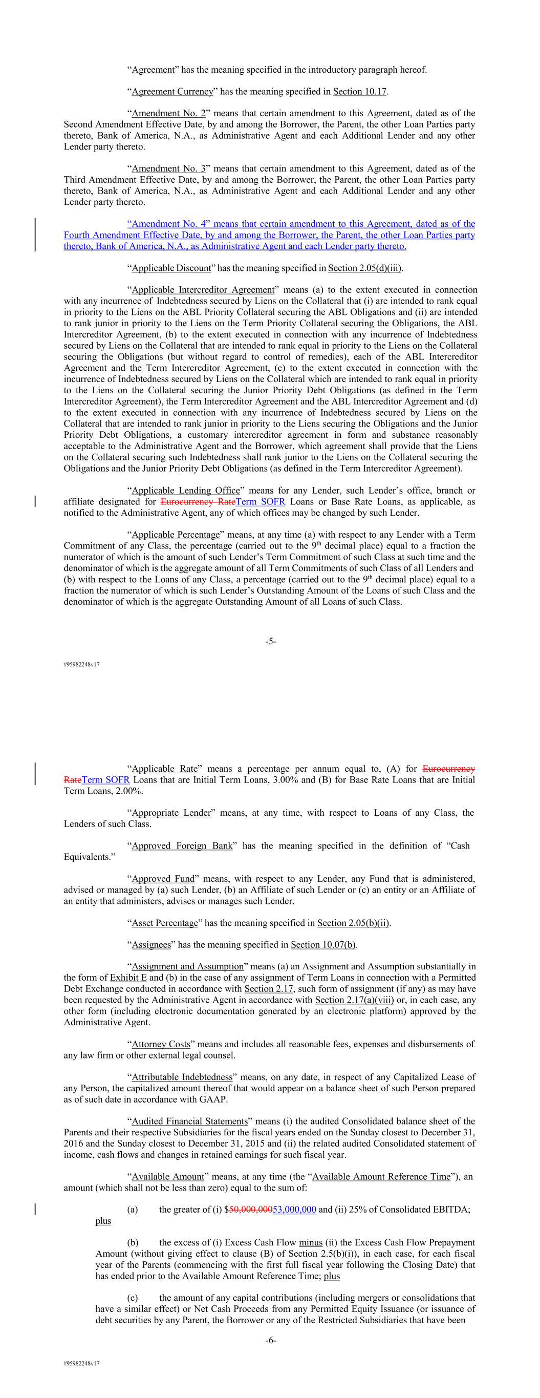 #95982248v17 “Agreement” has the meaning specified in the introductory paragraph hereof. “Agreement Currency” has the meaning specified in Section 10.17. “Amendment No. 2” means that certain amendment to this Agreement, dated as of the Second Amendment Effective Date, by and among the Borrower, the Parent, the other Loan Parties party thereto, Bank of America, N.A., as Administrative Agent and each Additional Lender and any other Lender party thereto. “Amendment No. 3” means that certain amendment to this Agreement, dated as of the Third Amendment Effective Date, by and among the Borrower, the Parent, the other Loan Parties party thereto, Bank of America, N.A., as Administrative Agent and each Additional Lender and any other Lender party thereto. “Amendment No. 4” means that certain amendment to this Agreement, dated as of the Fourth Amendment Effective Date, by and among the Borrower, the Parent, the other Loan Parties party thereto, Bank of America, N.A., as Administrative Agent and each Lender party thereto. “Applicable Discount” has the meaning specified in Section 2.05(d)(iii). “Applicable Intercreditor Agreement” means (a) to the extent executed in connection with any incurrence of Indebtedness secured by Liens on the Collateral that (i) are intended to rank equal in priority to the Liens on the ABL Priority Collateral securing the ABL Obligations and (ii) are intended to rank junior in priority to the Liens on the Term Priority Collateral securing the Obligations, the ABL Intercreditor Agreement, (b) to the extent executed in connection with any incurrence of Indebtedness secured by Liens on the Collateral that are intended to rank equal in priority to the Liens on the Collateral securing the Obligations (but without regard to control of remedies), each of the ABL Intercreditor Agreement and the Term Intercreditor Agreement, (c) to the extent executed in connection with the incurrence of Indebtedness secured by Liens on the Collateral which are intended to rank equal in priority to the Liens on the Collateral securing the Junior Priority Debt Obligations (as defined in the Term Intercreditor Agreement), the Term Intercreditor Agreement and the ABL Intercreditor Agreement and (d) to the extent executed in connection with any incurrence of Indebtedness secured by Liens on the Collateral that are intended to rank junior in priority to the Liens securing the Obligations and the Junior Priority Debt Obligations, a customary intercreditor agreement in form and substance reasonably acceptable to the Administrative Agent and the Borrower, which agreement shall provide that the Liens on the Collateral securing such Indebtedness shall rank junior to the Liens on the Collateral securing the Obligations and the Junior Priority Debt Obligations (as defined in the Term Intercreditor Agreement). “Applicable Lending Office” means for any Lender, such Lender’s office, branch or affiliate designated for Eurocurrency RateTerm SOFR Loans or Base Rate Loans, as applicable, as notified to the Administrative Agent, any of which offices may be changed by such Lender. “Applicable Percentage” means, at any time (a) with respect to any Lender with a Term Commitment of any Class, the percentage (carried out to the 9th decimal place) equal to a fraction the numerator of which is the amount of such Lender’s Term Commitment of such Class at such time and the denominator of which is the aggregate amount of all Term Commitments of such Class of all Lenders and (b) with respect to the Loans of any Class, a percentage (carried out to the 9th decimal place) equal to a fraction the numerator of which is such Lender’s Outstanding Amount of the Loans of such Class and the denominator of which is the aggregate Outstanding Amount of all Loans of such Class. -5- #95982248v17 “Applicable Rate” means a percentage per annum equal to, (A) for Eurocurrency RateTerm SOFR Loans that are Initial Term Loans, 3.00% and (B) for Base Rate Loans that are Initial Term Loans, 2.00%. “Appropriate Lender” means, at any time, with respect to Loans of any Class, the Lenders of such Class. “Approved Foreign Bank” has the meaning specified in the definition of “Cash Equivalents.” “Approved Fund” means, with respect to any Lender, any Fund that is administered, advised or managed by (a) such Lender, (b) an Affiliate of such Lender or (c) an entity or an Affiliate of an entity that administers, advises or manages such Lender. “Asset Percentage” has the meaning specified in Section 2.05(b)(ii). “Assignees” has the meaning specified in Section 10.07(b). “Assignment and Assumption” means (a) an Assignment and Assumption substantially in the form of Exhibit E and (b) in the case of any assignment of Term Loans in connection with a Permitted Debt Exchange conducted in accordance with Section 2.17, such form of assignment (if any) as may have been requested by the Administrative Agent in accordance with Section 2.17(a)(viii) or, in each case, any other form (including electronic documentation generated by an electronic platform) approved by the Administrative Agent. “Attorney Costs” means and includes all reasonable fees, expenses and disbursements of any law firm or other external legal counsel. “Attributable Indebtedness” means, on any date, in respect of any Capitalized Lease of any Person, the capitalized amount thereof that would appear on a balance sheet of such Person prepared as of such date in accordance with GAAP. “Audited Financial Statements” means (i) the audited Consolidated balance sheet of the Parents and their respective Subsidiaries for the fiscal years ended on the Sunday closest to December 31, 2016 and the Sunday closest to December 31, 2015 and (ii) the related audited Consolidated statement of income, cash flows and changes in retained earnings for such fiscal year. “Available Amount” means, at any time (the “Available Amount Reference T