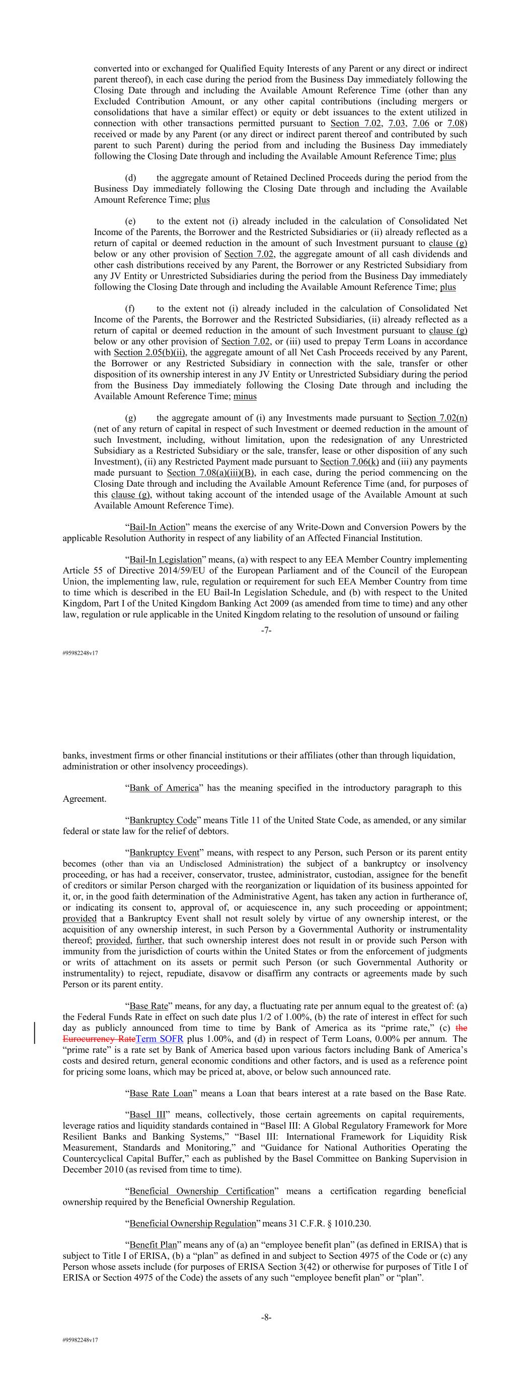 #95982248v17 converted into or exchanged for Qualified Equity Interests of any Parent or any direct or indirect parent thereof), in each case during the period from the Business Day immediately following the Closing Date through and including the Available Amount Reference Time (other than any Excluded Contribution Amount, or any other capital contributions (including mergers or consolidations that have a similar effect) or equity or debt issuances to the extent utilized in connection with other transactions permitted pursuant to Section 7.02, 7.03, 7.06 or 7.08) received or made by any Parent (or any direct or indirect parent thereof and contributed by such parent to such Parent) during the period from and including the Business Day immediately following the Closing Date through and including the Available Amount Reference Time; plus (d) the aggregate amount of Retained Declined Proceeds during the period from the Business Day immediately following the Closing Date through and including the Available Amount Reference Time; plus (e) to the extent not (i) already included in the calculation of Consolidated Net Income of the Parents, the Borrower and the Restricted Subsidiaries or (ii) already reflected as a return of capital or deemed reduction in the amount of such Investment pursuant to clause (g) below or any other provision of Section 7.02, the aggregate amount of all cash dividends and other cash distributions received by any Parent, the Borrower or any Restricted Subsidiary from any JV Entity or Unrestricted Subsidiaries during the period from the Business Day immediately following the Closing Date through and including the Available Amount Reference Time; plus (f) to the extent not (i) already included in the calculation of Consolidated Net Income of the Parents, the Borrower and the Restricted Subsidiaries, (ii) already reflected as a return of capital or deemed reduction in the amount of such Investment pursuant to clause (g) below or any other provision of Section 7.02, or (iii) used to prepay Term Loans in accordance with Section 2.05(b)(ii), the aggregate amount of all Net Cash Proceeds received by any Parent, the Borrower or any Restricted Subsidiary in connection with the sale, transfer or other disposition of its ownership interest in any JV Entity or Unrestricted Subsidiary during the period from the Business Day immediately following the Closing Date through and including the Available Amount Reference Time; minus (g) the aggregate amount of (i) any Investments made pursuant to Section 7.02(n) (net of any return of capital in respect of such Investment or deemed reduction in the amount of such Investment, including, without limitation, upon the redesignation of any Unrestricted Subsidiary as a Restricted Subsidiary or the sale, transfer, lease or other disposition of any such Investment), (ii) any Restricted Payment made pursuant to Section 7.06(k) and (iii) any payments made pursuant to Section 7.08(a)(iii)(B), in each case, during the period commencing on the Closing Date through and including the Available Amount Reference Time (and, for purposes of this clause (g), without taking account of the intended usage of the Available Amount at such Available Amount Reference Time). “Bail-In Action” means the exercise of any Write-Down and Conversion Powers by the applicable Resolution Authority in respect of any liability of an Affected Financial Institution. “Bail-In Legislation” means, (a) with respect to any EEA Member Country implementing Article 55 of Directive 2014/59/EU of the European Parliament and of the Council of the European Union, the implementing law, rule, regulation or requirement for such EEA Member Country from time to time which is described in the EU Bail-In Legislation Schedule, and (b) with respect to the United Kingdom, Part I of the United Kingdom Banking Act 2009 (as amended from time to time) and any other law, regulation or rule applicable in the United Kingdom relating to the resolution of unsound or failing -7- #95982248v17 banks, investment firms or other financial institutions or their affiliates (other than through liquidation, administration or other insolvency proceedings). “Bank of America” has the meaning specified in the introductory paragraph to this Agreement. “Bankruptcy Code” means Title 11 of the United State Code, as amended, or any similar federal or state law for the relief of debtors. “Bankruptcy Event” means, with respect to any Person, such Person or its parent entity becomes (other than via an Undisclosed Administration) the subject of a bankruptcy or insolvency proceeding, or has had a receiver, conservator, trustee, administrator, custodian, assignee for the benefit of creditors or similar Person charged with the reorganization or liquidation of its business appointed for it, or, in the good faith determination of the Administrative Agent, has taken any action in furtherance of, or indicating its consent to, approval of, or acquiescence in, any such proceeding or appointment; provided that a Bankruptcy Event shall not result solely by virtue of any ownership interest, or the acquisition of any ownership interest, in such Person by a Governmental Authority or instrumentality thereof; provided, further, that such ownership interest does not result in or provide such Person with immunity from the jurisdiction of courts within the United States or from the enforcement of judgments or writs of attachment on its assets or permit such Person (or such Governmental Authority or instrumentality) to reject, repudiate, disavow or disaffirm any contracts or agreements made by such Person or its parent entity. “Base Rate” means, for any day, a fluctuating rate per annum equal to the greatest of: (a) the Federal Funds Rate in effect on such date plus 1/2 of 1.00%, (b) the rate of interest in effect for such day as publicly announced from time to time by Bank of America as its “prime rate,” (c) the Eurocurrency R