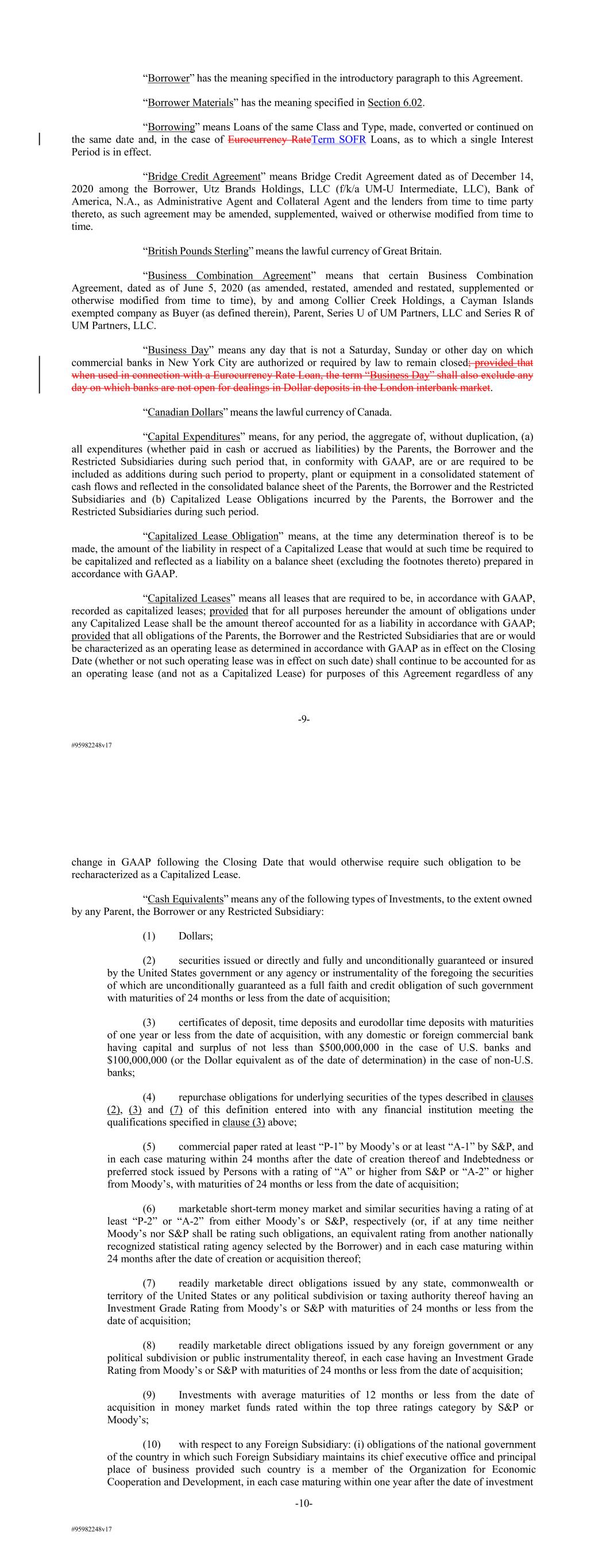 #95982248v17 “Borrower” has the meaning specified in the introductory paragraph to this Agreement. “Borrower Materials” has the meaning specified in Section 6.02. “Borrowing” means Loans of the same Class and Type, made, converted or continued on the same date and, in the case of Eurocurrency RateTerm SOFR Loans, as to which a single Interest Period is in effect. “Bridge Credit Agreement” means Bridge Credit Agreement dated as of December 14, 2020 among the Borrower, Utz Brands Holdings, LLC (f/k/a UM-U Intermediate, LLC), Bank of America, N.A., as Administrative Agent and Collateral Agent and the lenders from time to time party thereto, as such agreement may be amended, supplemented, waived or otherwise modified from time to time. “British Pounds Sterling” means the lawful currency of Great Britain. “Business Combination Agreement” means that certain Business Combination Agreement, dated as of June 5, 2020 (as amended, restated, amended and restated, supplemented or otherwise modified from time to time), by and among Collier Creek Holdings, a Cayman Islands exempted company as Buyer (as defined therein), Parent, Series U of UM Partners, LLC and Series R of UM Partners, LLC. “Business Day” means any day that is not a Saturday, Sunday or other day on which commercial banks in New York City are authorized or required by law to remain closed; provided that when used in connection with a Eurocurrency Rate Loan, the term “Business Day” shall also exclude any day on which banks are not open for dealings in Dollar deposits in the London interbank market. “Canadian Dollars” means the lawful currency of Canada. “Capital Expenditures” means, for any period, the aggregate of, without duplication, (a) all expenditures (whether paid in cash or accrued as liabilities) by the Parents, the Borrower and the Restricted Subsidiaries during such period that, in conformity with GAAP, are or are required to be included as additions during such period to property, plant or equipment in a consolidated statement of cash flows and reflected in the consolidated balance sheet of the Parents, the Borrower and the Restricted Subsidiaries and (b) Capitalized Lease Obligations incurred by the Parents, the Borrower and the Restricted Subsidiaries during such period. “Capitalized Lease Obligation” means, at the time any determination thereof is to be made, the amount of the liability in respect of a Capitalized Lease that would at such time be required to be capitalized and reflected as a liability on a balance sheet (excluding the footnotes thereto) prepared in accordance with GAAP. “Capitalized Leases” means all leases that are required to be, in accordance with GAAP, recorded as capitalized leases; provided that for all purposes hereunder the amount of obligations under any Capitalized Lease shall be the amount thereof accounted for as a liability in accordance with GAAP; provided that all obligations of the Parents, the Borrower and the Restricted Subsidiaries that are or would be characterized as an operating lease as determined in accordance with GAAP as in effect on the Closing Date (whether or not such operating lease was in effect on such date) shall continue to be accounted for as an operating lease (and not as a Capitalized Lease) for purposes of this Agreement regardless of any -9- #95982248v17 change in GAAP following the Closing Date that would otherwise require such obligation to be recharacterized as a Capitalized Lease. “Cash Equivalents” means any of the following types of Investments, to the extent owned by any Parent, the Borrower or any Restricted Subsidiary: (1) Dollars; (2) securities issued or directly and fully and unconditionally guaranteed or insured by the United States government or any agency or instrumentality of the foregoing the securities of which are unconditionally guaranteed as a full faith and credit obligation of such government with maturities of 24 months or less from the date of acquisition; (3) certificates of deposit, time deposits and eurodollar time deposits with maturities of one year or less from the date of acquisition, with any domestic or foreign commercial bank having capital and surplus of not less than $500,000,000 in the case of U.S. banks and $100,000,000 (or the Dollar equivalent as of the date of determination) in the case of non-U.S. banks; (4) repurchase obligations for underlying securities of the types described in clauses (2), (3) and (7) of this definition entered into with any financial institution meeting the qualifications specified in clause (3) above; (5) commercial paper rated at least “P-1” by Moody’s or at least “A-1” by S&P, and in each case maturing within 24 months after the date of creation thereof and Indebtedness or preferred stock issued by Persons with a rating of “A” or higher from S&P or “A-2” or higher from Moody’s, with maturities of 24 months or less from the date of acquisition; (6) marketable short-term money market and similar securities having a rating of at least “P-2” or “A-2” from either Moody’s or S&P, respectively (or, if at any time neither Moody’s nor S&P shall be rating such obligations, an equivalent rating from another nationally recognized statistical rating agency selected by the Borrower) and in each case maturing within 24 months after the date of creation or acquisition thereof; (7) readily marketable direct obligations issued by any state, commonwealth or territory of the United States or any political subdivision or taxing authority thereof having an Investment Grade Rating from Moody’s or S&P with maturities of 24 months or less from the date of acquisition; (8) readily marketable direct obligations issued by any foreign government or any political subdivision or public instrumentality thereof, in each case having an Investment Grade Rating from Moody’s or S&P with maturities of 24 months or less from the date of acquisition; (9)