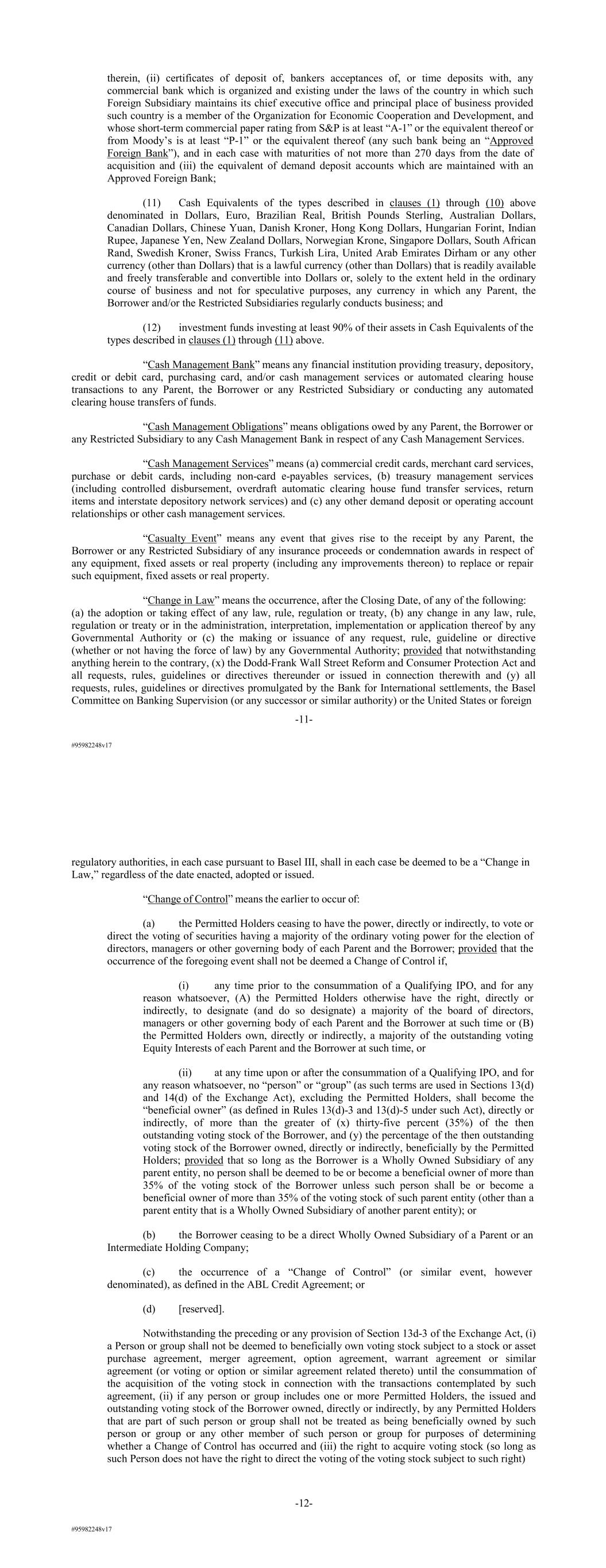 #95982248v17 therein, (ii) certificates of deposit of, bankers acceptances of, or time deposits with, any commercial bank which is organized and existing under the laws of the country in which such Foreign Subsidiary maintains its chief executive office and principal place of business provided such country is a member of the Organization for Economic Cooperation and Development, and whose short-term commercial paper rating from S&P is at least “A-1” or the equivalent thereof or from Moody’s is at least “P-1” or the equivalent thereof (any such bank being an “Approved Foreign Bank”), and in each case with maturities of not more than 270 days from the date of acquisition and (iii) the equivalent of demand deposit accounts which are maintained with an Approved Foreign Bank; (11) Cash Equivalents of the types described in clauses (1) through (10) above denominated in Dollars, Euro, Brazilian Real, British Pounds Sterling, Australian Dollars, Canadian Dollars, Chinese Yuan, Danish Kroner, Hong Kong Dollars, Hungarian Forint, Indian Rupee, Japanese Yen, New Zealand Dollars, Norwegian Krone, Singapore Dollars, South African Rand, Swedish Kroner, Swiss Francs, Turkish Lira, United Arab Emirates Dirham or any other currency (other than Dollars) that is a lawful currency (other than Dollars) that is readily available and freely transferable and convertible into Dollars or, solely to the extent held in the ordinary course of business and not for speculative purposes, any currency in which any Parent, the Borrower and/or the Restricted Subsidiaries regularly conducts business; and (12) investment funds investing at least 90% of their assets in Cash Equivalents of the types described in clauses (1) through (11) above. “Cash Management Bank” means any financial institution providing treasury, depository, credit or debit card, purchasing card, and/or cash management services or automated clearing house transactions to any Parent, the Borrower or any Restricted Subsidiary or conducting any automated clearing house transfers of funds. “Cash Management Obligations” means obligations owed by any Parent, the Borrower or any Restricted Subsidiary to any Cash Management Bank in respect of any Cash Management Services. “Cash Management Services” means (a) commercial credit cards, merchant card services, purchase or debit cards, including non-card e-payables services, (b) treasury management services (including controlled disbursement, overdraft automatic clearing house fund transfer services, return items and interstate depository network services) and (c) any other demand deposit or operating account relationships or other cash management services. “Casualty Event” means any event that gives rise to the receipt by any Parent, the Borrower or any Restricted Subsidiary of any insurance proceeds or condemnation awards in respect of any equipment, fixed assets or real property (including any improvements thereon) to replace or repair such equipment, fixed assets or real property. “Change in Law” means the occurrence, after the Closing Date, of any of the following: (a) the adoption or taking effect of any law, rule, regulation or treaty, (b) any change in any law, rule, regulation or treaty or in the administration, interpretation, implementation or application thereof by any Governmental Authority or (c) the making or issuance of any request, rule, guideline or directive (whether or not having the force of law) by any Governmental Authority; provided that notwithstanding anything herein to the contrary, (x) the Dodd-Frank Wall Street Reform and Consumer Protection Act and all requests, rules, guidelines or directives thereunder or issued in connection therewith and (y) all requests, rules, guidelines or directives promulgated by the Bank for International settlements, the Basel Committee on Banking Supervision (or any successor or similar authority) or the United States or foreign -11- #95982248v17 regulatory authorities, in each case pursuant to Basel III, shall in each case be deemed to be a “Change in Law,” regardless of the date enacted, adopted or issued. “Change of Control” means the earlier to occur of: (a) the Permitted Holders ceasing to have the power, directly or indirectly, to vote or direct the voting of securities having a majority of the ordinary voting power for the election of directors, managers or other governing body of each Parent and the Borrower; provided that the occurrence of the foregoing event shall not be deemed a Change of Control if, (i) any time prior to the consummation of a Qualifying IPO, and for any reason whatsoever, (A) the Permitted Holders otherwise have the right, directly or indirectly, to designate (and do so designate) a majority of the board of directors, managers or other governing body of each Parent and the Borrower at such time or (B) the Permitted Holders own, directly or indirectly, a majority of the outstanding voting Equity Interests of each Parent and the Borrower at such time, or (ii) at any time upon or after the consummation of a Qualifying IPO, and for any reason whatsoever, no “person” or “group” (as such terms are used in Sections 13(d) and 14(d) of the Exchange Act), excluding the Permitted Holders, shall become the “beneficial owner” (as defined in Rules 13(d)-3 and 13(d)-5 under such Act), directly or indirectly, of more than the greater of (x) thirty-five percent (35%) of the then outstanding voting stock of the Borrower, and (y) the percentage of the then outstanding voting stock of the Borrower owned, directly or indirectly, beneficially by the Permitted Holders; provided that so long as the Borrower is a Wholly Owned Subsidiary of any parent entity, no person shall be deemed to be or become a beneficial owner of more than 35% of the voting stock of the Borrower unless such person shall be or become a beneficial owner of more than 35% of the voting stock of such parent entity (other than a paren