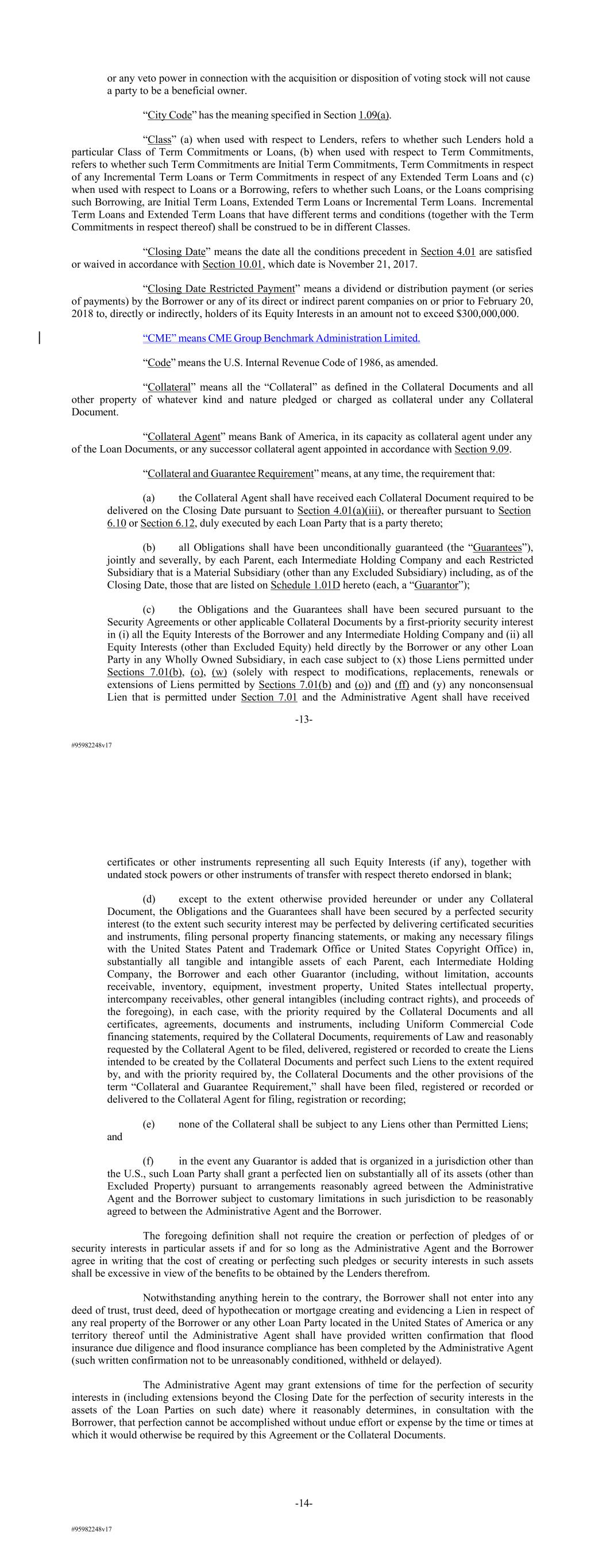 #95982248v17 or any veto power in connection with the acquisition or disposition of voting stock will not cause a party to be a beneficial owner. “City Code” has the meaning specified in Section 1.09(a). “Class” (a) when used with respect to Lenders, refers to whether such Lenders hold a particular Class of Term Commitments or Loans, (b) when used with respect to Term Commitments, refers to whether such Term Commitments are Initial Term Commitments, Term Commitments in respect of any Incremental Term Loans or Term Commitments in respect of any Extended Term Loans and (c) when used with respect to Loans or a Borrowing, refers to whether such Loans, or the Loans comprising such Borrowing, are Initial Term Loans, Extended Term Loans or Incremental Term Loans. Incremental Term Loans and Extended Term Loans that have different terms and conditions (together with the Term Commitments in respect thereof) shall be construed to be in different Classes. “Closing Date” means the date all the conditions precedent in Section 4.01 are satisfied or waived in accordance with Section 10.01, which date is November 21, 2017. “Closing Date Restricted Payment” means a dividend or distribution payment (or series of payments) by the Borrower or any of its direct or indirect parent companies on or prior to February 20, 2018 to, directly or indirectly, holders of its Equity Interests in an amount not to exceed $300,000,000. “CME” means CME Group Benchmark Administration Limited. “Code” means the U.S. Internal Revenue Code of 1986, as amended. “Collateral” means all the “Collateral” as defined in the Collateral Documents and all other property of whatever kind and nature pledged or charged as collateral under any Collateral Document. “Collateral Agent” means Bank of America, in its capacity as collateral agent under any of the Loan Documents, or any successor collateral agent appointed in accordance with Section 9.09. “Collateral and Guarantee Requirement” means, at any time, the requirement that: (a) the Collateral Agent shall have received each Collateral Document required to be delivered on the Closing Date pursuant to Section 4.01(a)(iii), or thereafter pursuant to Section 6.10 or Section 6.12, duly executed by each Loan Party that is a party thereto; (b) all Obligations shall have been unconditionally guaranteed (the “Guarantees”), jointly and severally, by each Parent, each Intermediate Holding Company and each Restricted Subsidiary that is a Material Subsidiary (other than any Excluded Subsidiary) including, as of the Closing Date, those that are listed on Schedule 1.01D hereto (each, a “Guarantor”); (c) the Obligations and the Guarantees shall have been secured pursuant to the Security Agreements or other applicable Collateral Documents by a first-priority security interest in (i) all the Equity Interests of the Borrower and any Intermediate Holding Company and (ii) all Equity Interests (other than Excluded Equity) held directly by the Borrower or any other Loan Party in any Wholly Owned Subsidiary, in each case subject to (x) those Liens permitted under Sections 7.01(b), (o), (w) (solely with respect to modifications, replacements, renewals or extensions of Liens permitted by Sections 7.01(b) and (o)) and (ff) and (y) any nonconsensual Lien that is permitted under Section 7.01 and the Administrative Agent shall have received -13- #95982248v17 certificates or other instruments representing all such Equity Interests (if any), together with undated stock powers or other instruments of transfer with respect thereto endorsed in blank; (d) except to the extent otherwise provided hereunder or under any Collateral Document, the Obligations and the Guarantees shall have been secured by a perfected security interest (to the extent such security interest may be perfected by delivering certificated securities and instruments, filing personal property financing statements, or making any necessary filings with the United States Patent and Trademark Office or United States Copyright Office) in, substantially all tangible and intangible assets of each Parent, each Intermediate Holding Company, the Borrower and each other Guarantor (including, without limitation, accounts receivable, inventory, equipment, investment property, United States intellectual property, intercompany receivables, other general intangibles (including contract rights), and proceeds of the foregoing), in each case, with the priority required by the Collateral Documents and all certificates, agreements, documents and instruments, including Uniform Commercial Code financing statements, required by the Collateral Documents, requirements of Law and reasonably requested by the Collateral Agent to be filed, delivered, registered or recorded to create the Liens intended to be created by the Collateral Documents and perfect such Liens to the extent required by, and with the priority required by, the Collateral Documents and the other provisions of the term “Collateral and Guarantee Requirement,” shall have been filed, registered or recorded or delivered to the Collateral Agent for filing, registration or recording; (e) none of the Collateral shall be subject to any Liens other than Permitted Liens; and (f) in the event any Guarantor is added that is organized in a jurisdiction other than the U.S., such Loan Party shall grant a perfected lien on substantially all of its assets (other than Excluded Property) pursuant to arrangements reasonably agreed between the Administrative Agent and the Borrower subject to customary limitations in such jurisdiction to be reasonably agreed to between the Administrative Agent and the Borrower. The foregoing definition shall not require the creation or perfection of pledges of or security interests in particular assets if and for so long as the Administrative Agent and the Borrower agree in writing that the cost of creating or perfecting such pledges or security interests i