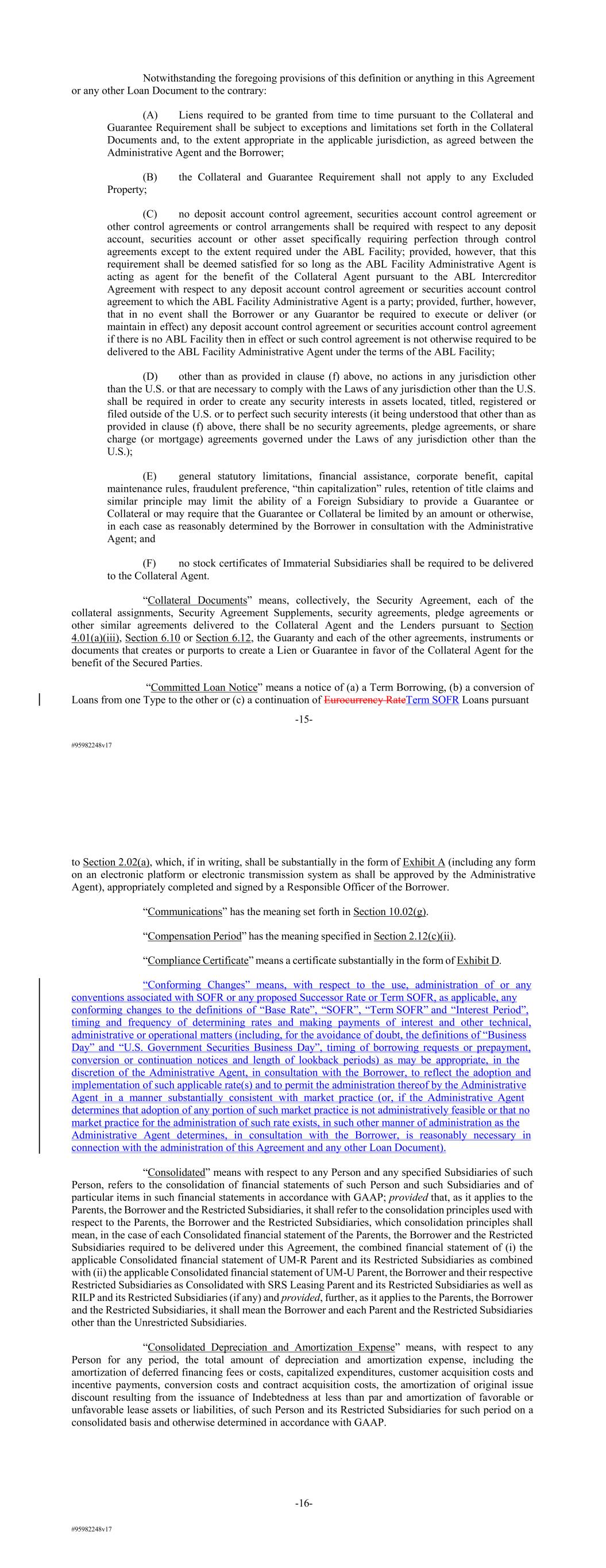 #95982248v17 Notwithstanding the foregoing provisions of this definition or anything in this Agreement or any other Loan Document to the contrary: (A) Liens required to be granted from time to time pursuant to the Collateral and Guarantee Requirement shall be subject to exceptions and limitations set forth in the Collateral Documents and, to the extent appropriate in the applicable jurisdiction, as agreed between the Administrative Agent and the Borrower; (B) the Collateral and Guarantee Requirement shall not apply to any Excluded Property; (C) no deposit account control agreement, securities account control agreement or other control agreements or control arrangements shall be required with respect to any deposit account, securities account or other asset specifically requiring perfection through control agreements except to the extent required under the ABL Facility; provided, however, that this requirement shall be deemed satisfied for so long as the ABL Facility Administrative Agent is acting as agent for the benefit of the Collateral Agent pursuant to the ABL Intercreditor Agreement with respect to any deposit account control agreement or securities account control agreement to which the ABL Facility Administrative Agent is a party; provided, further, however, that in no event shall the Borrower or any Guarantor be required to execute or deliver (or maintain in effect) any deposit account control agreement or securities account control agreement if there is no ABL Facility then in effect or such control agreement is not otherwise required to be delivered to the ABL Facility Administrative Agent under the terms of the ABL Facility; (D) other than as provided in clause (f) above, no actions in any jurisdiction other than the U.S. or that are necessary to comply with the Laws of any jurisdiction other than the U.S. shall be required in order to create any security interests in assets located, titled, registered or filed outside of the U.S. or to perfect such security interests (it being understood that other than as provided in clause (f) above, there shall be no security agreements, pledge agreements, or share charge (or mortgage) agreements governed under the Laws of any jurisdiction other than the U.S.); (E) general statutory limitations, financial assistance, corporate benefit, capital maintenance rules, fraudulent preference, “thin capitalization” rules, retention of title claims and similar principle may limit the ability of a Foreign Subsidiary to provide a Guarantee or Collateral or may require that the Guarantee or Collateral be limited by an amount or otherwise, in each case as reasonably determined by the Borrower in consultation with the Administrative Agent; and (F) no stock certificates of Immaterial Subsidiaries shall be required to be delivered to the Collateral Agent. “Collateral Documents” means, collectively, the Security Agreement, each of the collateral assignments, Security Agreement Supplements, security agreements, pledge agreements or other similar agreements delivered to the Collateral Agent and the Lenders pursuant to Section 4.01(a)(iii), Section 6.10 or Section 6.12, the Guaranty and each of the other agreements, instruments or documents that creates or purports to create a Lien or Guarantee in favor of the Collateral Agent for the benefit of the Secured Parties. “Committed Loan Notice” means a notice of (a) a Term Borrowing, (b) a conversion of Loans from one Type to the other or (c) a continuation of Eurocurrency RateTerm SOFR Loans pursuant -15- #95982248v17 to Section 2.02(a), which, if in writing, shall be substantially in the form of Exhibit A (including any form on an electronic platform or electronic transmission system as shall be approved by the Administrative Agent), appropriately completed and signed by a Responsible Officer of the Borrower. “Communications” has the meaning set forth in Section 10.02(g). “Compensation Period” has the meaning specified in Section 2.12(c)(ii). “Compliance Certificate” means a certificate substantially in the form of Exhibit D. “Conforming Changes” means, with respect to the use, administration of or any conventions associated with SOFR or any proposed Successor Rate or Term SOFR, as applicable, any conforming changes to the definitions of “Base Rate”, “SOFR”, “Term SOFR” and “Interest Period”, timing and frequency of determining rates and making payments of interest and other technical, administrative or operational matters (including, for the avoidance of doubt, the definitions of “Business Day” and “U.S. Government Securities Business Day”, timing of borrowing requests or prepayment, conversion or continuation notices and length of lookback periods) as may be appropriate, in the discretion of the Administrative Agent, in consultation with the Borrower, to reflect the adoption and implementation of such applicable rate(s) and to permit the administration thereof by the Administrative Agent in a manner substantially consistent with market practice (or, if the Administrative Agent determines that adoption of any portion of such market practice is not administratively feasible or that no market practice for the administration of such rate exists, in such other manner of administration as the Administrative Agent determines, in consultation with the Borrower, is reasonably necessary in connection with the administration of this Agreement and any other Loan Document). “Consolidated” means with respect to any Person and any specified Subsidiaries of such Person, refers to the consolidation of financial statements of such Person and such Subsidiaries and of particular items in such financial statements in accordance with GAAP; provided that, as it applies to the Parents, the Borrower and the Restricted Subsidiaries, it shall refer to the consolidation principles used with respect to the Parents, the Borrower and the Restricted Subsidiaries, which consolidation prin