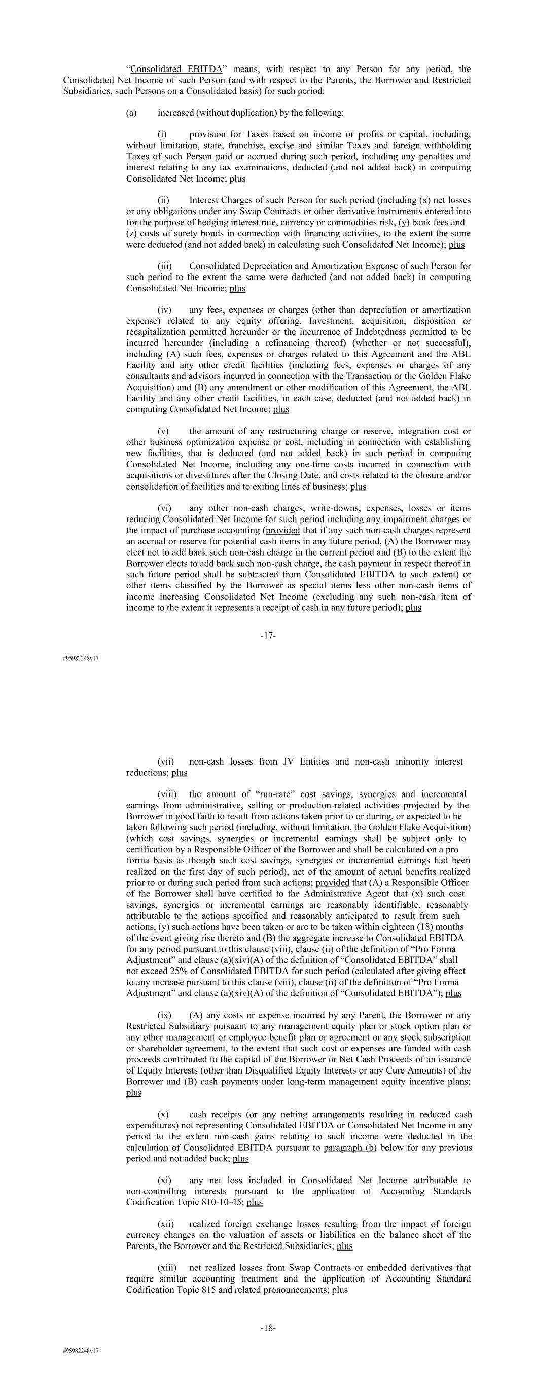 #95982248v17 “Consolidated EBITDA” means, with respect to any Person for any period, the Consolidated Net Income of such Person (and with respect to the Parents, the Borrower and Restricted Subsidiaries, such Persons on a Consolidated basis) for such period: (a) increased (without duplication) by the following: (i) provision for Taxes based on income or profits or capital, including, without limitation, state, franchise, excise and similar Taxes and foreign withholding Taxes of such Person paid or accrued during such period, including any penalties and interest relating to any tax examinations, deducted (and not added back) in computing Consolidated Net Income; plus (ii) Interest Charges of such Person for such period (including (x) net losses or any obligations under any Swap Contracts or other derivative instruments entered into for the purpose of hedging interest rate, currency or commodities risk, (y) bank fees and (z) costs of surety bonds in connection with financing activities, to the extent the same were deducted (and not added back) in calculating such Consolidated Net Income); plus (iii) Consolidated Depreciation and Amortization Expense of such Person for such period to the extent the same were deducted (and not added back) in computing Consolidated Net Income; plus (iv) any fees, expenses or charges (other than depreciation or amortization expense) related to any equity offering, Investment, acquisition, disposition or recapitalization permitted hereunder or the incurrence of Indebtedness permitted to be incurred hereunder (including a refinancing thereof) (whether or not successful), including (A) such fees, expenses or charges related to this Agreement and the ABL Facility and any other credit facilities (including fees, expenses or charges of any consultants and advisors incurred in connection with the Transaction or the Golden Flake Acquisition) and (B) any amendment or other modification of this Agreement, the ABL Facility and any other credit facilities, in each case, deducted (and not added back) in computing Consolidated Net Income; plus (v) the amount of any restructuring charge or reserve, integration cost or other business optimization expense or cost, including in connection with establishing new facilities, that is deducted (and not added back) in such period in computing Consolidated Net Income, including any one-time costs incurred in connection with acquisitions or divestitures after the Closing Date, and costs related to the closure and/or consolidation of facilities and to exiting lines of business; plus (vi) any other non-cash charges, write-downs, expenses, losses or items reducing Consolidated Net Income for such period including any impairment charges or the impact of purchase accounting (provided that if any such non-cash charges represent an accrual or reserve for potential cash items in any future period, (A) the Borrower may elect not to add back such non-cash charge in the current period and (B) to the extent the Borrower elects to add back such non-cash charge, the cash payment in respect thereof in such future period shall be subtracted from Consolidated EBITDA to such extent) or other items classified by the Borrower as special items less other non-cash items of income increasing Consolidated Net Income (excluding any such non-cash item of income to the extent it represents a receipt of cash in any future period); plus -17- #95982248v17 (vii) non-cash losses from JV Entities and non-cash minority interest reductions; plus (viii) the amount of “run-rate” cost savings, synergies and incremental earnings from administrative, selling or production-related activities projected by the Borrower in good faith to result from actions taken prior to or during, or expected to be taken following such period (including, without limitation, the Golden Flake Acquisition) (which cost savings, synergies or incremental earnings shall be subject only to certification by a Responsible Officer of the Borrower and shall be calculated on a pro forma basis as though such cost savings, synergies or incremental earnings had been realized on the first day of such period), net of the amount of actual benefits realized prior to or during such period from such actions; provided that (A) a Responsible Officer of the Borrower shall have certified to the Administrative Agent that (x) such cost savings, synergies or incremental earnings are reasonably identifiable, reasonably attributable to the actions specified and reasonably anticipated to result from such actions, (y) such actions have been taken or are to be taken within eighteen (18) months of the event giving rise thereto and (B) the aggregate increase to Consolidated EBITDA for any period pursuant to this clause (viii), clause (ii) of the definition of “Pro Forma Adjustment” and clause (a)(xiv)(A) of the definition of “Consolidated EBITDA” shall not exceed 25% of Consolidated EBITDA for such period (calculated after giving effect to any increase pursuant to this clause (viii), clause (ii) of the definition of “Pro Forma Adjustment” and clause (a)(xiv)(A) of the definition of “Consolidated EBITDA”); plus (ix) (A) any costs or expense incurred by any Parent, the Borrower or any Restricted Subsidiary pursuant to any management equity plan or stock option plan or any other management or employee benefit plan or agreement or any stock subscription or shareholder agreement, to the extent that such cost or expenses are funded with cash proceeds contributed to the capital of the Borrower or Net Cash Proceeds of an issuance of Equity Interests (other than Disqualified Equity Interests or any Cure Amounts) of the Borrower and (B) cash payments under long-term management equity incentive plans; plus (x) cash receipts (or any netting arrangements resulting in reduced cash expenditures) not representing Consolidated EBITDA or Consolidated Net Income in any period to the extent non-cash gains relating to such inc