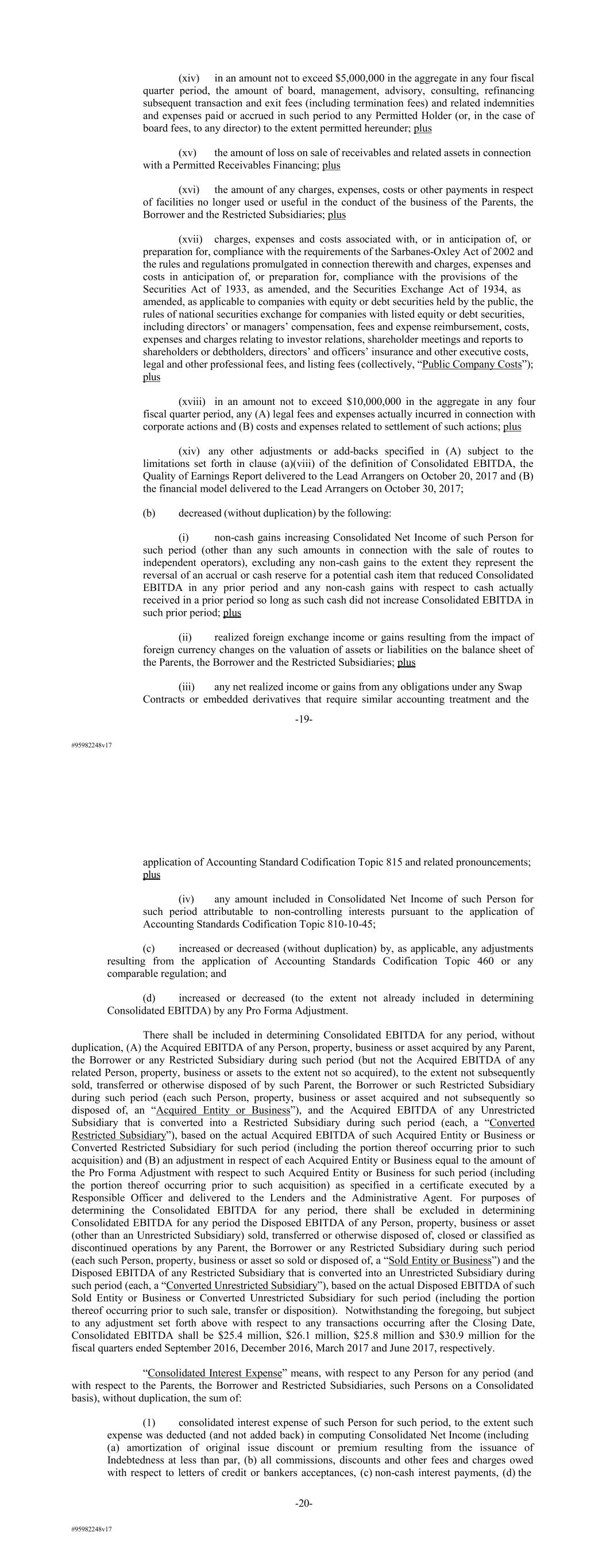 #95982248v17 (xiv) in an amount not to exceed $5,000,000 in the aggregate in any four fiscal quarter period, the amount of board, management, advisory, consulting, refinancing subsequent transaction and exit fees (including termination fees) and related indemnities and expenses paid or accrued in such period to any Permitted Holder (or, in the case of board fees, to any director) to the extent permitted hereunder; plus (xv) the amount of loss on sale of receivables and related assets in connection with a Permitted Receivables Financing; plus (xvi) the amount of any charges, expenses, costs or other payments in respect of facilities no longer used or useful in the conduct of the business of the Parents, the Borrower and the Restricted Subsidiaries; plus (xvii) charges, expenses and costs associated with, or in anticipation of, or preparation for, compliance with the requirements of the Sarbanes-Oxley Act of 2002 and the rules and regulations promulgated in connection therewith and charges, expenses and costs in anticipation of, or preparation for, compliance with the provisions of the Securities Act of 1933, as amended, and the Securities Exchange Act of 1934, as amended, as applicable to companies with equity or debt securities held by the public, the rules of national securities exchange for companies with listed equity or debt securities, including directors’ or managers’ compensation, fees and expense reimbursement, costs, expenses and charges relating to investor relations, shareholder meetings and reports to shareholders or debtholders, directors’ and officers’ insurance and other executive costs, legal and other professional fees, and listing fees (collectively, “Public Company Costs”); plus (xviii) in an amount not to exceed $10,000,000 in the aggregate in any four fiscal quarter period, any (A) legal fees and expenses actually incurred in connection with corporate actions and (B) costs and expenses related to settlement of such actions; plus (xiv) any other adjustments or add-backs specified in (A) subject to the limitations set forth in clause (a)(viii) of the definition of Consolidated EBITDA, the Quality of Earnings Report delivered to the Lead Arrangers on October 20, 2017 and (B) the financial model delivered to the Lead Arrangers on October 30, 2017; (b) decreased (without duplication) by the following: (i) non-cash gains increasing Consolidated Net Income of such Person for such period (other than any such amounts in connection with the sale of routes to independent operators), excluding any non-cash gains to the extent they represent the reversal of an accrual or cash reserve for a potential cash item that reduced Consolidated EBITDA in any prior period and any non-cash gains with respect to cash actually received in a prior period so long as such cash did not increase Consolidated EBITDA in such prior period; plus (ii) realized foreign exchange income or gains resulting from the impact of foreign currency changes on the valuation of assets or liabilities on the balance sheet of the Parents, the Borrower and the Restricted Subsidiaries; plus (iii) any net realized income or gains from any obligations under any Swap Contracts or embedded derivatives that require similar accounting treatment and the -19- #95982248v17 application of Accounting Standard Codification Topic 815 and related pronouncements; plus (iv) any amount included in Consolidated Net Income of such Person for such period attributable to non-controlling interests pursuant to the application of Accounting Standards Codification Topic 810-10-45; (c) increased or decreased (without duplication) by, as applicable, any adjustments resulting from the application of Accounting Standards Codification Topic 460 or any comparable regulation; and (d) increased or decreased (to the extent not already included in determining Consolidated EBITDA) by any Pro Forma Adjustment. There shall be included in determining Consolidated EBITDA for any period, without duplication, (A) the Acquired EBITDA of any Person, property, business or asset acquired by any Parent, the Borrower or any Restricted Subsidiary during such period (but not the Acquired EBITDA of any related Person, property, business or assets to the extent not so acquired), to the extent not subsequently sold, transferred or otherwise disposed of by such Parent, the Borrower or such Restricted Subsidiary during such period (each such Person, property, business or asset acquired and not subsequently so disposed of, an “Acquired Entity or Business”), and the Acquired EBITDA of any Unrestricted Subsidiary that is converted into a Restricted Subsidiary during such period (each, a “Converted Restricted Subsidiary”), based on the actual Acquired EBITDA of such Acquired Entity or Business or Converted Restricted Subsidiary for such period (including the portion thereof occurring prior to such acquisition) and (B) an adjustment in respect of each Acquired Entity or Business equal to the amount of the Pro Forma Adjustment with respect to such Acquired Entity or Business for such period (including the portion thereof occurring prior to such acquisition) as specified in a certificate executed by a Responsible Officer and delivered to the Lenders and the Administrative Agent. For purposes of determining the Consolidated EBITDA for any period, there shall be excluded in determining Consolidated EBITDA for any period the Disposed EBITDA of any Person, property, business or asset (other than an Unrestricted Subsidiary) sold, transferred or otherwise disposed of, closed or classified as discontinued operations by any Parent, the Borrower or any Restricted Subsidiary during such period (each such Person, property, business or asset so sold or disposed of, a “Sold Entity or Business”) and the Disposed EBITDA of any Restricted Subsidiary that is converted into an Unrestricted Subsidiary during such period (each, a “Converted Unrestricted Subsidiary”), based 