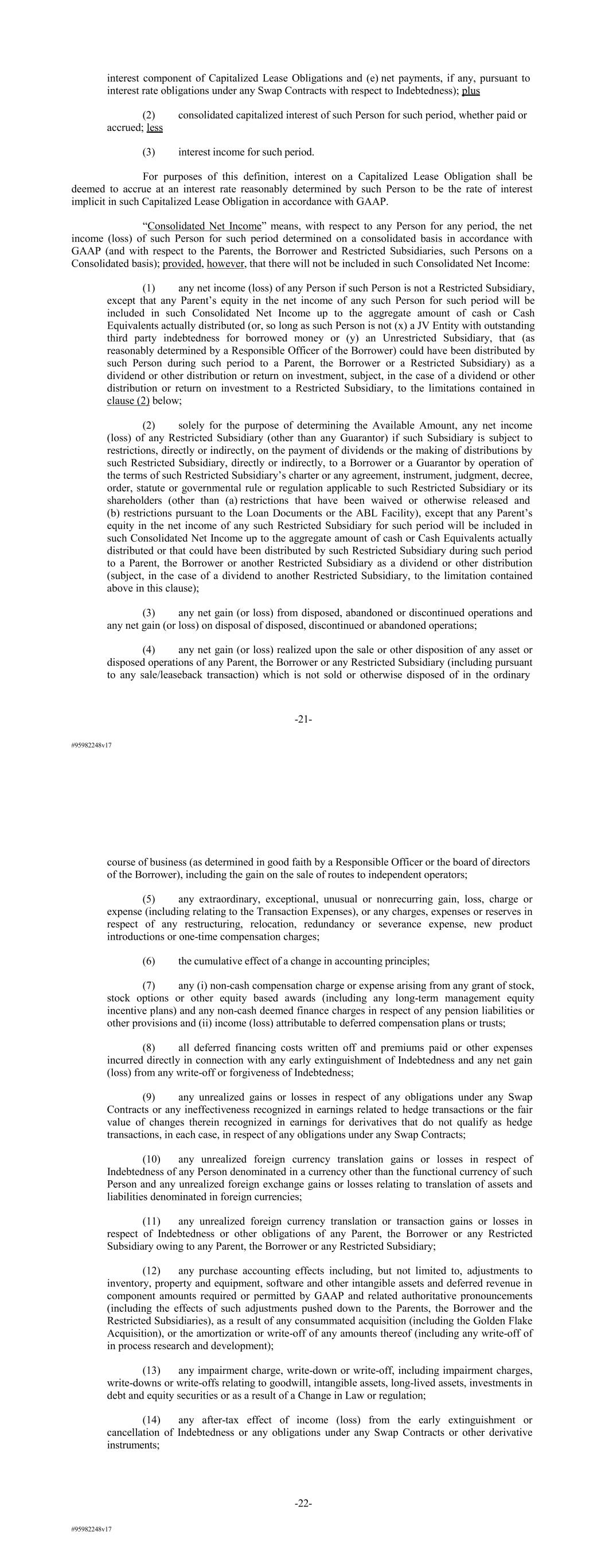 #95982248v17 interest component of Capitalized Lease Obligations and (e) net payments, if any, pursuant to interest rate obligations under any Swap Contracts with respect to Indebtedness); plus (2) consolidated capitalized interest of such Person for such period, whether paid or accrued; less (3) interest income for such period. For purposes of this definition, interest on a Capitalized Lease Obligation shall be deemed to accrue at an interest rate reasonably determined by such Person to be the rate of interest implicit in such Capitalized Lease Obligation in accordance with GAAP. “Consolidated Net Income” means, with respect to any Person for any period, the net income (loss) of such Person for such period determined on a consolidated basis in accordance with GAAP (and with respect to the Parents, the Borrower and Restricted Subsidiaries, such Persons on a Consolidated basis); provided, however, that there will not be included in such Consolidated Net Income: (1) any net income (loss) of any Person if such Person is not a Restricted Subsidiary, except that any Parent’s equity in the net income of any such Person for such period will be included in such Consolidated Net Income up to the aggregate amount of cash or Cash Equivalents actually distributed (or, so long as such Person is not (x) a JV Entity with outstanding third party indebtedness for borrowed money or (y) an Unrestricted Subsidiary, that (as reasonably determined by a Responsible Officer of the Borrower) could have been distributed by such Person during such period to a Parent, the Borrower or a Restricted Subsidiary) as a dividend or other distribution or return on investment, subject, in the case of a dividend or other distribution or return on investment to a Restricted Subsidiary, to the limitations contained in clause (2) below; (2) solely for the purpose of determining the Available Amount, any net income (loss) of any Restricted Subsidiary (other than any Guarantor) if such Subsidiary is subject to restrictions, directly or indirectly, on the payment of dividends or the making of distributions by such Restricted Subsidiary, directly or indirectly, to a Borrower or a Guarantor by operation of the terms of such Restricted Subsidiary’s charter or any agreement, instrument, judgment, decree, order, statute or governmental rule or regulation applicable to such Restricted Subsidiary or its shareholders (other than (a) restrictions that have been waived or otherwise released and (b) restrictions pursuant to the Loan Documents or the ABL Facility), except that any Parent’s equity in the net income of any such Restricted Subsidiary for such period will be included in such Consolidated Net Income up to the aggregate amount of cash or Cash Equivalents actually distributed or that could have been distributed by such Restricted Subsidiary during such period to a Parent, the Borrower or another Restricted Subsidiary as a dividend or other distribution (subject, in the case of a dividend to another Restricted Subsidiary, to the limitation contained above in this clause); (3) any net gain (or loss) from disposed, abandoned or discontinued operations and any net gain (or loss) on disposal of disposed, discontinued or abandoned operations; (4) any net gain (or loss) realized upon the sale or other disposition of any asset or disposed operations of any Parent, the Borrower or any Restricted Subsidiary (including pursuant to any sale/leaseback transaction) which is not sold or otherwise disposed of in the ordinary -21- #95982248v17 course of business (as determined in good faith by a Responsible Officer or the board of directors of the Borrower), including the gain on the sale of routes to independent operators; (5) any extraordinary, exceptional, unusual or nonrecurring gain, loss, charge or expense (including relating to the Transaction Expenses), or any charges, expenses or reserves in respect of any restructuring, relocation, redundancy or severance expense, new product introductions or one-time compensation charges; (6) the cumulative effect of a change in accounting principles; (7) any (i) non-cash compensation charge or expense arising from any grant of stock, stock options or other equity based awards (including any long-term management equity incentive plans) and any non-cash deemed finance charges in respect of any pension liabilities or other provisions and (ii) income (loss) attributable to deferred compensation plans or trusts; (8) all deferred financing costs written off and premiums paid or other expenses incurred directly in connection with any early extinguishment of Indebtedness and any net gain (loss) from any write-off or forgiveness of Indebtedness; (9) any unrealized gains or losses in respect of any obligations under any Swap Contracts or any ineffectiveness recognized in earnings related to hedge transactions or the fair value of changes therein recognized in earnings for derivatives that do not qualify as hedge transactions, in each case, in respect of any obligations under any Swap Contracts; (10) any unrealized foreign currency translation gains or losses in respect of Indebtedness of any Person denominated in a currency other than the functional currency of such Person and any unrealized foreign exchange gains or losses relating to translation of assets and liabilities denominated in foreign currencies; (11) any unrealized foreign currency translation or transaction gains or losses in respect of Indebtedness or other obligations of any Parent, the Borrower or any Restricted Subsidiary owing to any Parent, the Borrower or any Restricted Subsidiary; (12) any purchase accounting effects including, but not limited to, adjustments to inventory, property and equipment, software and other intangible assets and deferred revenue in component amounts required or permitted by GAAP and related authoritative pronouncements (including the effects of such adjustments pushed down to the Parents, the Borrower and the