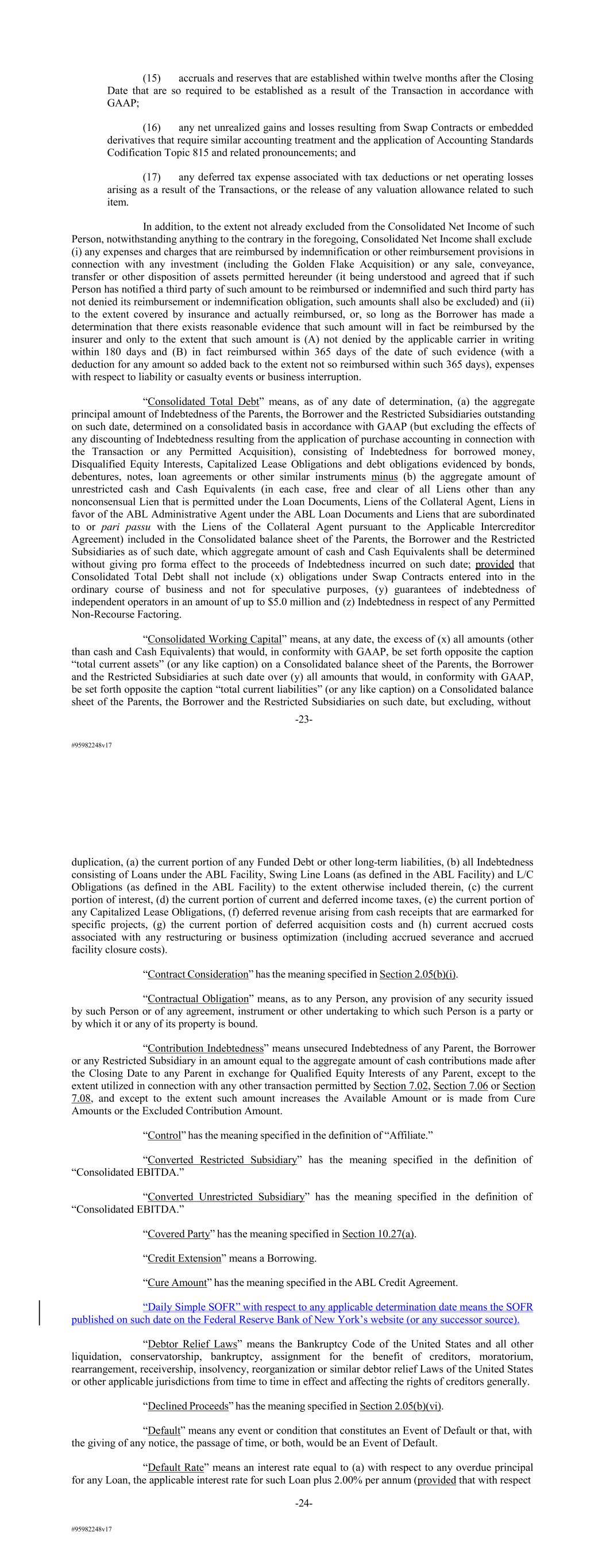 #95982248v17 (15) accruals and reserves that are established within twelve months after the Closing Date that are so required to be established as a result of the Transaction in accordance with GAAP; (16) any net unrealized gains and losses resulting from Swap Contracts or embedded derivatives that require similar accounting treatment and the application of Accounting Standards Codification Topic 815 and related pronouncements; and (17) any deferred tax expense associated with tax deductions or net operating losses arising as a result of the Transactions, or the release of any valuation allowance related to such item. In addition, to the extent not already excluded from the Consolidated Net Income of such Person, notwithstanding anything to the contrary in the foregoing, Consolidated Net Income shall exclude (i) any expenses and charges that are reimbursed by indemnification or other reimbursement provisions in connection with any investment (including the Golden Flake Acquisition) or any sale, conveyance, transfer or other disposition of assets permitted hereunder (it being understood and agreed that if such Person has notified a third party of such amount to be reimbursed or indemnified and such third party has not denied its reimbursement or indemnification obligation, such amounts shall also be excluded) and (ii) to the extent covered by insurance and actually reimbursed, or, so long as the Borrower has made a determination that there exists reasonable evidence that such amount will in fact be reimbursed by the insurer and only to the extent that such amount is (A) not denied by the applicable carrier in writing within 180 days and (B) in fact reimbursed within 365 days of the date of such evidence (with a deduction for any amount so added back to the extent not so reimbursed within such 365 days), expenses with respect to liability or casualty events or business interruption. “Consolidated Total Debt” means, as of any date of determination, (a) the aggregate principal amount of Indebtedness of the Parents, the Borrower and the Restricted Subsidiaries outstanding on such date, determined on a consolidated basis in accordance with GAAP (but excluding the effects of any discounting of Indebtedness resulting from the application of purchase accounting in connection with the Transaction or any Permitted Acquisition), consisting of Indebtedness for borrowed money, Disqualified Equity Interests, Capitalized Lease Obligations and debt obligations evidenced by bonds, debentures, notes, loan agreements or other similar instruments minus (b) the aggregate amount of unrestricted cash and Cash Equivalents (in each case, free and clear of all Liens other than any nonconsensual Lien that is permitted under the Loan Documents, Liens of the Collateral Agent, Liens in favor of the ABL Administrative Agent under the ABL Loan Documents and Liens that are subordinated to or pari passu with the Liens of the Collateral Agent pursuant to the Applicable Intercreditor Agreement) included in the Consolidated balance sheet of the Parents, the Borrower and the Restricted Subsidiaries as of such date, which aggregate amount of cash and Cash Equivalents shall be determined without giving pro forma effect to the proceeds of Indebtedness incurred on such date; provided that Consolidated Total Debt shall not include (x) obligations under Swap Contracts entered into in the ordinary course of business and not for speculative purposes, (y) guarantees of indebtedness of independent operators in an amount of up to $5.0 million and (z) Indebtedness in respect of any Permitted Non-Recourse Factoring. “Consolidated Working Capital” means, at any date, the excess of (x) all amounts (other than cash and Cash Equivalents) that would, in conformity with GAAP, be set forth opposite the caption “total current assets” (or any like caption) on a Consolidated balance sheet of the Parents, the Borrower and the Restricted Subsidiaries at such date over (y) all amounts that would, in conformity with GAAP, be set forth opposite the caption “total current liabilities” (or any like caption) on a Consolidated balance sheet of the Parents, the Borrower and the Restricted Subsidiaries on such date, but excluding, without -23- #95982248v17 duplication, (a) the current portion of any Funded Debt or other long-term liabilities, (b) all Indebtedness consisting of Loans under the ABL Facility, Swing Line Loans (as defined in the ABL Facility) and L/C Obligations (as defined in the ABL Facility) to the extent otherwise included therein, (c) the current portion of interest, (d) the current portion of current and deferred income taxes, (e) the current portion of any Capitalized Lease Obligations, (f) deferred revenue arising from cash receipts that are earmarked for specific projects, (g) the current portion of deferred acquisition costs and (h) current accrued costs associated with any restructuring or business optimization (including accrued severance and accrued facility closure costs). “Contract Consideration” has the meaning specified in Section 2.05(b)(i). “Contractual Obligation” means, as to any Person, any provision of any security issued by such Person or of any agreement, instrument or other undertaking to which such Person is a party or by which it or any of its property is bound. “Contribution Indebtedness” means unsecured Indebtedness of any Parent, the Borrower or any Restricted Subsidiary in an amount equal to the aggregate amount of cash contributions made after the Closing Date to any Parent in exchange for Qualified Equity Interests of any Parent, except to the extent utilized in connection with any other transaction permitted by Section 7.02, Section 7.06 or Section 7.08, and except to the extent such amount increases the Available Amount or is made from Cure Amounts or the Excluded Contribution Amount. “Control” has the meaning specified in the definition of “Affiliate.” “Converted Restricte