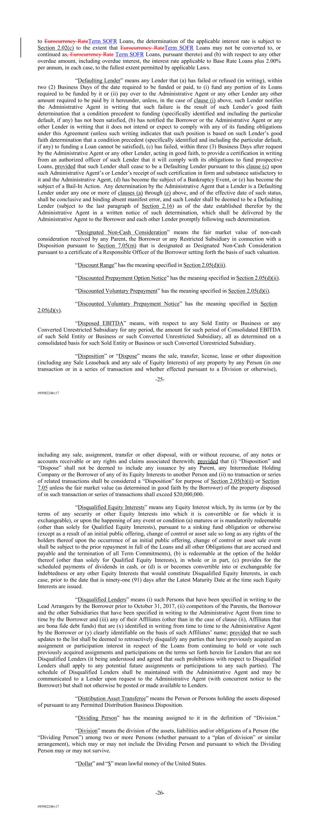 #95982248v17 to Eurocurrency RateTerm SOFR Loans, the determination of the applicable interest rate is subject to Section 2.02(c) to the extent that Eurocurrency RateTerm SOFR Loans may not be converted to, or continued as, Eurocurrency Rate Term SOFR Loans, pursuant thereto) and (b) with respect to any other overdue amount, including overdue interest, the interest rate applicable to Base Rate Loans plus 2.00% per annum, in each case, to the fullest extent permitted by applicable Laws. “Defaulting Lender” means any Lender that (a) has failed or refused (in writing), within two (2) Business Days of the date required to be funded or paid, to (i) fund any portion of its Loans required to be funded by it or (ii) pay over to the Administrative Agent or any other Lender any other amount required to be paid by it hereunder, unless, in the case of clause (i) above, such Lender notifies the Administrative Agent in writing that such failure is the result of such Lender’s good faith determination that a condition precedent to funding (specifically identified and including the particular default, if any) has not been satisfied, (b) has notified the Borrower or the Administrative Agent or any other Lender in writing that it does not intend or expect to comply with any of its funding obligations under this Agreement (unless such writing indicates that such position is based on such Lender’s good faith determination that a condition precedent (specifically identified and including the particular default, if any) to funding a Loan cannot be satisfied), (c) has failed, within three (3) Business Days after request by the Administrative Agent or any other Lender, acting in good faith, to provide a certification in writing from an authorized officer of such Lender that it will comply with its obligations to fund prospective Loans, provided that such Lender shall cease to be a Defaulting Lender pursuant to this clause (c) upon such Administrative Agent’s or Lender’s receipt of such certification in form and substance satisfactory to it and the Administrative Agent, (d) has become the subject of a Bankruptcy Event, or (e) has become the subject of a Bail-In Action. Any determination by the Administrative Agent that a Lender is a Defaulting Lender under any one or more of clauses (a) through (e) above, and of the effective date of such status, shall be conclusive and binding absent manifest error, and such Lender shall be deemed to be a Defaulting Lender (subject to the last paragraph of Section 2.16) as of the date established therefor by the Administrative Agent in a written notice of such determination, which shall be delivered by the Administrative Agent to the Borrower and each other Lender promptly following such determination. “Designated Non-Cash Consideration” means the fair market value of non-cash consideration received by any Parent, the Borrower or any Restricted Subsidiary in connection with a Disposition pursuant to Section 7.05(m) that is designated as Designated Non-Cash Consideration pursuant to a certificate of a Responsible Officer of the Borrower setting forth the basis of such valuation. “Discount Range” has the meaning specified in Section 2.05(d)(ii). “Discounted Prepayment Option Notice” has the meaning specified in Section 2.05(d)(ii). “Discounted Voluntary Prepayment” has the meaning specified in Section 2.05(d)(i). “Discounted Voluntary Prepayment Notice” has the meaning specified in Section 2.05(d)(v). “Disposed EBITDA” means, with respect to any Sold Entity or Business or any Converted Unrestricted Subsidiary for any period, the amount for such period of Consolidated EBITDA of such Sold Entity or Business or such Converted Unrestricted Subsidiary, all as determined on a consolidated basis for such Sold Entity or Business or such Converted Unrestricted Subsidiary. “Disposition” or “Dispose” means the sale, transfer, license, lease or other disposition (including any Sale Leaseback and any sale of Equity Interests) of any property by any Person (in one transaction or in a series of transaction and whether effected pursuant to a Division or otherwise), -25- #95982248v17 including any sale, assignment, transfer or other disposal, with or without recourse, of any notes or accounts receivable or any rights and claims associated therewith; provided that (i) “Disposition” and “Dispose” shall not be deemed to include any issuance by any Parent, any Intermediate Holding Company or the Borrower of any of its Equity Interests to another Person and (ii) no transaction or series of related transactions shall be considered a “Disposition” for purpose of Section 2.05(b)(ii) or Section 7.05 unless the fair market value (as determined in good faith by the Borrower) of the property disposed of in such transaction or series of transactions shall exceed $20,000,000. “Disqualified Equity Interests” means any Equity Interest which, by its terms (or by the terms of any security or other Equity Interests into which it is convertible or for which it is exchangeable), or upon the happening of any event or condition (a) matures or is mandatorily redeemable (other than solely for Qualified Equity Interests), pursuant to a sinking fund obligation or otherwise (except as a result of an initial public offering, change of control or asset sale so long as any rights of the holders thereof upon the occurrence of an initial public offering, change of control or asset sale event shall be subject to the prior repayment in full of the Loans and all other Obligations that are accrued and payable and the termination of all Term Commitments), (b) is redeemable at the option of the holder thereof (other than solely for Qualified Equity Interests), in whole or in part, (c) provides for the scheduled payments of dividends in cash, or (d) is or becomes convertible into or exchangeable for Indebtedness or any other Equity Interests that would constitute Disqualified E