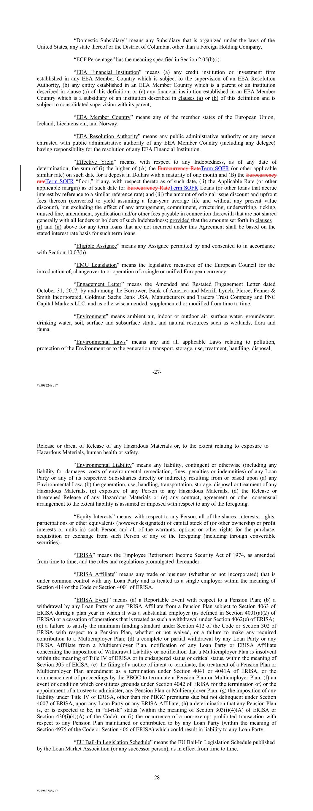#95982248v17 “Domestic Subsidiary” means any Subsidiary that is organized under the laws of the United States, any state thereof or the District of Columbia, other than a Foreign Holding Company. “ECF Percentage” has the meaning specified in Section 2.05(b)(i). “EEA Financial Institution” means (a) any credit institution or investment firm established in any EEA Member Country which is subject to the supervision of an EEA Resolution Authority, (b) any entity established in an EEA Member Country which is a parent of an institution described in clause (a) of this definition, or (c) any financial institution established in an EEA Member Country which is a subsidiary of an institution described in clauses (a) or (b) of this definition and is subject to consolidated supervision with its parent; “EEA Member Country” means any of the member states of the European Union, Iceland, Liechtenstein, and Norway. “EEA Resolution Authority” means any public administrative authority or any person entrusted with public administrative authority of any EEA Member Country (including any delegee) having responsibility for the resolution of any EEA Financial Institution. “Effective Yield” means, with respect to any Indebtedness, as of any date of determination, the sum of (i) the higher of (A) the Eurocurrency RateTerm SOFR (or other applicable similar rate) on such date for a deposit in Dollars with a maturity of one month and (B) the Eurocurrency rateTerm SOFR “floor,” if any, with respect thereto as of such date, (ii) the Applicable Rate (or other applicable margin) as of such date for Eurocurrency RateTerm SOFR Loans (or other loans that accrue interest by reference to a similar reference rate) and (iii) the amount of original issue discount and upfront fees thereon (converted to yield assuming a four-year average life and without any present value discount), but excluding the effect of any arrangement, commitment, structuring, underwriting, ticking, unused line, amendment, syndication and/or other fees payable in connection therewith that are not shared generally with all lenders or holders of such Indebtedness; provided that the amounts set forth in clauses (i) and (ii) above for any term loans that are not incurred under this Agreement shall be based on the stated interest rate basis for such term loans. “Eligible Assignee” means any Assignee permitted by and consented to in accordance with Section 10.07(b). “EMU Legislation” means the legislative measures of the European Council for the introduction of, changeover to or operation of a single or unified European currency. “Engagement Letter” means the Amended and Restated Engagement Letter dated October 31, 2017, by and among the Borrower, Bank of America and Merrill Lynch, Pierce, Fenner & Smith Incorporated, Goldman Sachs Bank USA, Manufacturers and Traders Trust Company and PNC Capital Markets LLC, and as otherwise amended, supplemented or modified from time to time. “Environment” means ambient air, indoor or outdoor air, surface water, groundwater, drinking water, soil, surface and subsurface strata, and natural resources such as wetlands, flora and fauna. “Environmental Laws” means any and all applicable Laws relating to pollution, protection of the Environment or to the generation, transport, storage, use, treatment, handling, disposal, -27- #95982248v17 Release or threat of Release of any Hazardous Materials or, to the extent relating to exposure to Hazardous Materials, human health or safety. “Environmental Liability” means any liability, contingent or otherwise (including any liability for damages, costs of environmental remediation, fines, penalties or indemnities) of any Loan Party or any of its respective Subsidiaries directly or indirectly resulting from or based upon (a) any Environmental Law, (b) the generation, use, handling, transportation, storage, disposal or treatment of any Hazardous Materials, (c) exposure of any Person to any Hazardous Materials, (d) the Release or threatened Release of any Hazardous Materials or (e) any contract, agreement or other consensual arrangement to the extent liability is assumed or imposed with respect to any of the foregoing. “Equity Interests” means, with respect to any Person, all of the shares, interests, rights, participations or other equivalents (however designated) of capital stock of (or other ownership or profit interests or units in) such Person and all of the warrants, options or other rights for the purchase, acquisition or exchange from such Person of any of the foregoing (including through convertible securities). “ERISA” means the Employee Retirement Income Security Act of 1974, as amended from time to time, and the rules and regulations promulgated thereunder. “ERISA Affiliate” means any trade or business (whether or not incorporated) that is under common control with any Loan Party and is treated as a single employer within the meaning of Section 414 of the Code or Section 4001 of ERISA. “ERISA Event” means (a) a Reportable Event with respect to a Pension Plan; (b) a withdrawal by any Loan Party or any ERISA Affiliate from a Pension Plan subject to Section 4063 of ERISA during a plan year in which it was a substantial employer (as defined in Section 4001(a)(2) of ERISA) or a cessation of operations that is treated as such a withdrawal under Section 4062(e) of ERISA; (c) a failure to satisfy the minimum funding standard under Section 412 of the Code or Section 302 of ERISA with respect to a Pension Plan, whether or not waived, or a failure to make any required contribution to a Multiemployer Plan; (d) a complete or partial withdrawal by any Loan Party or any ERISA Affiliate from a Multiemployer Plan, notification of any Loan Party or ERISA Affiliate concerning the imposition of Withdrawal Liability or notification that a Multiemployer Plan is insolvent within the meaning of Title IV of ERISA or in endangered status or c