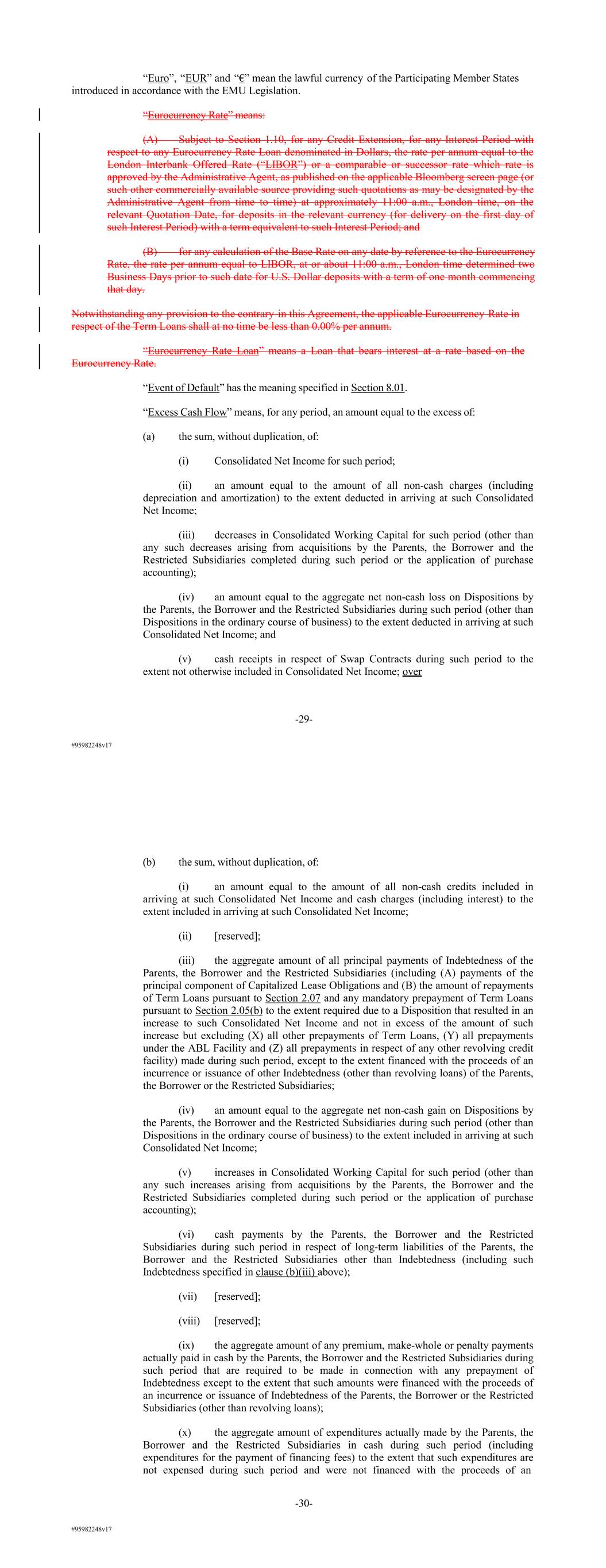#95982248v17 “Euro”, “EUR” and “€” mean the lawful currency of the Participating Member States introduced in accordance with the EMU Legislation. “Eurocurrency Rate” means: (A) Subject to Section 1.10, for any Credit Extension, for any Interest Period with respect to any Eurocurrency Rate Loan denominated in Dollars, the rate per annum equal to the London Interbank Offered Rate (“LIBOR”) or a comparable or successor rate which rate is approved by the Administrative Agent, as published on the applicable Bloomberg screen page (or such other commercially available source providing such quotations as may be designated by the Administrative Agent from time to time) at approximately 11:00 a.m., London time, on the relevant Quotation Date, for deposits in the relevant currency (for delivery on the first day of such Interest Period) with a term equivalent to such Interest Period; and (B) for any calculation of the Base Rate on any date by reference to the Eurocurrency Rate, the rate per annum equal to LIBOR, at or about 11:00 a.m., London time determined two Business Days prior to such date for U.S. Dollar deposits with a term of one month commencing that day. Notwithstanding any provision to the contrary in this Agreement, the applicable Eurocurrency Rate in respect of the Term Loans shall at no time be less than 0.00% per annum. “Eurocurrency Rate Loan” means a Loan that bears interest at a rate based on the Eurocurrency Rate. “Event of Default” has the meaning specified in Section 8.01. “Excess Cash Flow” means, for any period, an amount equal to the excess of: (a) the sum, without duplication, of: (i) Consolidated Net Income for such period; (ii) an amount equal to the amount of all non-cash charges (including depreciation and amortization) to the extent deducted in arriving at such Consolidated Net Income; (iii) decreases in Consolidated Working Capital for such period (other than any such decreases arising from acquisitions by the Parents, the Borrower and the Restricted Subsidiaries completed during such period or the application of purchase accounting); (iv) an amount equal to the aggregate net non-cash loss on Dispositions by the Parents, the Borrower and the Restricted Subsidiaries during such period (other than Dispositions in the ordinary course of business) to the extent deducted in arriving at such Consolidated Net Income; and (v) cash receipts in respect of Swap Contracts during such period to the extent not otherwise included in Consolidated Net Income; over -29- #95982248v17 (b) the sum, without duplication, of: (i) an amount equal to the amount of all non-cash credits included in arriving at such Consolidated Net Income and cash charges (including interest) to the extent included in arriving at such Consolidated Net Income; (ii) [reserved]; (iii) the aggregate amount of all principal payments of Indebtedness of the Parents, the Borrower and the Restricted Subsidiaries (including (A) payments of the principal component of Capitalized Lease Obligations and (B) the amount of repayments of Term Loans pursuant to Section 2.07 and any mandatory prepayment of Term Loans pursuant to Section 2.05(b) to the extent required due to a Disposition that resulted in an increase to such Consolidated Net Income and not in excess of the amount of such increase but excluding (X) all other prepayments of Term Loans, (Y) all prepayments under the ABL Facility and (Z) all prepayments in respect of any other revolving credit facility) made during such period, except to the extent financed with the proceeds of an incurrence or issuance of other Indebtedness (other than revolving loans) of the Parents, the Borrower or the Restricted Subsidiaries; (iv) an amount equal to the aggregate net non-cash gain on Dispositions by the Parents, the Borrower and the Restricted Subsidiaries during such period (other than Dispositions in the ordinary course of business) to the extent included in arriving at such Consolidated Net Income; (v) increases in Consolidated Working Capital for such period (other than any such increases arising from acquisitions by the Parents, the Borrower and the Restricted Subsidiaries completed during such period or the application of purchase accounting); (vi) cash payments by the Parents, the Borrower and the Restricted Subsidiaries during such period in respect of long-term liabilities of the Parents, the Borrower and the Restricted Subsidiaries other than Indebtedness (including such Indebtedness specified in clause (b)(iii) above); (vii) [reserved]; (viii) [reserved]; (ix) the aggregate amount of any premium, make-whole or penalty payments actually paid in cash by the Parents, the Borrower and the Restricted Subsidiaries during such period that are required to be made in connection with any prepayment of Indebtedness except to the extent that such amounts were financed with the proceeds of an incurrence or issuance of Indebtedness of the Parents, the Borrower or the Restricted Subsidiaries (other than revolving loans); (x) the aggregate amount of expenditures actually made by the Parents, the Borrower and the Restricted Subsidiaries in cash during such period (including expenditures for the payment of financing fees) to the extent that such expenditures are not expensed during such period and were not financed with the proceeds of an -30-
