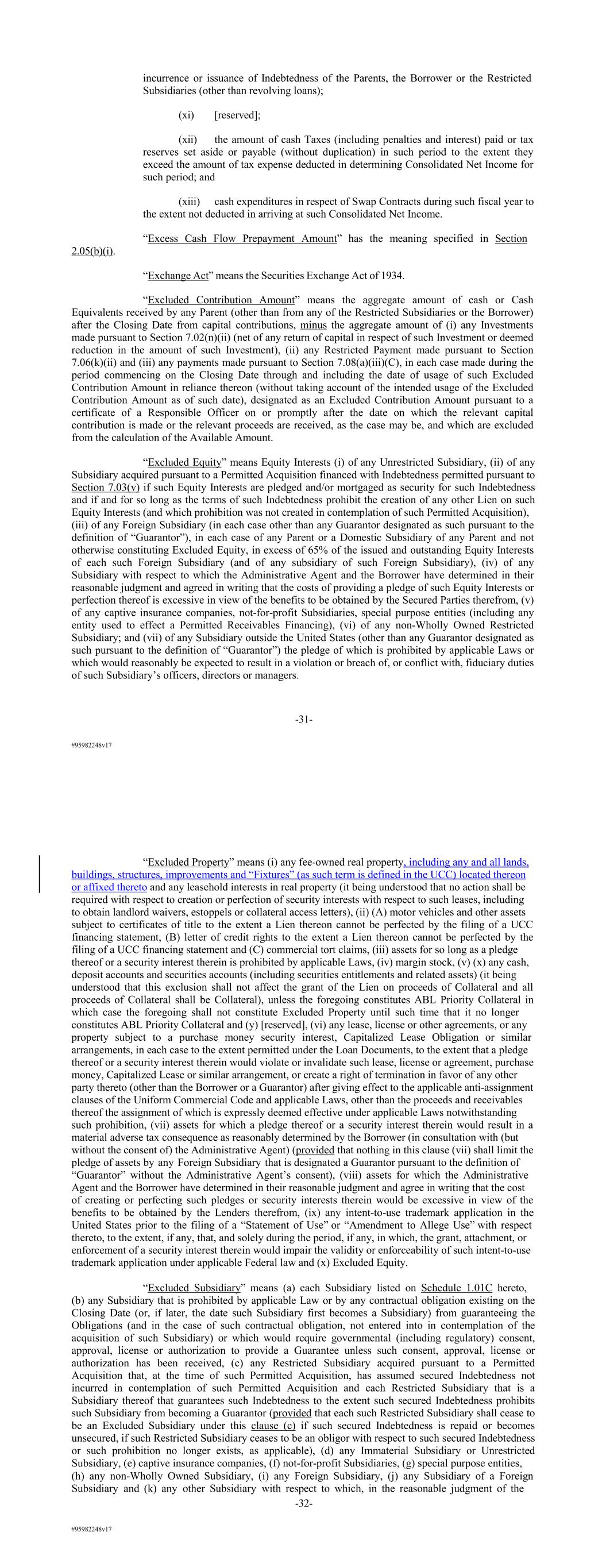 #95982248v17 incurrence or issuance of Indebtedness of the Parents, the Borrower or the Restricted Subsidiaries (other than revolving loans); (xi) [reserved]; (xii) the amount of cash Taxes (including penalties and interest) paid or tax reserves set aside or payable (without duplication) in such period to the extent they exceed the amount of tax expense deducted in determining Consolidated Net Income for such period; and (xiii) cash expenditures in respect of Swap Contracts during such fiscal year to the extent not deducted in arriving at such Consolidated Net Income. “Excess Cash Flow Prepayment Amount” has the meaning specified in Section 2.05(b)(i). “Exchange Act” means the Securities Exchange Act of 1934. “Excluded Contribution Amount” means the aggregate amount of cash or Cash Equivalents received by any Parent (other than from any of the Restricted Subsidiaries or the Borrower) after the Closing Date from capital contributions, minus the aggregate amount of (i) any Investments made pursuant to Section 7.02(n)(ii) (net of any return of capital in respect of such Investment or deemed reduction in the amount of such Investment), (ii) any Restricted Payment made pursuant to Section 7.06(k)(ii) and (iii) any payments made pursuant to Section 7.08(a)(iii)(C), in each case made during the period commencing on the Closing Date through and including the date of usage of such Excluded Contribution Amount in reliance thereon (without taking account of the intended usage of the Excluded Contribution Amount as of such date), designated as an Excluded Contribution Amount pursuant to a certificate of a Responsible Officer on or promptly after the date on which the relevant capital contribution is made or the relevant proceeds are received, as the case may be, and which are excluded from the calculation of the Available Amount. “Excluded Equity” means Equity Interests (i) of any Unrestricted Subsidiary, (ii) of any Subsidiary acquired pursuant to a Permitted Acquisition financed with Indebtedness permitted pursuant to Section 7.03(v) if such Equity Interests are pledged and/or mortgaged as security for such Indebtedness and if and for so long as the terms of such Indebtedness prohibit the creation of any other Lien on such Equity Interests (and which prohibition was not created in contemplation of such Permitted Acquisition), (iii) of any Foreign Subsidiary (in each case other than any Guarantor designated as such pursuant to the definition of “Guarantor”), in each case of any Parent or a Domestic Subsidiary of any Parent and not otherwise constituting Excluded Equity, in excess of 65% of the issued and outstanding Equity Interests of each such Foreign Subsidiary (and of any subsidiary of such Foreign Subsidiary), (iv) of any Subsidiary with respect to which the Administrative Agent and the Borrower have determined in their reasonable judgment and agreed in writing that the costs of providing a pledge of such Equity Interests or perfection thereof is excessive in view of the benefits to be obtained by the Secured Parties therefrom, (v) of any captive insurance companies, not-for-profit Subsidiaries, special purpose entities (including any entity used to effect a Permitted Receivables Financing), (vi) of any non-Wholly Owned Restricted Subsidiary; and (vii) of any Subsidiary outside the United States (other than any Guarantor designated as such pursuant to the definition of “Guarantor”) the pledge of which is prohibited by applicable Laws or which would reasonably be expected to result in a violation or breach of, or conflict with, fiduciary duties of such Subsidiary’s officers, directors or managers. -31- #95982248v17 “Excluded Property” means (i) any fee-owned real property, including any and all lands, buildings, structures, improvements and “Fixtures” (as such term is defined in the UCC) located thereon or affixed thereto and any leasehold interests in real property (it being understood that no action shall be required with respect to creation or perfection of security interests with respect to such leases, including to obtain landlord waivers, estoppels or collateral access letters), (ii) (A) motor vehicles and other assets subject to certificates of title to the extent a Lien thereon cannot be perfected by the filing of a UCC financing statement, (B) letter of credit rights to the extent a Lien thereon cannot be perfected by the filing of a UCC financing statement and (C) commercial tort claims, (iii) assets for so long as a pledge thereof or a security interest therein is prohibited by applicable Laws, (iv) margin stock, (v) (x) any cash, deposit accounts and securities accounts (including securities entitlements and related assets) (it being understood that this exclusion shall not affect the grant of the Lien on proceeds of Collateral and all proceeds of Collateral shall be Collateral), unless the foregoing constitutes ABL Priority Collateral in which case the foregoing shall not constitute Excluded Property until such time that it no longer constitutes ABL Priority Collateral and (y) [reserved], (vi) any lease, license or other agreements, or any property subject to a purchase money security interest, Capitalized Lease Obligation or similar arrangements, in each case to the extent permitted under the Loan Documents, to the extent that a pledge thereof or a security interest therein would violate or invalidate such lease, license or agreement, purchase money, Capitalized Lease or similar arrangement, or create a right of termination in favor of any other party thereto (other than the Borrower or a Guarantor) after giving effect to the applicable anti-assignment clauses of the Uniform Commercial Code and applicable Laws, other than the proceeds and receivables thereof the assignment of which is expressly deemed effective under applicable Laws notwithstanding such prohibition, (vii) assets for which a pledge thereof or a security interest therein would resul