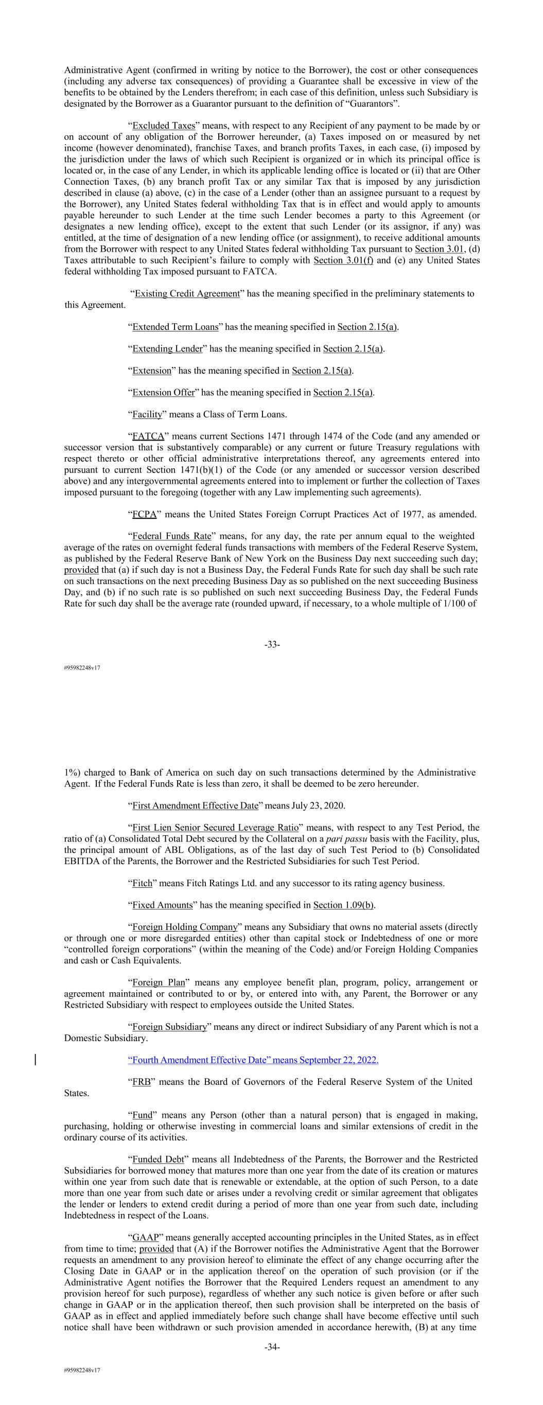 #95982248v17 Administrative Agent (confirmed in writing by notice to the Borrower), the cost or other consequences (including any adverse tax consequences) of providing a Guarantee shall be excessive in view of the benefits to be obtained by the Lenders therefrom; in each case of this definition, unless such Subsidiary is designated by the Borrower as a Guarantor pursuant to the definition of “Guarantors”. “Excluded Taxes” means, with respect to any Recipient of any payment to be made by or on account of any obligation of the Borrower hereunder, (a) Taxes imposed on or measured by net income (however denominated), franchise Taxes, and branch profits Taxes, in each case, (i) imposed by the jurisdiction under the laws of which such Recipient is organized or in which its principal office is located or, in the case of any Lender, in which its applicable lending office is located or (ii) that are Other Connection Taxes, (b) any branch profit Tax or any similar Tax that is imposed by any jurisdiction described in clause (a) above, (c) in the case of a Lender (other than an assignee pursuant to a request by the Borrower), any United States federal withholding Tax that is in effect and would apply to amounts payable hereunder to such Lender at the time such Lender becomes a party to this Agreement (or designates a new lending office), except to the extent that such Lender (or its assignor, if any) was entitled, at the time of designation of a new lending office (or assignment), to receive additional amounts from the Borrower with respect to any United States federal withholding Tax pursuant to Section 3.01, (d) Taxes attributable to such Recipient’s failure to comply with Section 3.01(f) and (e) any United States federal withholding Tax imposed pursuant to FATCA. “Existing Credit Agreement” has the meaning specified in the preliminary statements to this Agreement. “Extended Term Loans” has the meaning specified in Section 2.15(a). “Extending Lender” has the meaning specified in Section 2.15(a). “Extension” has the meaning specified in Section 2.15(a). “Extension Offer” has the meaning specified in Section 2.15(a). “Facility” means a Class of Term Loans. “FATCA” means current Sections 1471 through 1474 of the Code (and any amended or successor version that is substantively comparable) or any current or future Treasury regulations with respect thereto or other official administrative interpretations thereof, any agreements entered into pursuant to current Section 1471(b)(1) of the Code (or any amended or successor version described above) and any intergovernmental agreements entered into to implement or further the collection of Taxes imposed pursuant to the foregoing (together with any Law implementing such agreements). “FCPA” means the United States Foreign Corrupt Practices Act of 1977, as amended. “Federal Funds Rate” means, for any day, the rate per annum equal to the weighted average of the rates on overnight federal funds transactions with members of the Federal Reserve System, as published by the Federal Reserve Bank of New York on the Business Day next succeeding such day; provided that (a) if such day is not a Business Day, the Federal Funds Rate for such day shall be such rate on such transactions on the next preceding Business Day as so published on the next succeeding Business Day, and (b) if no such rate is so published on such next succeeding Business Day, the Federal Funds Rate for such day shall be the average rate (rounded upward, if necessary, to a whole multiple of 1/100 of -33- #95982248v17 1%) charged to Bank of America on such day on such transactions determined by the Administrative Agent. If the Federal Funds Rate is less than zero, it shall be deemed to be zero hereunder. “First Amendment Effective Date” means July 23, 2020. “First Lien Senior Secured Leverage Ratio” means, with respect to any Test Period, the ratio of (a) Consolidated Total Debt secured by the Collateral on a pari passu basis with the Facility, plus, the principal amount of ABL Obligations, as of the last day of such Test Period to (b) Consolidated EBITDA of the Parents, the Borrower and the Restricted Subsidiaries for such Test Period. “Fitch” means Fitch Ratings Ltd. and any successor to its rating agency business. “Fixed Amounts” has the meaning specified in Section 1.09(b). “Foreign Holding Company” means any Subsidiary that owns no material assets (directly or through one or more disregarded entities) other than capital stock or Indebtedness of one or more “controlled foreign corporations” (within the meaning of the Code) and/or Foreign Holding Companies and cash or Cash Equivalents. “Foreign Plan” means any employee benefit plan, program, policy, arrangement or agreement maintained or contributed to or by, or entered into with, any Parent, the Borrower or any Restricted Subsidiary with respect to employees outside the United States. “Foreign Subsidiary” means any direct or indirect Subsidiary of any Parent which is not a Domestic Subsidiary. “Fourth Amendment Effective Date” means September 22, 2022. “FRB” means the Board of Governors of the Federal Reserve System of the United States. “Fund” means any Person (other than a natural person) that is engaged in making, purchasing, holding or otherwise investing in commercial loans and similar extensions of credit in the ordinary course of its activities. “Funded Debt” means all Indebtedness of the Parents, the Borrower and the Restricted Subsidiaries for borrowed money that matures more than one year from the date of its creation or matures within one year from such date that is renewable or extendable, at the option of such Person, to a date more than one year from such date or arises under a revolving credit or similar agreement that obligates the lender or lenders to extend credit during a period of more than one year from such date, including Indebtedness 