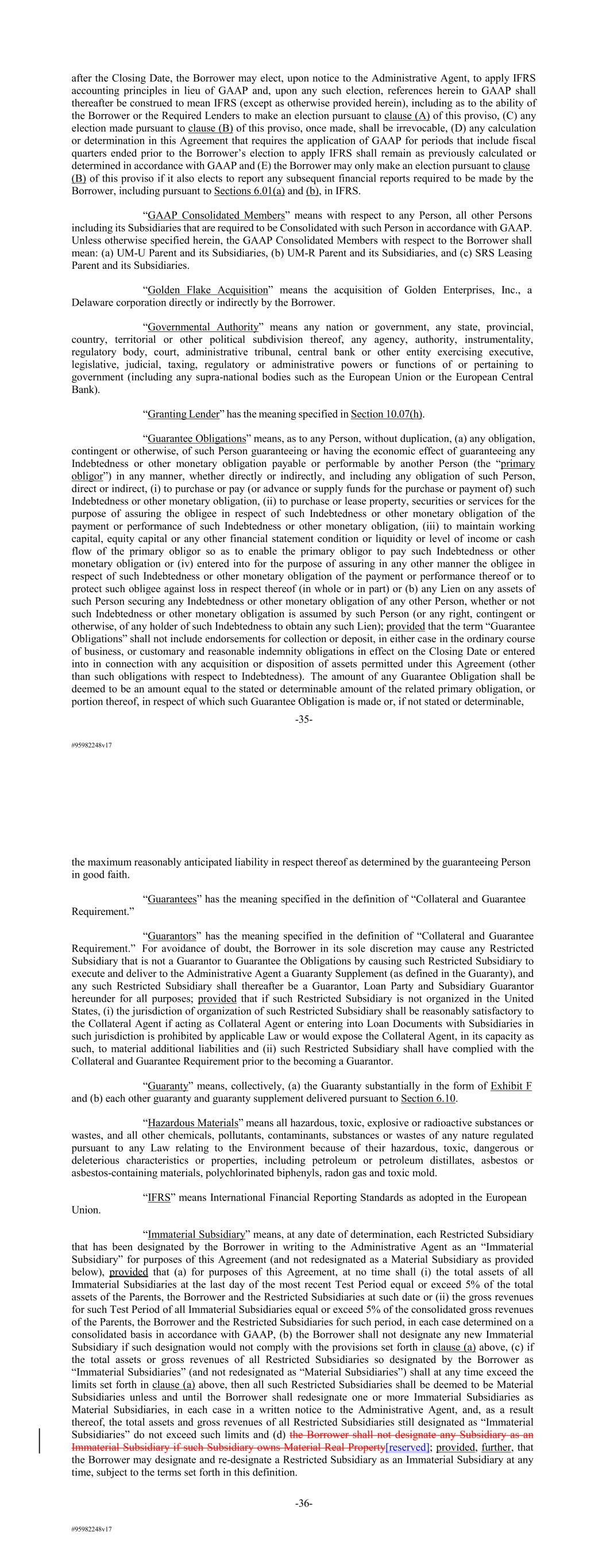 #95982248v17 after the Closing Date, the Borrower may elect, upon notice to the Administrative Agent, to apply IFRS accounting principles in lieu of GAAP and, upon any such election, references herein to GAAP shall thereafter be construed to mean IFRS (except as otherwise provided herein), including as to the ability of the Borrower or the Required Lenders to make an election pursuant to clause (A) of this proviso, (C) any election made pursuant to clause (B) of this proviso, once made, shall be irrevocable, (D) any calculation or determination in this Agreement that requires the application of GAAP for periods that include fiscal quarters ended prior to the Borrower’s election to apply IFRS shall remain as previously calculated or determined in accordance with GAAP and (E) the Borrower may only make an election pursuant to clause (B) of this proviso if it also elects to report any subsequent financial reports required to be made by the Borrower, including pursuant to Sections 6.01(a) and (b), in IFRS. “GAAP Consolidated Members” means with respect to any Person, all other Persons including its Subsidiaries that are required to be Consolidated with such Person in accordance with GAAP. Unless otherwise specified herein, the GAAP Consolidated Members with respect to the Borrower shall mean: (a) UM-U Parent and its Subsidiaries, (b) UM-R Parent and its Subsidiaries, and (c) SRS Leasing Parent and its Subsidiaries. “Golden Flake Acquisition” means the acquisition of Golden Enterprises, Inc., a Delaware corporation directly or indirectly by the Borrower. “Governmental Authority” means any nation or government, any state, provincial, country, territorial or other political subdivision thereof, any agency, authority, instrumentality, regulatory body, court, administrative tribunal, central bank or other entity exercising executive, legislative, judicial, taxing, regulatory or administrative powers or functions of or pertaining to government (including any supra-national bodies such as the European Union or the European Central Bank). “Granting Lender” has the meaning specified in Section 10.07(h). “Guarantee Obligations” means, as to any Person, without duplication, (a) any obligation, contingent or otherwise, of such Person guaranteeing or having the economic effect of guaranteeing any Indebtedness or other monetary obligation payable or performable by another Person (the “primary obligor”) in any manner, whether directly or indirectly, and including any obligation of such Person, direct or indirect, (i) to purchase or pay (or advance or supply funds for the purchase or payment of) such Indebtedness or other monetary obligation, (ii) to purchase or lease property, securities or services for the purpose of assuring the obligee in respect of such Indebtedness or other monetary obligation of the payment or performance of such Indebtedness or other monetary obligation, (iii) to maintain working capital, equity capital or any other financial statement condition or liquidity or level of income or cash flow of the primary obligor so as to enable the primary obligor to pay such Indebtedness or other monetary obligation or (iv) entered into for the purpose of assuring in any other manner the obligee in respect of such Indebtedness or other monetary obligation of the payment or performance thereof or to protect such obligee against loss in respect thereof (in whole or in part) or (b) any Lien on any assets of such Person securing any Indebtedness or other monetary obligation of any other Person, whether or not such Indebtedness or other monetary obligation is assumed by such Person (or any right, contingent or otherwise, of any holder of such Indebtedness to obtain any such Lien); provided that the term “Guarantee Obligations” shall not include endorsements for collection or deposit, in either case in the ordinary course of business, or customary and reasonable indemnity obligations in effect on the Closing Date or entered into in connection with any acquisition or disposition of assets permitted under this Agreement (other than such obligations with respect to Indebtedness). The amount of any Guarantee Obligation shall be deemed to be an amount equal to the stated or determinable amount of the related primary obligation, or portion thereof, in respect of which such Guarantee Obligation is made or, if not stated or determinable, -35- #95982248v17 the maximum reasonably anticipated liability in respect thereof as determined by the guaranteeing Person in good faith. “Guarantees” has the meaning specified in the definition of “Collateral and Guarantee Requirement.” “Guarantors” has the meaning specified in the definition of “Collateral and Guarantee Requirement.” For avoidance of doubt, the Borrower in its sole discretion may cause any Restricted Subsidiary that is not a Guarantor to Guarantee the Obligations by causing such Restricted Subsidiary to execute and deliver to the Administrative Agent a Guaranty Supplement (as defined in the Guaranty), and any such Restricted Subsidiary shall thereafter be a Guarantor, Loan Party and Subsidiary Guarantor hereunder for all purposes; provided that if such Restricted Subsidiary is not organized in the United States, (i) the jurisdiction of organization of such Restricted Subsidiary shall be reasonably satisfactory to the Collateral Agent if acting as Collateral Agent or entering into Loan Documents with Subsidiaries in such jurisdiction is prohibited by applicable Law or would expose the Collateral Agent, in its capacity as such, to material additional liabilities and (ii) such Restricted Subsidiary shall have complied with the Collateral and Guarantee Requirement prior to the becoming a Guarantor. “Guaranty” means, collectively, (a) the Guaranty substantially in the form of Exhibit F and (b) each other guaranty and guaranty supplement delivered pursuant to Section 6.10. “Hazardous Materials” means all hazardou