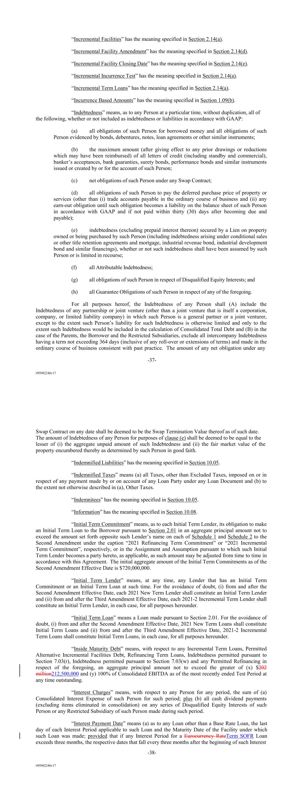 #95982248v17 “Incremental Facilities” has the meaning specified in Section 2.14(a). “Incremental Facility Amendment” has the meaning specified in Section 2.14(d). “Incremental Facility Closing Date” has the meaning specified in Section 2.14(e). “Incremental Incurrence Test” has the meaning specified in Section 2.14(a). “Incremental Term Loans” has the meaning specified in Section 2.14(a). “Incurrence Based Amounts” has the meaning specified in Section 1.09(b). “Indebtedness” means, as to any Person at a particular time, without duplication, all of the following, whether or not included as indebtedness or liabilities in accordance with GAAP: (a) all obligations of such Person for borrowed money and all obligations of such Person evidenced by bonds, debentures, notes, loan agreements or other similar instruments; (b) the maximum amount (after giving effect to any prior drawings or reductions which may have been reimbursed) of all letters of credit (including standby and commercial), banker’s acceptances, bank guaranties, surety bonds, performance bonds and similar instruments issued or created by or for the account of such Person; (c) net obligations of such Person under any Swap Contract; (d) all obligations of such Person to pay the deferred purchase price of property or services (other than (i) trade accounts payable in the ordinary course of business and (ii) any earn-out obligation until such obligation becomes a liability on the balance sheet of such Person in accordance with GAAP and if not paid within thirty (30) days after becoming due and payable); (e) indebtedness (excluding prepaid interest thereon) secured by a Lien on property owned or being purchased by such Person (including indebtedness arising under conditional sales or other title retention agreements and mortgage, industrial revenue bond, industrial development bond and similar financings), whether or not such indebtedness shall have been assumed by such Person or is limited in recourse; (f) all Attributable Indebtedness; (g) all obligations of such Person in respect of Disqualified Equity Interests; and (h) all Guarantee Obligations of such Person in respect of any of the foregoing. For all purposes hereof, the Indebtedness of any Person shall (A) include the Indebtedness of any partnership or joint venture (other than a joint venture that is itself a corporation, company, or limited liability company) in which such Person is a general partner or a joint venturer, except to the extent such Person’s liability for such Indebtedness is otherwise limited and only to the extent such Indebtedness would be included in the calculation of Consolidated Total Debt and (B) in the case of the Parents, the Borrower and the Restricted Subsidiaries, exclude all intercompany Indebtedness having a term not exceeding 364 days (inclusive of any roll-over or extensions of terms) and made in the ordinary course of business consistent with past practice. The amount of any net obligation under any -37- #95982248v17 Swap Contract on any date shall be deemed to be the Swap Termination Value thereof as of such date. The amount of Indebtedness of any Person for purposes of clause (e) shall be deemed to be equal to the lesser of (i) the aggregate unpaid amount of such Indebtedness and (ii) the fair market value of the property encumbered thereby as determined by such Person in good faith. “Indemnified Liabilities” has the meaning specified in Section 10.05. “Indemnified Taxes” means (a) all Taxes, other than Excluded Taxes, imposed on or in respect of any payment made by or on account of any Loan Party under any Loan Document and (b) to the extent not otherwise described in (a), Other Taxes. “Indemnitees” has the meaning specified in Section 10.05. “Information” has the meaning specified in Section 10.08. “Initial Term Commitment” means, as to each Initial Term Lender, its obligation to make an Initial Term Loan to the Borrower pursuant to Section 2.01 in an aggregate principal amount not to exceed the amount set forth opposite such Lender’s name on each of Schedule 1 and Schedule 2 to the Second Amendment under the caption “2021 Refinancing Term Commitment” or “2021 Incremental Term Commitment”, respectively, or in the Assignment and Assumption pursuant to which such Initial Term Lender becomes a party hereto, as applicable, as such amount may be adjusted from time to time in accordance with this Agreement. The initial aggregate amount of the Initial Term Commitments as of the Second Amendment Effective Date is $720,000,000. “Initial Term Lender” means, at any time, any Lender that has an Initial Term Commitment or an Initial Term Loan at such time. For the avoidance of doubt, (i) from and after the Second Amendment Effective Date, each 2021 New Term Lender shall constitute an Initial Term Lender and (ii) from and after the Third Amendment Effective Date, each 2021-2 Incremental Term Lender shall constitute an Initial Term Lender, in each case, for all purposes hereunder. “Initial Term Loan” means a Loan made pursuant to Section 2.01. For the avoidance of doubt, (i) from and after the Second Amendment Effective Date, 2021 New Term Loans shall constitute Initial Term Loans and (ii) from and after the Third Amendment Effective Date, 2021-2 Incremental Term Loans shall constitute Initial Term Loans, in each case, for all purposes hereunder. “Inside Maturity Debt” means, with respect to any Incremental Term Loans, Permitted Alternative Incremental Facilities Debt, Refinancing Term Loans, Indebtedness permitted pursuant to Section 7.03(r), Indebtedness permitted pursuant to Section 7.03(w) and any Permitted Refinancing in respect of the foregoing, an aggregate principal amount not to exceed the greater of (x) $202 million212,500,000 and (y) 100% of Consolidated EBITDA as of the most recently ended Test Period at any time outstanding. “Interest Charges” means, with respect to