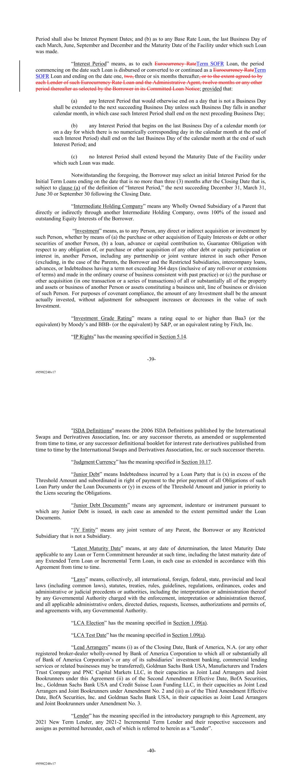 #95982248v17 Period shall also be Interest Payment Dates; and (b) as to any Base Rate Loan, the last Business Day of each March, June, September and December and the Maturity Date of the Facility under which such Loan was made. “Interest Period” means, as to each Eurocurrency RateTerm SOFR Loan, the period commencing on the date such Loan is disbursed or converted to or continued as a Eurocurrency RateTerm SOFR Loan and ending on the date one, two, three or six months thereafter, or to the extent agreed to by each Lender of such Eurocurrency Rate Loan and the Administrative Agent, twelve months or any other period thereafter as selected by the Borrower in its Committed Loan Notice; provided that: (a) any Interest Period that would otherwise end on a day that is not a Business Day shall be extended to the next succeeding Business Day unless such Business Day falls in another calendar month, in which case such Interest Period shall end on the next preceding Business Day; (b) any Interest Period that begins on the last Business Day of a calendar month (or on a day for which there is no numerically corresponding day in the calendar month at the end of such Interest Period) shall end on the last Business Day of the calendar month at the end of such Interest Period; and (c) no Interest Period shall extend beyond the Maturity Date of the Facility under which such Loan was made. Notwithstanding the foregoing, the Borrower may select an initial Interest Period for the Initial Term Loans ending on the date that is no more than three (3) months after the Closing Date that is, subject to clause (a) of the definition of “Interest Period,” the next succeeding December 31, March 31, June 30 or September 30 following the Closing Date. “Intermediate Holding Company” means any Wholly Owned Subsidiary of a Parent that directly or indirectly through another Intermediate Holding Company, owns 100% of the issued and outstanding Equity Interests of the Borrower. “Investment” means, as to any Person, any direct or indirect acquisition or investment by such Person, whether by means of (a) the purchase or other acquisition of Equity Interests or debt or other securities of another Person, (b) a loan, advance or capital contribution to, Guarantee Obligation with respect to any obligation of, or purchase or other acquisition of any other debt or equity participation or interest in, another Person, including any partnership or joint venture interest in such other Person (excluding, in the case of the Parents, the Borrower and the Restricted Subsidiaries, intercompany loans, advances, or Indebtedness having a term not exceeding 364 days (inclusive of any roll-over or extensions of terms) and made in the ordinary course of business consistent with past practice) or (c) the purchase or other acquisition (in one transaction or a series of transactions) of all or substantially all of the property and assets or business of another Person or assets constituting a business unit, line of business or division of such Person. For purposes of covenant compliance, the amount of any Investment shall be the amount actually invested, without adjustment for subsequent increases or decreases in the value of such Investment. “Investment Grade Rating” means a rating equal to or higher than Baa3 (or the equivalent) by Moody’s and BBB- (or the equivalent) by S&P, or an equivalent rating by Fitch, Inc. “IP Rights” has the meaning specified in Section 5.14. -39- #95982248v17 “ISDA Definitions” means the 2006 ISDA Definitions published by the International Swaps and Derivatives Association, Inc. or any successor thereto, as amended or supplemented from time to time, or any successor definitional booklet for interest rate derivatives published from time to time by the International Swaps and Derivatives Association, Inc. or such successor thereto. “Judgment Currency” has the meaning specified in Section 10.17. “Junior Debt” means Indebtedness incurred by a Loan Party that is (x) in excess of the Threshold Amount and subordinated in right of payment to the prior payment of all Obligations of such Loan Party under the Loan Documents or (y) in excess of the Threshold Amount and junior in priority to the Liens securing the Obligations. “Junior Debt Documents” means any agreement, indenture or instrument pursuant to which any Junior Debt is issued, in each case as amended to the extent permitted under the Loan Documents. “JV Entity” means any joint venture of any Parent, the Borrower or any Restricted Subsidiary that is not a Subsidiary. “Latest Maturity Date” means, at any date of determination, the latest Maturity Date applicable to any Loan or Term Commitment hereunder at such time, including the latest maturity date of any Extended Term Loan or Incremental Term Loan, in each case as extended in accordance with this Agreement from time to time. “Laws” means, collectively, all international, foreign, federal, state, provincial and local laws (including common laws), statutes, treaties, rules, guidelines, regulations, ordinances, codes and administrative or judicial precedents or authorities, including the interpretation or administration thereof by any Governmental Authority charged with the enforcement, interpretation or administration thereof, and all applicable administrative orders, directed duties, requests, licenses, authorizations and permits of, and agreements with, any Governmental Authority. “LCA Election” has the meaning specified in Section 1.09(a). “LCA Test Date” has the meaning specified in Section 1.09(a). “Lead Arrangers” means (i) as of the Closing Date, Bank of America, N.A. (or any other registered broker-dealer wholly-owned by Bank of America Corporation to which all or substantially all of Bank of America Corporation’s or any of its subsidiaries’ investment banking, commercial lending services or related businesses may be transferred), Goldman Sachs Bank