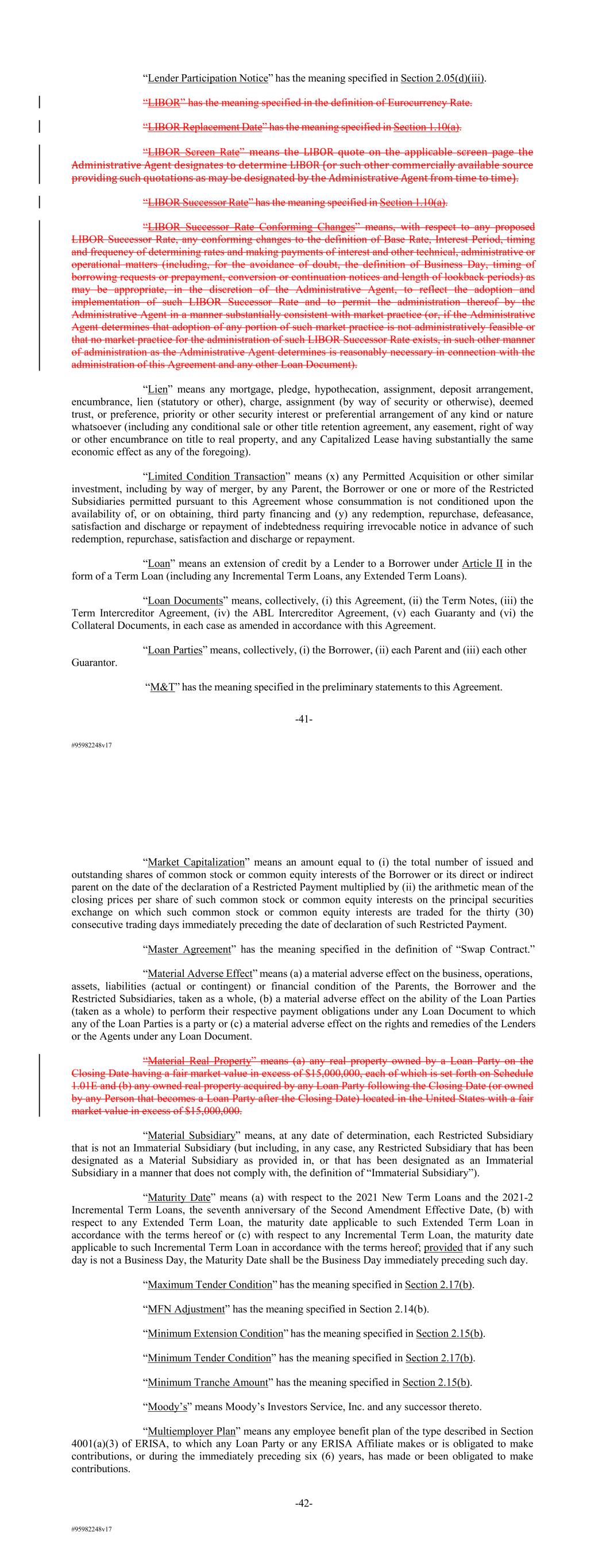 #95982248v17 “Lender Participation Notice” has the meaning specified in Section 2.05(d)(iii). “LIBOR” has the meaning specified in the definition of Eurocurrency Rate. “LIBOR Replacement Date” has the meaning specified in Section 1.10(a). “LIBOR Screen Rate” means the LIBOR quote on the applicable screen page the Administrative Agent designates to determine LIBOR (or such other commercially available source providing such quotations as may be designated by the Administrative Agent from time to time). “LIBOR Successor Rate” has the meaning specified in Section 1.10(a). “LIBOR Successor Rate Conforming Changes” means, with respect to any proposed LIBOR Successor Rate, any conforming changes to the definition of Base Rate, Interest Period, timing and frequency of determining rates and making payments of interest and other technical, administrative or operational matters (including, for the avoidance of doubt, the definition of Business Day, timing of borrowing requests or prepayment, conversion or continuation notices and length of lookback periods) as may be appropriate, in the discretion of the Administrative Agent, to reflect the adoption and implementation of such LIBOR Successor Rate and to permit the administration thereof by the Administrative Agent in a manner substantially consistent with market practice (or, if the Administrative Agent determines that adoption of any portion of such market practice is not administratively feasible or that no market practice for the administration of such LIBOR Successor Rate exists, in such other manner of administration as the Administrative Agent determines is reasonably necessary in connection with the administration of this Agreement and any other Loan Document). “Lien” means any mortgage, pledge, hypothecation, assignment, deposit arrangement, encumbrance, lien (statutory or other), charge, assignment (by way of security or otherwise), deemed trust, or preference, priority or other security interest or preferential arrangement of any kind or nature whatsoever (including any conditional sale or other title retention agreement, any easement, right of way or other encumbrance on title to real property, and any Capitalized Lease having substantially the same economic effect as any of the foregoing). “Limited Condition Transaction” means (x) any Permitted Acquisition or other similar investment, including by way of merger, by any Parent, the Borrower or one or more of the Restricted Subsidiaries permitted pursuant to this Agreement whose consummation is not conditioned upon the availability of, or on obtaining, third party financing and (y) any redemption, repurchase, defeasance, satisfaction and discharge or repayment of indebtedness requiring irrevocable notice in advance of such redemption, repurchase, satisfaction and discharge or repayment. “Loan” means an extension of credit by a Lender to a Borrower under Article II in the form of a Term Loan (including any Incremental Term Loans, any Extended Term Loans). “Loan Documents” means, collectively, (i) this Agreement, (ii) the Term Notes, (iii) the Term Intercreditor Agreement, (iv) the ABL Intercreditor Agreement, (v) each Guaranty and (vi) the Collateral Documents, in each case as amended in accordance with this Agreement. “Loan Parties” means, collectively, (i) the Borrower, (ii) each Parent and (iii) each other Guarantor. “M&T” has the meaning specified in the preliminary statements to this Agreement. -41- #95982248v17 “Market Capitalization” means an amount equal to (i) the total number of issued and outstanding shares of common stock or common equity interests of the Borrower or its direct or indirect parent on the date of the declaration of a Restricted Payment multiplied by (ii) the arithmetic mean of the closing prices per share of such common stock or common equity interests on the principal securities exchange on which such common stock or common equity interests are traded for the thirty (30) consecutive trading days immediately preceding the date of declaration of such Restricted Payment. “Master Agreement” has the meaning specified in the definition of “Swap Contract.” “Material Adverse Effect” means (a) a material adverse effect on the business, operations, assets, liabilities (actual or contingent) or financial condition of the Parents, the Borrower and the Restricted Subsidiaries, taken as a whole, (b) a material adverse effect on the ability of the Loan Parties (taken as a whole) to perform their respective payment obligations under any Loan Document to which any of the Loan Parties is a party or (c) a material adverse effect on the rights and remedies of the Lenders or the Agents under any Loan Document. “Material Real Property” means (a) any real property owned by a Loan Party on the Closing Date having a fair market value in excess of $15,000,000, each of which is set forth on Schedule 1.01E and (b) any owned real property acquired by any Loan Party following the Closing Date (or owned by any Person that becomes a Loan Party after the Closing Date) located in the United States with a fair market value in excess of $15,000,000. “Material Subsidiary” means, at any date of determination, each Restricted Subsidiary that is not an Immaterial Subsidiary (but including, in any case, any Restricted Subsidiary that has been designated as a Material Subsidiary as provided in, or that has been designated as an Immaterial Subsidiary in a manner that does not comply with, the definition of “Immaterial Subsidiary”). “Maturity Date” means (a) with respect to the 2021 New Term Loans and the 2021-2 Incremental Term Loans, the seventh anniversary of the Second Amendment Effective Date, (b) with respect to any Extended Term Loan, the maturity date applicable to such Extended Term Loan in accordance with the terms hereof or (c) with respect to any Incremental Term Loan, the maturity date applicable to such Increment