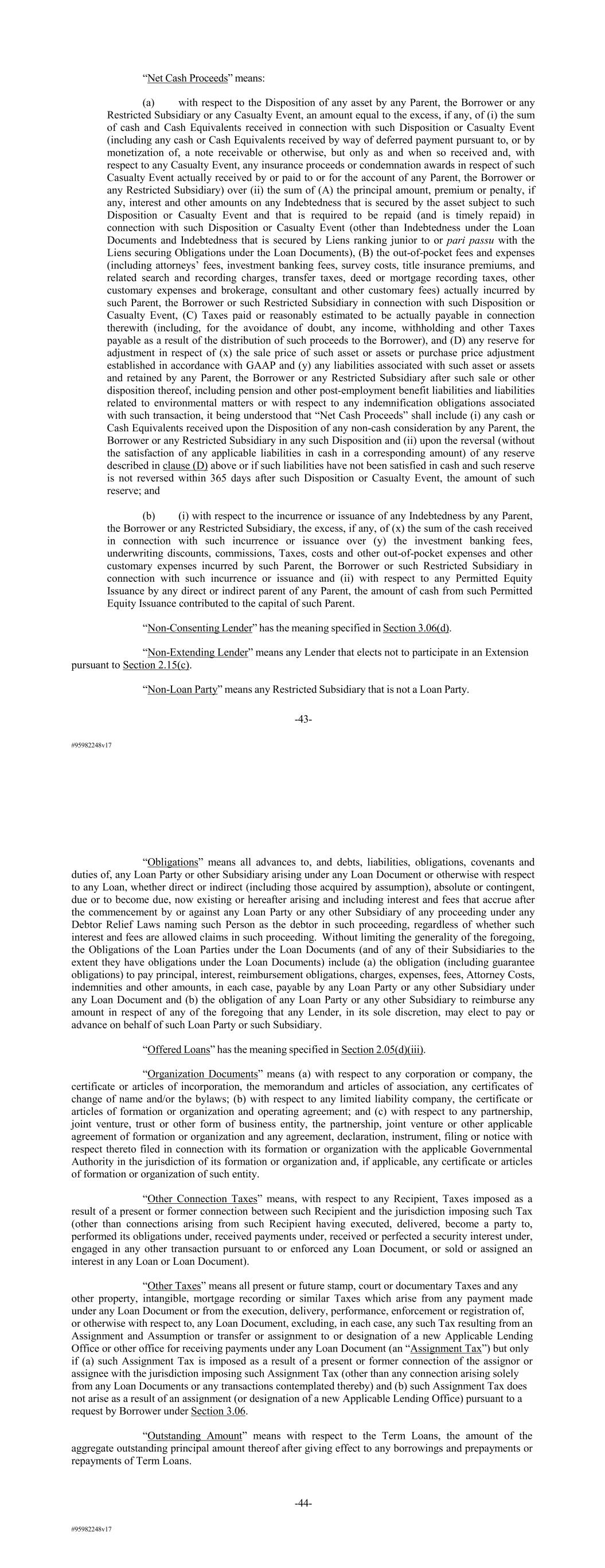 #95982248v17 “Net Cash Proceeds” means: (a) with respect to the Disposition of any asset by any Parent, the Borrower or any Restricted Subsidiary or any Casualty Event, an amount equal to the excess, if any, of (i) the sum of cash and Cash Equivalents received in connection with such Disposition or Casualty Event (including any cash or Cash Equivalents received by way of deferred payment pursuant to, or by monetization of, a note receivable or otherwise, but only as and when so received and, with respect to any Casualty Event, any insurance proceeds or condemnation awards in respect of such Casualty Event actually received by or paid to or for the account of any Parent, the Borrower or any Restricted Subsidiary) over (ii) the sum of (A) the principal amount, premium or penalty, if any, interest and other amounts on any Indebtedness that is secured by the asset subject to such Disposition or Casualty Event and that is required to be repaid (and is timely repaid) in connection with such Disposition or Casualty Event (other than Indebtedness under the Loan Documents and Indebtedness that is secured by Liens ranking junior to or pari passu with the Liens securing Obligations under the Loan Documents), (B) the out-of-pocket fees and expenses (including attorneys’ fees, investment banking fees, survey costs, title insurance premiums, and related search and recording charges, transfer taxes, deed or mortgage recording taxes, other customary expenses and brokerage, consultant and other customary fees) actually incurred by such Parent, the Borrower or such Restricted Subsidiary in connection with such Disposition or Casualty Event, (C) Taxes paid or reasonably estimated to be actually payable in connection therewith (including, for the avoidance of doubt, any income, withholding and other Taxes payable as a result of the distribution of such proceeds to the Borrower), and (D) any reserve for adjustment in respect of (x) the sale price of such asset or assets or purchase price adjustment established in accordance with GAAP and (y) any liabilities associated with such asset or assets and retained by any Parent, the Borrower or any Restricted Subsidiary after such sale or other disposition thereof, including pension and other post-employment benefit liabilities and liabilities related to environmental matters or with respect to any indemnification obligations associated with such transaction, it being understood that “Net Cash Proceeds” shall include (i) any cash or Cash Equivalents received upon the Disposition of any non-cash consideration by any Parent, the Borrower or any Restricted Subsidiary in any such Disposition and (ii) upon the reversal (without the satisfaction of any applicable liabilities in cash in a corresponding amount) of any reserve described in clause (D) above or if such liabilities have not been satisfied in cash and such reserve is not reversed within 365 days after such Disposition or Casualty Event, the amount of such reserve; and (b) (i) with respect to the incurrence or issuance of any Indebtedness by any Parent, the Borrower or any Restricted Subsidiary, the excess, if any, of (x) the sum of the cash received in connection with such incurrence or issuance over (y) the investment banking fees, underwriting discounts, commissions, Taxes, costs and other out-of-pocket expenses and other customary expenses incurred by such Parent, the Borrower or such Restricted Subsidiary in connection with such incurrence or issuance and (ii) with respect to any Permitted Equity Issuance by any direct or indirect parent of any Parent, the amount of cash from such Permitted Equity Issuance contributed to the capital of such Parent. “Non-Consenting Lender” has the meaning specified in Section 3.06(d). “Non-Extending Lender” means any Lender that elects not to participate in an Extension pursuant to Section 2.15(c). “Non-Loan Party” means any Restricted Subsidiary that is not a Loan Party. -43- #95982248v17 “Obligations” means all advances to, and debts, liabilities, obligations, covenants and duties of, any Loan Party or other Subsidiary arising under any Loan Document or otherwise with respect to any Loan, whether direct or indirect (including those acquired by assumption), absolute or contingent, due or to become due, now existing or hereafter arising and including interest and fees that accrue after the commencement by or against any Loan Party or any other Subsidiary of any proceeding under any Debtor Relief Laws naming such Person as the debtor in such proceeding, regardless of whether such interest and fees are allowed claims in such proceeding. Without limiting the generality of the foregoing, the Obligations of the Loan Parties under the Loan Documents (and of any of their Subsidiaries to the extent they have obligations under the Loan Documents) include (a) the obligation (including guarantee obligations) to pay principal, interest, reimbursement obligations, charges, expenses, fees, Attorney Costs, indemnities and other amounts, in each case, payable by any Loan Party or any other Subsidiary under any Loan Document and (b) the obligation of any Loan Party or any other Subsidiary to reimburse any amount in respect of any of the foregoing that any Lender, in its sole discretion, may elect to pay or advance on behalf of such Loan Party or such Subsidiary. “Offered Loans” has the meaning specified in Section 2.05(d)(iii). “Organization Documents” means (a) with respect to any corporation or company, the certificate or articles of incorporation, the memorandum and articles of association, any certificates of change of name and/or the bylaws; (b) with respect to any limited liability company, the certificate or articles of formation or organization and operating agreement; and (c) with respect to any partnership, joint venture, trust or other form of business entity, the partnership, joint venture or other applicable agreement of formation or organization