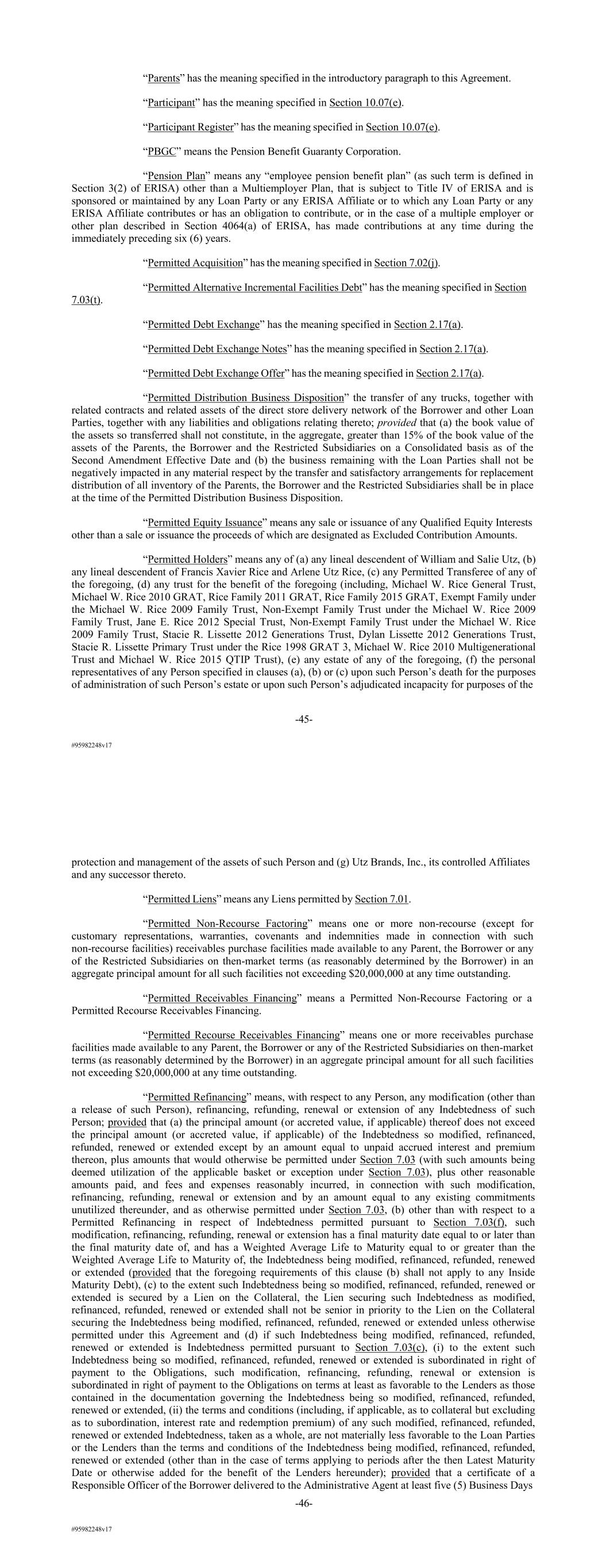 #95982248v17 “Parents” has the meaning specified in the introductory paragraph to this Agreement. “Participant” has the meaning specified in Section 10.07(e). “Participant Register” has the meaning specified in Section 10.07(e). “PBGC” means the Pension Benefit Guaranty Corporation. “Pension Plan” means any “employee pension benefit plan” (as such term is defined in Section 3(2) of ERISA) other than a Multiemployer Plan, that is subject to Title IV of ERISA and is sponsored or maintained by any Loan Party or any ERISA Affiliate or to which any Loan Party or any ERISA Affiliate contributes or has an obligation to contribute, or in the case of a multiple employer or other plan described in Section 4064(a) of ERISA, has made contributions at any time during the immediately preceding six (6) years. “Permitted Acquisition” has the meaning specified in Section 7.02(j). “Permitted Alternative Incremental Facilities Debt” has the meaning specified in Section 7.03(t). “Permitted Debt Exchange” has the meaning specified in Section 2.17(a). “Permitted Debt Exchange Notes” has the meaning specified in Section 2.17(a). “Permitted Debt Exchange Offer” has the meaning specified in Section 2.17(a). “Permitted Distribution Business Disposition” the transfer of any trucks, together with related contracts and related assets of the direct store delivery network of the Borrower and other Loan Parties, together with any liabilities and obligations relating thereto; provided that (a) the book value of the assets so transferred shall not constitute, in the aggregate, greater than 15% of the book value of the assets of the Parents, the Borrower and the Restricted Subsidiaries on a Consolidated basis as of the Second Amendment Effective Date and (b) the business remaining with the Loan Parties shall not be negatively impacted in any material respect by the transfer and satisfactory arrangements for replacement distribution of all inventory of the Parents, the Borrower and the Restricted Subsidiaries shall be in place at the time of the Permitted Distribution Business Disposition. “Permitted Equity Issuance” means any sale or issuance of any Qualified Equity Interests other than a sale or issuance the proceeds of which are designated as Excluded Contribution Amounts. “Permitted Holders” means any of (a) any lineal descendent of William and Salie Utz, (b) any lineal descendent of Francis Xavier Rice and Arlene Utz Rice, (c) any Permitted Transferee of any of the foregoing, (d) any trust for the benefit of the foregoing (including, Michael W. Rice General Trust, Michael W. Rice 2010 GRAT, Rice Family 2011 GRAT, Rice Family 2015 GRAT, Exempt Family under the Michael W. Rice 2009 Family Trust, Non-Exempt Family Trust under the Michael W. Rice 2009 Family Trust, Jane E. Rice 2012 Special Trust, Non-Exempt Family Trust under the Michael W. Rice 2009 Family Trust, Stacie R. Lissette 2012 Generations Trust, Dylan Lissette 2012 Generations Trust, Stacie R. Lissette Primary Trust under the Rice 1998 GRAT 3, Michael W. Rice 2010 Multigenerational Trust and Michael W. Rice 2015 QTIP Trust), (e) any estate of any of the foregoing, (f) the personal representatives of any Person specified in clauses (a), (b) or (c) upon such Person’s death for the purposes of administration of such Person’s estate or upon such Person’s adjudicated incapacity for purposes of the -45- #95982248v17 protection and management of the assets of such Person and (g) Utz Brands, Inc., its controlled Affiliates and any successor thereto. “Permitted Liens” means any Liens permitted by Section 7.01. “Permitted Non-Recourse Factoring” means one or more non-recourse (except for customary representations, warranties, covenants and indemnities made in connection with such non-recourse facilities) receivables purchase facilities made available to any Parent, the Borrower or any of the Restricted Subsidiaries on then-market terms (as reasonably determined by the Borrower) in an aggregate principal amount for all such facilities not exceeding $20,000,000 at any time outstanding. “Permitted Receivables Financing” means a Permitted Non-Recourse Factoring or a Permitted Recourse Receivables Financing. “Permitted Recourse Receivables Financing” means one or more receivables purchase facilities made available to any Parent, the Borrower or any of the Restricted Subsidiaries on then-market terms (as reasonably determined by the Borrower) in an aggregate principal amount for all such facilities not exceeding $20,000,000 at any time outstanding. “Permitted Refinancing” means, with respect to any Person, any modification (other than a release of such Person), refinancing, refunding, renewal or extension of any Indebtedness of such Person; provided that (a) the principal amount (or accreted value, if applicable) thereof does not exceed the principal amount (or accreted value, if applicable) of the Indebtedness so modified, refinanced, refunded, renewed or extended except by an amount equal to unpaid accrued interest and premium thereon, plus amounts that would otherwise be permitted under Section 7.03 (with such amounts being deemed utilization of the applicable basket or exception under Section 7.03), plus other reasonable amounts paid, and fees and expenses reasonably incurred, in connection with such modification, refinancing, refunding, renewal or extension and by an amount equal to any existing commitments unutilized thereunder, and as otherwise permitted under Section 7.03, (b) other than with respect to a Permitted Refinancing in respect of Indebtedness permitted pursuant to Section 7.03(f), such modification, refinancing, refunding, renewal or extension has a final maturity date equal to or later than the final maturity date of, and has a Weighted Average Life to Maturity equal to or greater than the Weighted Average Life to Maturity of, the Indebtedness being modified, refinanced, refu