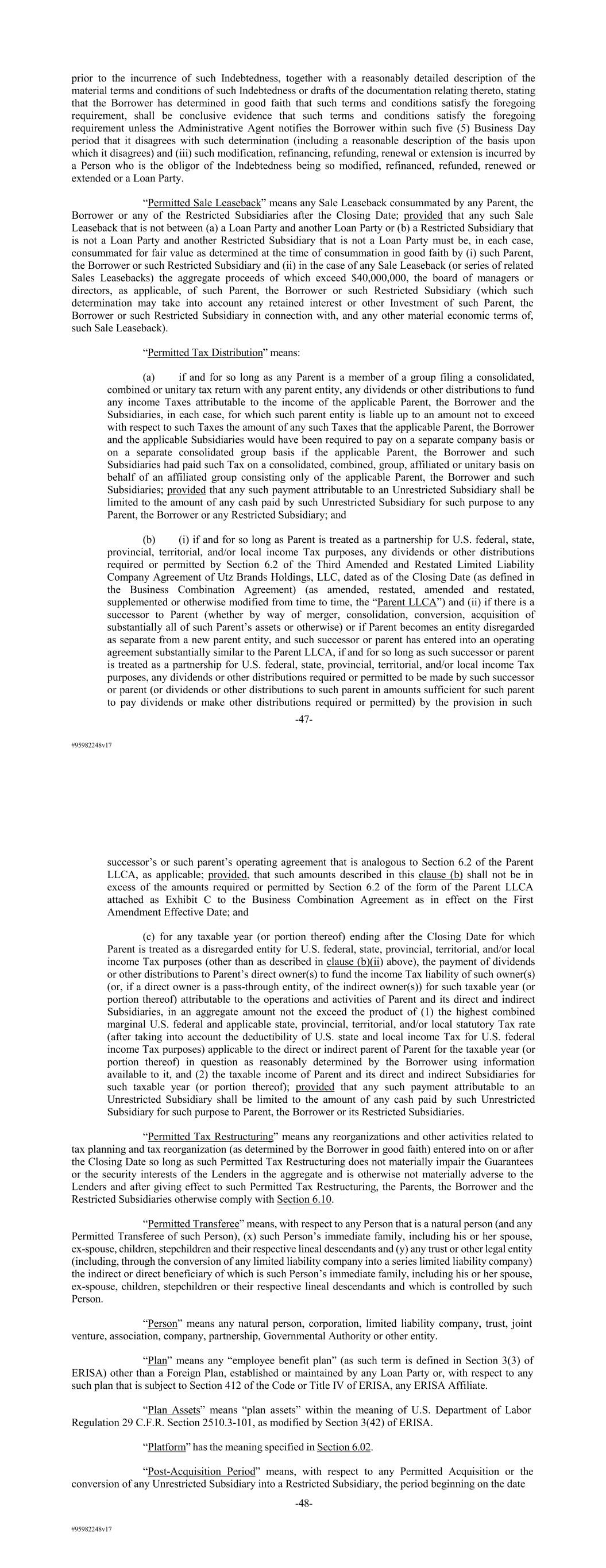 #95982248v17 prior to the incurrence of such Indebtedness, together with a reasonably detailed description of the material terms and conditions of such Indebtedness or drafts of the documentation relating thereto, stating that the Borrower has determined in good faith that such terms and conditions satisfy the foregoing requirement, shall be conclusive evidence that such terms and conditions satisfy the foregoing requirement unless the Administrative Agent notifies the Borrower within such five (5) Business Day period that it disagrees with such determination (including a reasonable description of the basis upon which it disagrees) and (iii) such modification, refinancing, refunding, renewal or extension is incurred by a Person who is the obligor of the Indebtedness being so modified, refinanced, refunded, renewed or extended or a Loan Party. “Permitted Sale Leaseback” means any Sale Leaseback consummated by any Parent, the Borrower or any of the Restricted Subsidiaries after the Closing Date; provided that any such Sale Leaseback that is not between (a) a Loan Party and another Loan Party or (b) a Restricted Subsidiary that is not a Loan Party and another Restricted Subsidiary that is not a Loan Party must be, in each case, consummated for fair value as determined at the time of consummation in good faith by (i) such Parent, the Borrower or such Restricted Subsidiary and (ii) in the case of any Sale Leaseback (or series of related Sales Leasebacks) the aggregate proceeds of which exceed $40,000,000, the board of managers or directors, as applicable, of such Parent, the Borrower or such Restricted Subsidiary (which such determination may take into account any retained interest or other Investment of such Parent, the Borrower or such Restricted Subsidiary in connection with, and any other material economic terms of, such Sale Leaseback). “Permitted Tax Distribution” means: (a) if and for so long as any Parent is a member of a group filing a consolidated, combined or unitary tax return with any parent entity, any dividends or other distributions to fund any income Taxes attributable to the income of the applicable Parent, the Borrower and the Subsidiaries, in each case, for which such parent entity is liable up to an amount not to exceed with respect to such Taxes the amount of any such Taxes that the applicable Parent, the Borrower and the applicable Subsidiaries would have been required to pay on a separate company basis or on a separate consolidated group basis if the applicable Parent, the Borrower and such Subsidiaries had paid such Tax on a consolidated, combined, group, affiliated or unitary basis on behalf of an affiliated group consisting only of the applicable Parent, the Borrower and such Subsidiaries; provided that any such payment attributable to an Unrestricted Subsidiary shall be limited to the amount of any cash paid by such Unrestricted Subsidiary for such purpose to any Parent, the Borrower or any Restricted Subsidiary; and (b) (i) if and for so long as Parent is treated as a partnership for U.S. federal, state, provincial, territorial, and/or local income Tax purposes, any dividends or other distributions required or permitted by Section 6.2 of the Third Amended and Restated Limited Liability Company Agreement of Utz Brands Holdings, LLC, dated as of the Closing Date (as defined in the Business Combination Agreement) (as amended, restated, amended and restated, supplemented or otherwise modified from time to time, the “Parent LLCA”) and (ii) if there is a successor to Parent (whether by way of merger, consolidation, conversion, acquisition of substantially all of such Parent’s assets or otherwise) or if Parent becomes an entity disregarded as separate from a new parent entity, and such successor or parent has entered into an operating agreement substantially similar to the Parent LLCA, if and for so long as such successor or parent is treated as a partnership for U.S. federal, state, provincial, territorial, and/or local income Tax purposes, any dividends or other distributions required or permitted to be made by such successor or parent (or dividends or other distributions to such parent in amounts sufficient for such parent to pay dividends or make other distributions required or permitted) by the provision in such -47- #95982248v17 successor’s or such parent’s operating agreement that is analogous to Section 6.2 of the Parent LLCA, as applicable; provided, that such amounts described in this clause (b) shall not be in excess of the amounts required or permitted by Section 6.2 of the form of the Parent LLCA attached as Exhibit C to the Business Combination Agreement as in effect on the First Amendment Effective Date; and (c) for any taxable year (or portion thereof) ending after the Closing Date for which Parent is treated as a disregarded entity for U.S. federal, state, provincial, territorial, and/or local income Tax purposes (other than as described in clause (b)(ii) above), the payment of dividends or other distributions to Parent’s direct owner(s) to fund the income Tax liability of such owner(s) (or, if a direct owner is a pass-through entity, of the indirect owner(s)) for such taxable year (or portion thereof) attributable to the operations and activities of Parent and its direct and indirect Subsidiaries, in an aggregate amount not the exceed the product of (1) the highest combined marginal U.S. federal and applicable state, provincial, territorial, and/or local statutory Tax rate (after taking into account the deductibility of U.S. state and local income Tax for U.S. federal income Tax purposes) applicable to the direct or indirect parent of Parent for the taxable year (or portion thereof) in question as reasonably determined by the Borrower using information available to it, and (2) the taxable income of Parent and its direct and indirect Subsidiaries for such taxable year (or portion thereof); provided that any such payment attributable t
