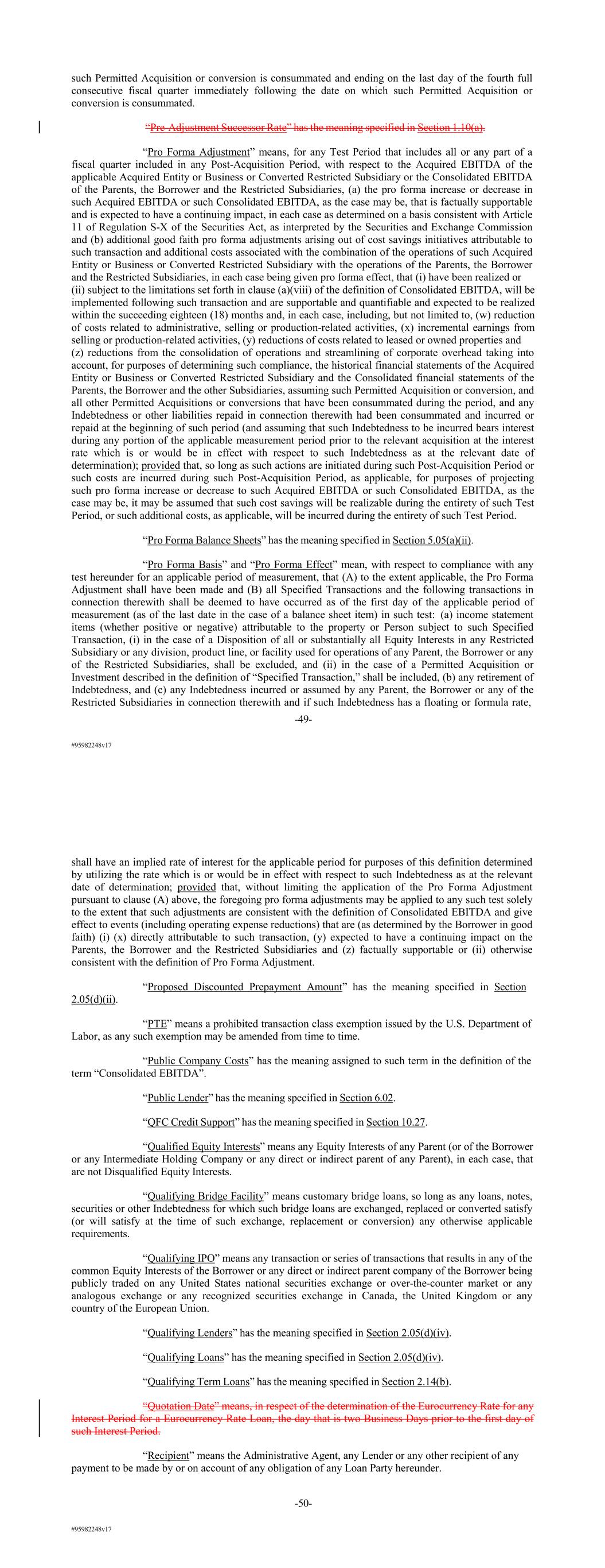 #95982248v17 such Permitted Acquisition or conversion is consummated and ending on the last day of the fourth full consecutive fiscal quarter immediately following the date on which such Permitted Acquisition or conversion is consummated. “Pre-Adjustment Successor Rate” has the meaning specified in Section 1.10(a). “Pro Forma Adjustment” means, for any Test Period that includes all or any part of a fiscal quarter included in any Post-Acquisition Period, with respect to the Acquired EBITDA of the applicable Acquired Entity or Business or Converted Restricted Subsidiary or the Consolidated EBITDA of the Parents, the Borrower and the Restricted Subsidiaries, (a) the pro forma increase or decrease in such Acquired EBITDA or such Consolidated EBITDA, as the case may be, that is factually supportable and is expected to have a continuing impact, in each case as determined on a basis consistent with Article 11 of Regulation S-X of the Securities Act, as interpreted by the Securities and Exchange Commission and (b) additional good faith pro forma adjustments arising out of cost savings initiatives attributable to such transaction and additional costs associated with the combination of the operations of such Acquired Entity or Business or Converted Restricted Subsidiary with the operations of the Parents, the Borrower and the Restricted Subsidiaries, in each case being given pro forma effect, that (i) have been realized or (ii) subject to the limitations set forth in clause (a)(viii) of the definition of Consolidated EBITDA, will be implemented following such transaction and are supportable and quantifiable and expected to be realized within the succeeding eighteen (18) months and, in each case, including, but not limited to, (w) reduction of costs related to administrative, selling or production-related activities, (x) incremental earnings from selling or production-related activities, (y) reductions of costs related to leased or owned properties and (z) reductions from the consolidation of operations and streamlining of corporate overhead taking into account, for purposes of determining such compliance, the historical financial statements of the Acquired Entity or Business or Converted Restricted Subsidiary and the Consolidated financial statements of the Parents, the Borrower and the other Subsidiaries, assuming such Permitted Acquisition or conversion, and all other Permitted Acquisitions or conversions that have been consummated during the period, and any Indebtedness or other liabilities repaid in connection therewith had been consummated and incurred or repaid at the beginning of such period (and assuming that such Indebtedness to be incurred bears interest during any portion of the applicable measurement period prior to the relevant acquisition at the interest rate which is or would be in effect with respect to such Indebtedness as at the relevant date of determination); provided that, so long as such actions are initiated during such Post-Acquisition Period or such costs are incurred during such Post-Acquisition Period, as applicable, for purposes of projecting such pro forma increase or decrease to such Acquired EBITDA or such Consolidated EBITDA, as the case may be, it may be assumed that such cost savings will be realizable during the entirety of such Test Period, or such additional costs, as applicable, will be incurred during the entirety of such Test Period. “Pro Forma Balance Sheets” has the meaning specified in Section 5.05(a)(ii). “Pro Forma Basis” and “Pro Forma Effect” mean, with respect to compliance with any test hereunder for an applicable period of measurement, that (A) to the extent applicable, the Pro Forma Adjustment shall have been made and (B) all Specified Transactions and the following transactions in connection therewith shall be deemed to have occurred as of the first day of the applicable period of measurement (as of the last date in the case of a balance sheet item) in such test: (a) income statement items (whether positive or negative) attributable to the property or Person subject to such Specified Transaction, (i) in the case of a Disposition of all or substantially all Equity Interests in any Restricted Subsidiary or any division, product line, or facility used for operations of any Parent, the Borrower or any of the Restricted Subsidiaries, shall be excluded, and (ii) in the case of a Permitted Acquisition or Investment described in the definition of “Specified Transaction,” shall be included, (b) any retirement of Indebtedness, and (c) any Indebtedness incurred or assumed by any Parent, the Borrower or any of the Restricted Subsidiaries in connection therewith and if such Indebtedness has a floating or formula rate, -49- #95982248v17 shall have an implied rate of interest for the applicable period for purposes of this definition determined by utilizing the rate which is or would be in effect with respect to such Indebtedness as at the relevant date of determination; provided that, without limiting the application of the Pro Forma Adjustment pursuant to clause (A) above, the foregoing pro forma adjustments may be applied to any such test solely to the extent that such adjustments are consistent with the definition of Consolidated EBITDA and give effect to events (including operating expense reductions) that are (as determined by the Borrower in good faith) (i) (x) directly attributable to such transaction, (y) expected to have a continuing impact on the Parents, the Borrower and the Restricted Subsidiaries and (z) factually supportable or (ii) otherwise consistent with the definition of Pro Forma Adjustment. “Proposed Discounted Prepayment Amount” has the meaning specified in Section 2.05(d)(ii). “PTE” means a prohibited transaction class exemption issued by the U.S. Department of Labor, as any such exemption may be amended from time to time. “Public Company Costs” has the meaning assigned to such term in the definition of