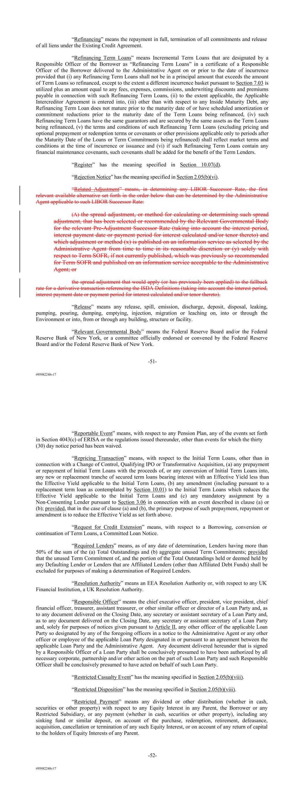 #95982248v17 “Refinancing” means the repayment in full, termination of all commitments and release of all liens under the Existing Credit Agreement. “Refinancing Term Loans” means Incremental Term Loans that are designated by a Responsible Officer of the Borrower as “Refinancing Term Loans” in a certificate of a Responsible Officer of the Borrower delivered to the Administrative Agent on or prior to the date of incurrence provided that (i) any Refinancing Term Loans shall not be in a principal amount that exceeds the amount of Term Loans so refinanced, except to the extent a different incurrence basket pursuant to Section 7.03 is utilized plus an amount equal to any fees, expenses, commissions, underwriting discounts and premiums payable in connection with such Refinancing Term Loans, (ii) to the extent applicable, the Applicable Intercreditor Agreement is entered into, (iii) other than with respect to any Inside Maturity Debt, any Refinancing Term Loan does not mature prior to the maturity date of or have scheduled amortization or commitment reductions prior to the maturity date of the Term Loans being refinanced, (iv) such Refinancing Term Loans have the same guarantors and are secured by the same assets as the Term Loans being refinanced, (v) the terms and conditions of such Refinancing Term Loans (excluding pricing and optional prepayment or redemption terms or covenants or other provisions applicable only to periods after the Maturity Date of the Loans or Term Commitments being refinanced) shall reflect market terms and conditions at the time of incurrence or issuance and (vi) if such Refinancing Term Loans contain any financial maintenance covenants, such covenants shall be added for the benefit of the Term Lenders. “Register” has the meaning specified in Section 10.07(d). “Rejection Notice” has the meaning specified in Section 2.05(b)(vi). “Related Adjustment” means, in determining any LIBOR Successor Rate, the first relevant available alternative set forth in the order below that can be determined by the Administrative Agent applicable to such LIBOR Successor Rate: (A) the spread adjustment, or method for calculating or determining such spread adjustment, that has been selected or recommended by the Relevant Governmental Body for the relevant Pre-Adjustment Successor Rate (taking into account the interest period, interest payment date or payment period for interest calculated and/or tenor thereto) and which adjustment or method (x) is published on an information service as selected by the Administrative Agent from time to time in its reasonable discretion or (y) solely with respect to Term SOFR, if not currently published, which was previously so recommended for Term SOFR and published on an information service acceptable to the Administrative Agent; or the spread adjustment that would apply (or has previously been applied) to the fallback rate for a derivative transaction referencing the ISDA Definitions (taking into account the interest period, interest payment date or payment period for interest calculated and/or tenor thereto). “Release” means any release, spill, emission, discharge, deposit, disposal, leaking, pumping, pouring, dumping, emptying, injection, migration or leaching on, into or through the Environment or into, from or through any building, structure or facility. “Relevant Governmental Body” means the Federal Reserve Board and/or the Federal Reserve Bank of New York, or a committee officially endorsed or convened by the Federal Reserve Board and/or the Federal Reserve Bank of New York. -51- #95982248v17 “Reportable Event” means, with respect to any Pension Plan, any of the events set forth in Section 4043(c) of ERISA or the regulations issued thereunder, other than events for which the thirty (30) day notice period has been waived. “Repricing Transaction” means, with respect to the Initial Term Loans, other than in connection with a Change of Control, Qualifying IPO or Transformative Acquisition, (a) any prepayment or repayment of Initial Term Loans with the proceeds of, or any conversion of Initial Term Loans into, any new or replacement tranche of secured term loans bearing interest with an Effective Yield less than the Effective Yield applicable to the Initial Term Loans, (b) any amendment (including pursuant to a replacement term loan as contemplated by Section 10.01) to the Initial Term Loans which reduces the Effective Yield applicable to the Initial Term Loans and (c) any mandatory assignment by a Non-Consenting Lender pursuant to Section 3.06 in connection with an event described in clause (a) or (b); provided, that in the case of clause (a) and (b), the primary purpose of such prepayment, repayment or amendment is to reduce the Effective Yield as set forth above. “Request for Credit Extension” means, with respect to a Borrowing, conversion or continuation of Term Loans, a Committed Loan Notice. “Required Lenders” means, as of any date of determination, Lenders having more than 50% of the sum of the (a) Total Outstandings and (b) aggregate unused Term Commitments; provided that the unused Term Commitment of, and the portion of the Total Outstandings held or deemed held by any Defaulting Lender or Lenders that are Affiliated Lenders (other than Affiliated Debt Funds) shall be excluded for purposes of making a determination of Required Lenders. “Resolution Authority” means an EEA Resolution Authority or, with respect to any UK Financial Institution, a UK Resolution Authority. “Responsible Officer” means the chief executive officer, president, vice president, chief financial officer, treasurer, assistant treasurer, or other similar officer or director of a Loan Party and, as to any document delivered on the Closing Date, any secretary or assistant secretary of a Loan Party and, as to any document delivered on the Closing Date, any secretary or assistant secretary of a Loan Party and, solely for purposes