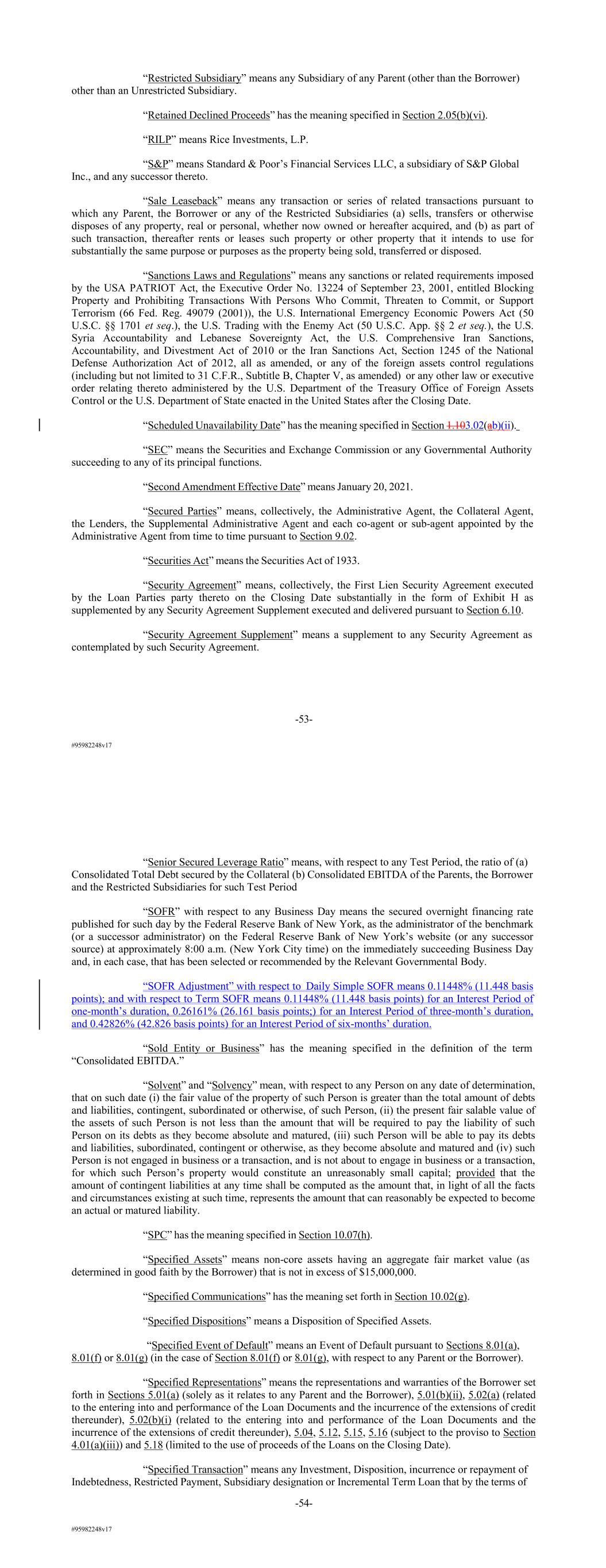 #95982248v17 “Restricted Subsidiary” means any Subsidiary of any Parent (other than the Borrower) other than an Unrestricted Subsidiary. “Retained Declined Proceeds” has the meaning specified in Section 2.05(b)(vi). “RILP” means Rice Investments, L.P. “S&P” means Standard & Poor’s Financial Services LLC, a subsidiary of S&P Global Inc., and any successor thereto. “Sale Leaseback” means any transaction or series of related transactions pursuant to which any Parent, the Borrower or any of the Restricted Subsidiaries (a) sells, transfers or otherwise disposes of any property, real or personal, whether now owned or hereafter acquired, and (b) as part of such transaction, thereafter rents or leases such property or other property that it intends to use for substantially the same purpose or purposes as the property being sold, transferred or disposed. “Sanctions Laws and Regulations” means any sanctions or related requirements imposed by the USA PATRIOT Act, the Executive Order No. 13224 of September 23, 2001, entitled Blocking Property and Prohibiting Transactions With Persons Who Commit, Threaten to Commit, or Support Terrorism (66 Fed. Reg. 49079 (2001)), the U.S. International Emergency Economic Powers Act (50 U.S.C. §§ 1701 et seq.), the U.S. Trading with the Enemy Act (50 U.S.C. App. §§ 2 et seq.), the U.S. Syria Accountability and Lebanese Sovereignty Act, the U.S. Comprehensive Iran Sanctions, Accountability, and Divestment Act of 2010 or the Iran Sanctions Act, Section 1245 of the National Defense Authorization Act of 2012, all as amended, or any of the foreign assets control regulations (including but not limited to 31 C.F.R., Subtitle B, Chapter V, as amended) or any other law or executive order relating thereto administered by the U.S. Department of the Treasury Office of Foreign Assets Control or the U.S. Department of State enacted in the United States after the Closing Date. “Scheduled Unavailability Date” has the meaning specified in Section 1.103.02(ab)(ii). “SEC” means the Securities and Exchange Commission or any Governmental Authority succeeding to any of its principal functions. “Second Amendment Effective Date” means January 20, 2021. “Secured Parties” means, collectively, the Administrative Agent, the Collateral Agent, the Lenders, the Supplemental Administrative Agent and each co-agent or sub-agent appointed by the Administrative Agent from time to time pursuant to Section 9.02. “Securities Act” means the Securities Act of 1933. “Security Agreement” means, collectively, the First Lien Security Agreement executed by the Loan Parties party thereto on the Closing Date substantially in the form of Exhibit H as supplemented by any Security Agreement Supplement executed and delivered pursuant to Section 6.10. “Security Agreement Supplement” means a supplement to any Security Agreement as contemplated by such Security Agreement. -53- #95982248v17 “Senior Secured Leverage Ratio” means, with respect to any Test Period, the ratio of (a) Consolidated Total Debt secured by the Collateral (b) Consolidated EBITDA of the Parents, the Borrower and the Restricted Subsidiaries for such Test Period “SOFR” with respect to any Business Day means the secured overnight financing rate published for such day by the Federal Reserve Bank of New York, as the administrator of the benchmark (or a successor administrator) on the Federal Reserve Bank of New York’s website (or any successor source) at approximately 8:00 a.m. (New York City time) on the immediately succeeding Business Day and, in each case, that has been selected or recommended by the Relevant Governmental Body. “SOFR Adjustment” with respect to Daily Simple SOFR means 0.11448% (11.448 basis points); and with respect to Term SOFR means 0.11448% (11.448 basis points) for an Interest Period of one-month’s duration, 0.26161% (26.161 basis points;) for an Interest Period of three-month’s duration, and 0.42826% (42.826 basis points) for an Interest Period of six-months’ duration. “Sold Entity or Business” has the meaning specified in the definition of the term “Consolidated EBITDA.” “Solvent” and “Solvency” mean, with respect to any Person on any date of determination, that on such date (i) the fair value of the property of such Person is greater than the total amount of debts and liabilities, contingent, subordinated or otherwise, of such Person, (ii) the present fair salable value of the assets of such Person is not less than the amount that will be required to pay the liability of such Person on its debts as they become absolute and matured, (iii) such Person will be able to pay its debts and liabilities, subordinated, contingent or otherwise, as they become absolute and matured and (iv) such Person is not engaged in business or a transaction, and is not about to engage in business or a transaction, for which such Person’s property would constitute an unreasonably small capital; provided that the amount of contingent liabilities at any time shall be computed as the amount that, in light of all the facts and circumstances existing at such time, represents the amount that can reasonably be expected to become an actual or matured liability. “SPC” has the meaning specified in Section 10.07(h). “Specified Assets” means non-core assets having an aggregate fair market value (as determined in good faith by the Borrower) that is not in excess of $15,000,000. “Specified Communications” has the meaning set forth in Section 10.02(g). “Specified Dispositions” means a Disposition of Specified Assets. “Specified Event of Default” means an Event of Default pursuant to Sections 8.01(a), 8.01(f) or 8.01(g) (in the case of Section 8.01(f) or 8.01(g), with respect to any Parent or the Borrower). “Specified Representations” means the representations and warranties of the Borrower set forth in Sections 5.01(a) (solely as it relates to any Par