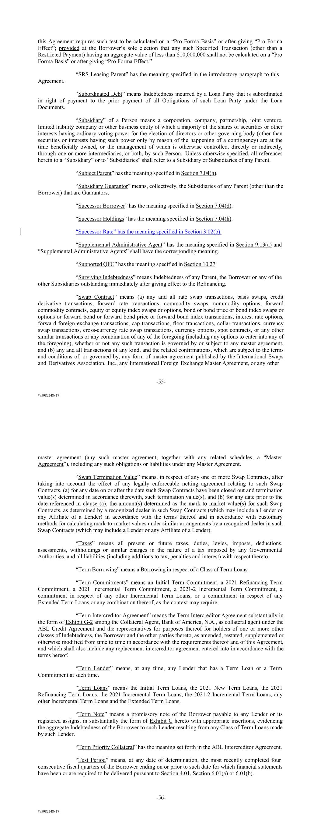 #95982248v17 this Agreement requires such test to be calculated on a “Pro Forma Basis” or after giving “Pro Forma Effect”; provided at the Borrower’s sole election that any such Specified Transaction (other than a Restricted Payment) having an aggregate value of less than $10,000,000 shall not be calculated on a “Pro Forma Basis” or after giving “Pro Forma Effect.” “SRS Leasing Parent” has the meaning specified in the introductory paragraph to this Agreement. “Subordinated Debt” means Indebtedness incurred by a Loan Party that is subordinated in right of payment to the prior payment of all Obligations of such Loan Party under the Loan Documents. “Subsidiary” of a Person means a corporation, company, partnership, joint venture, limited liability company or other business entity of which a majority of the shares of securities or other interests having ordinary voting power for the election of directors or other governing body (other than securities or interests having such power only by reason of the happening of a contingency) are at the time beneficially owned, or the management of which is otherwise controlled, directly or indirectly, through one or more intermediaries, or both, by such Person. Unless otherwise specified, all references herein to a “Subsidiary” or to “Subsidiaries” shall refer to a Subsidiary or Subsidiaries of any Parent. “Subject Parent” has the meaning specified in Section 7.04(h). “Subsidiary Guarantor” means, collectively, the Subsidiaries of any Parent (other than the Borrower) that are Guarantors. “Successor Borrower” has the meaning specified in Section 7.04(d). “Successor Holdings” has the meaning specified in Section 7.04(h). “Successor Rate” has the meaning specified in Section 3.02(b). “Supplemental Administrative Agent” has the meaning specified in Section 9.13(a) and “Supplemental Administrative Agents” shall have the corresponding meaning. “Supported QFC” has the meaning specified in Section 10.27. “Surviving Indebtedness” means Indebtedness of any Parent, the Borrower or any of the other Subsidiaries outstanding immediately after giving effect to the Refinancing. “Swap Contract” means (a) any and all rate swap transactions, basis swaps, credit derivative transactions, forward rate transactions, commodity swaps, commodity options, forward commodity contracts, equity or equity index swaps or options, bond or bond price or bond index swaps or options or forward bond or forward bond price or forward bond index transactions, interest rate options, forward foreign exchange transactions, cap transactions, floor transactions, collar transactions, currency swap transactions, cross-currency rate swap transactions, currency options, spot contracts, or any other similar transactions or any combination of any of the foregoing (including any options to enter into any of the foregoing), whether or not any such transaction is governed by or subject to any master agreement, and (b) any and all transactions of any kind, and the related confirmations, which are subject to the terms and conditions of, or governed by, any form of master agreement published by the International Swaps and Derivatives Association, Inc., any International Foreign Exchange Master Agreement, or any other -55- #95982248v17 master agreement (any such master agreement, together with any related schedules, a “Master Agreement”), including any such obligations or liabilities under any Master Agreement. “Swap Termination Value” means, in respect of any one or more Swap Contracts, after taking into account the effect of any legally enforceable netting agreement relating to such Swap Contracts, (a) for any date on or after the date such Swap Contracts have been closed out and termination value(s) determined in accordance therewith, such termination value(s), and (b) for any date prior to the date referenced in clause (a), the amount(s) determined as the mark to market value(s) for such Swap Contracts, as determined by a recognized dealer in such Swap Contracts (which may include a Lender or any Affiliate of a Lender) in accordance with the terms thereof and in accordance with customary methods for calculating mark-to-market values under similar arrangements by a recognized dealer in such Swap Contracts (which may include a Lender or any Affiliate of a Lender). “Taxes” means all present or future taxes, duties, levies, imposts, deductions, assessments, withholdings or similar charges in the nature of a tax imposed by any Governmental Authorities, and all liabilities (including additions to tax, penalties and interest) with respect thereto. “Term Borrowing” means a Borrowing in respect of a Class of Term Loans. “Term Commitments” means an Initial Term Commitment, a 2021 Refinancing Term Commitment, a 2021 Incremental Term Commitment, a 2021-2 Incremental Term Commitment, a commitment in respect of any other Incremental Term Loans, or a commitment in respect of any Extended Term Loans or any combination thereof, as the context may require. “Term Intercreditor Agreement” means the Term Intercreditor Agreement substantially in the form of Exhibit G-2 among the Collateral Agent, Bank of America, N.A., as collateral agent under the ABL Credit Agreement and the representatives for purposes thereof for holders of one or more other classes of Indebtedness, the Borrower and the other parties thereto, as amended, restated, supplemented or otherwise modified from time to time in accordance with the requirements thereof and of this Agreement, and which shall also include any replacement intercreditor agreement entered into in accordance with the terms hereof. “Term Lender” means, at any time, any Lender that has a Term Loan or a Term Commitment at such time. “Term Loans” means the Initial Term Loans, the 2021 New Term Loans, the 2021 Refinancing Term Loans, the 2021 Incremental Term Loans, the 2021-2 Incrementa