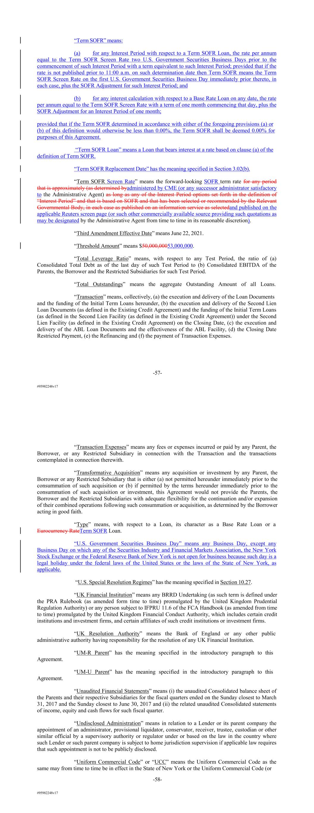 #95982248v17 “Term SOFR” means: (a) for any Interest Period with respect to a Term SOFR Loan, the rate per annum equal to the Term SOFR Screen Rate two U.S. Government Securities Business Days prior to the commencement of such Interest Period with a term equivalent to such Interest Period; provided that if the rate is not published prior to 11:00 a.m. on such determination date then Term SOFR means the Term SOFR Screen Rate on the first U.S. Government Securities Business Day immediately prior thereto, in each case, plus the SOFR Adjustment for such Interest Period; and (b) for any interest calculation with respect to a Base Rate Loan on any date, the rate per annum equal to the Term SOFR Screen Rate with a term of one month commencing that day, plus the SOFR Adjustment for an Interest Period of one month; provided that if the Term SOFR determined in accordance with either of the foregoing provisions (a) or (b) of this definition would otherwise be less than 0.00%, the Term SOFR shall be deemed 0.00% for purposes of this Agreement. “Term SOFR Loan” means a Loan that bears interest at a rate based on clause (a) of the definition of Term SOFR. “Term SOFR Replacement Date” has the meaning specified in Section 3.02(b). “Term SOFR Screen Rate” means the forward-looking SOFR term rate for any period that is approximately (as determined byadministered by CME (or any successor administrator satisfactory to the Administrative Agent) as long as any of the Interest Period options set forth in the definition of “Interest Period” and that is based on SOFR and that has been selected or recommended by the Relevant Governmental Body, in each case as published on an information service as selectedand published on the applicable Reuters screen page (or such other commercially available source providing such quotations as may be designated by the Administrative Agent from time to time in its reasonable discretion). “Third Amendment Effective Date” means June 22, 2021. “Threshold Amount” means $50,000,00053,000,000. “Total Leverage Ratio” means, with respect to any Test Period, the ratio of (a) Consolidated Total Debt as of the last day of such Test Period to (b) Consolidated EBITDA of the Parents, the Borrower and the Restricted Subsidiaries for such Test Period. “Total Outstandings” means the aggregate Outstanding Amount of all Loans. “Transaction” means, collectively, (a) the execution and delivery of the Loan Documents and the funding of the Initial Term Loans hereunder, (b) the execution and delivery of the Second Lien Loan Documents (as defined in the Existing Credit Agreement) and the funding of the Initial Term Loans (as defined in the Second Lien Facility (as defined in the Existing Credit Agreement)) under the Second Lien Facility (as defined in the Existing Credit Agreement) on the Closing Date, (c) the execution and delivery of the ABL Loan Documents and the effectiveness of the ABL Facility, (d) the Closing Date Restricted Payment, (e) the Refinancing and (f) the payment of Transaction Expenses. -57- #95982248v17 “Transaction Expenses” means any fees or expenses incurred or paid by any Parent, the Borrower, or any Restricted Subsidiary in connection with the Transaction and the transactions contemplated in connection therewith. “Transformative Acquisition” means any acquisition or investment by any Parent, the Borrower or any Restricted Subsidiary that is either (a) not permitted hereunder immediately prior to the consummation of such acquisition or (b) if permitted by the terms hereunder immediately prior to the consummation of such acquisition or investment, this Agreement would not provide the Parents, the Borrower and the Restricted Subsidiaries with adequate flexibility for the continuation and/or expansion of their combined operations following such consummation or acquisition, as determined by the Borrower acting in good faith. “Type” means, with respect to a Loan, its character as a Base Rate Loan or a Eurocurrency RateTerm SOFR Loan. “U.S. Government Securities Business Day” means any Business Day, except any Business Day on which any of the Securities Industry and Financial Markets Association, the New York Stock Exchange or the Federal Reserve Bank of New York is not open for business because such day is a legal holiday under the federal laws of the United States or the laws of the State of New York, as applicable. “U.S. Special Resolution Regimes” has the meaning specified in Section 10.27. “UK Financial Institution” means any BRRD Undertaking (as such term is defined under the PRA Rulebook (as amended form time to time) promulgated by the United Kingdom Prudential Regulation Authority) or any person subject to IFPRU 11.6 of the FCA Handbook (as amended from time to time) promulgated by the United Kingdom Financial Conduct Authority, which includes certain credit institutions and investment firms, and certain affiliates of such credit institutions or investment firms. “UK Resolution Authority” means the Bank of England or any other public administrative authority having responsibility for the resolution of any UK Financial Institution. “UM-R Parent” has the meaning specified in the introductory paragraph to this Agreement. “UM-U Parent” has the meaning specified in the introductory paragraph to this Agreement. “Unaudited Financial Statements” means (i) the unaudited Consolidated balance sheet of the Parents and their respective Subsidiaries for the fiscal quarters ended on the Sunday closest to March 31, 2017 and the Sunday closest to June 30, 2017 and (ii) the related unaudited Consolidated statements of income, equity and cash flows for such fiscal quarter. “Undisclosed Administration” means in relation to a Lender or its parent company the appointment of an administrator, provisional liquidator, conservator, receiver, trustee, custodian or other similar official by a supervisory authority or regul