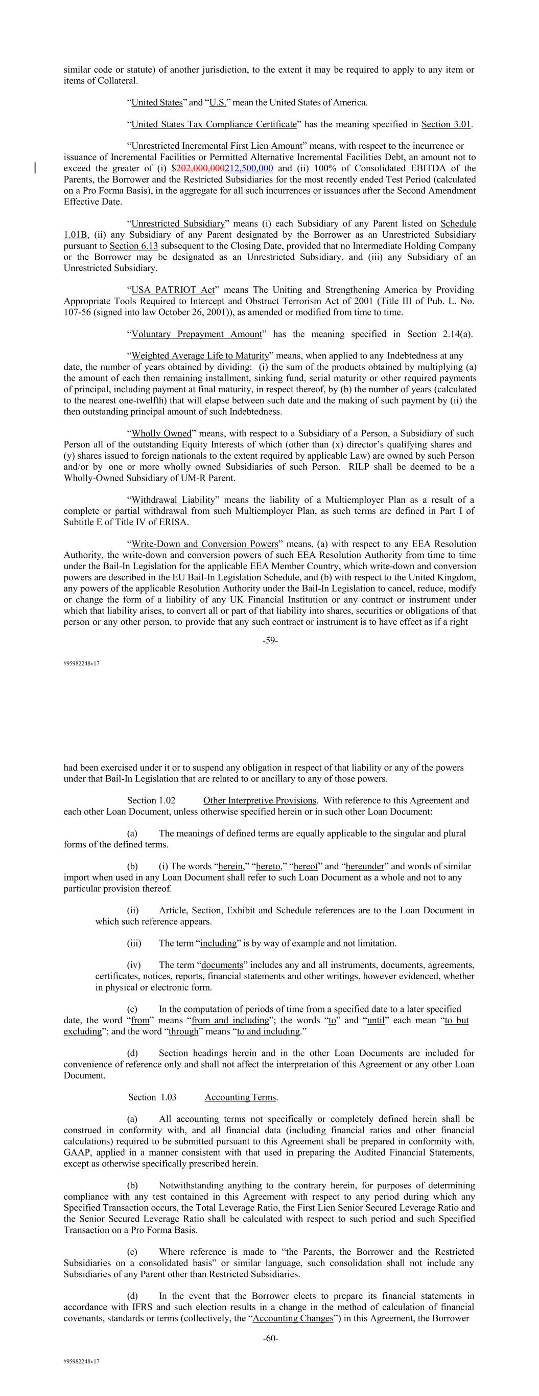 #95982248v17 similar code or statute) of another jurisdiction, to the extent it may be required to apply to any item or items of Collateral. “United States” and “U.S.” mean the United States of America. “United States Tax Compliance Certificate” has the meaning specified in Section 3.01. “Unrestricted Incremental First Lien Amount” means, with respect to the incurrence or issuance of Incremental Facilities or Permitted Alternative Incremental Facilities Debt, an amount not to exceed the greater of (i) $202,000,000212,500,000 and (ii) 100% of Consolidated EBITDA of the Parents, the Borrower and the Restricted Subsidiaries for the most recently ended Test Period (calculated on a Pro Forma Basis), in the aggregate for all such incurrences or issuances after the Second Amendment Effective Date. “Unrestricted Subsidiary” means (i) each Subsidiary of any Parent listed on Schedule 1.01B, (ii) any Subsidiary of any Parent designated by the Borrower as an Unrestricted Subsidiary pursuant to Section 6.13 subsequent to the Closing Date, provided that no Intermediate Holding Company or the Borrower may be designated as an Unrestricted Subsidiary, and (iii) any Subsidiary of an Unrestricted Subsidiary. “USA PATRIOT Act” means The Uniting and Strengthening America by Providing Appropriate Tools Required to Intercept and Obstruct Terrorism Act of 2001 (Title III of Pub. L. No. 107-56 (signed into law October 26, 2001)), as amended or modified from time to time. “Voluntary Prepayment Amount” has the meaning specified in Section 2.14(a). “Weighted Average Life to Maturity” means, when applied to any Indebtedness at any date, the number of years obtained by dividing: (i) the sum of the products obtained by multiplying (a) the amount of each then remaining installment, sinking fund, serial maturity or other required payments of principal, including payment at final maturity, in respect thereof, by (b) the number of years (calculated to the nearest one-twelfth) that will elapse between such date and the making of such payment by (ii) the then outstanding principal amount of such Indebtedness. “Wholly Owned” means, with respect to a Subsidiary of a Person, a Subsidiary of such Person all of the outstanding Equity Interests of which (other than (x) director’s qualifying shares and (y) shares issued to foreign nationals to the extent required by applicable Law) are owned by such Person and/or by one or more wholly owned Subsidiaries of such Person. RILP shall be deemed to be a Wholly-Owned Subsidiary of UM-R Parent. “Withdrawal Liability” means the liability of a Multiemployer Plan as a result of a complete or partial withdrawal from such Multiemployer Plan, as such terms are defined in Part I of Subtitle E of Title IV of ERISA. “Write-Down and Conversion Powers” means, (a) with respect to any EEA Resolution Authority, the write-down and conversion powers of such EEA Resolution Authority from time to time under the Bail-In Legislation for the applicable EEA Member Country, which write-down and conversion powers are described in the EU Bail-In Legislation Schedule, and (b) with respect to the United Kingdom, any powers of the applicable Resolution Authority under the Bail-In Legislation to cancel, reduce, modify or change the form of a liability of any UK Financial Institution or any contract or instrument under which that liability arises, to convert all or part of that liability into shares, securities or obligations of that person or any other person, to provide that any such contract or instrument is to have effect as if a right -59- #95982248v17 had been exercised under it or to suspend any obligation in respect of that liability or any of the powers under that Bail-In Legislation that are related to or ancillary to any of those powers. Section 1.02 Other Interpretive Provisions. With reference to this Agreement and each other Loan Document, unless otherwise specified herein or in such other Loan Document: (a) The meanings of defined terms are equally applicable to the singular and plural forms of the defined terms. (b) (i) The words “herein,” “hereto,” “hereof” and “hereunder” and words of similar import when used in any Loan Document shall refer to such Loan Document as a whole and not to any particular provision thereof. (ii) Article, Section, Exhibit and Schedule references are to the Loan Document in which such reference appears. (iii) The term “including” is by way of example and not limitation. (iv) The term “documents” includes any and all instruments, documents, agreements, certificates, notices, reports, financial statements and other writings, however evidenced, whether in physical or electronic form. (c) In the computation of periods of time from a specified date to a later specified date, the word “from” means “from and including”; the words “to” and “until” each mean “to but excluding”; and the word “through” means “to and including.” (d) Section headings herein and in the other Loan Documents are included for convenience of reference only and shall not affect the interpretation of this Agreement or any other Loan Document. Section 1.03 Accounting Terms. (a) All accounting terms not specifically or completely defined herein shall be construed in conformity with, and all financial data (including financial ratios and other financial calculations) required to be submitted pursuant to this Agreement shall be prepared in conformity with, GAAP, applied in a manner consistent with that used in preparing the Audited Financial Statements, except as otherwise specifically prescribed herein. (b) Notwithstanding anything to the contrary herein, for purposes of determining compliance with any test contained in this Agreement with respect to any period during which any Specified Transaction occurs, the Total Leverage Ratio, the First Lien Senior Secured Leverage Ratio and the Senior Secured Leverage Ratio sha