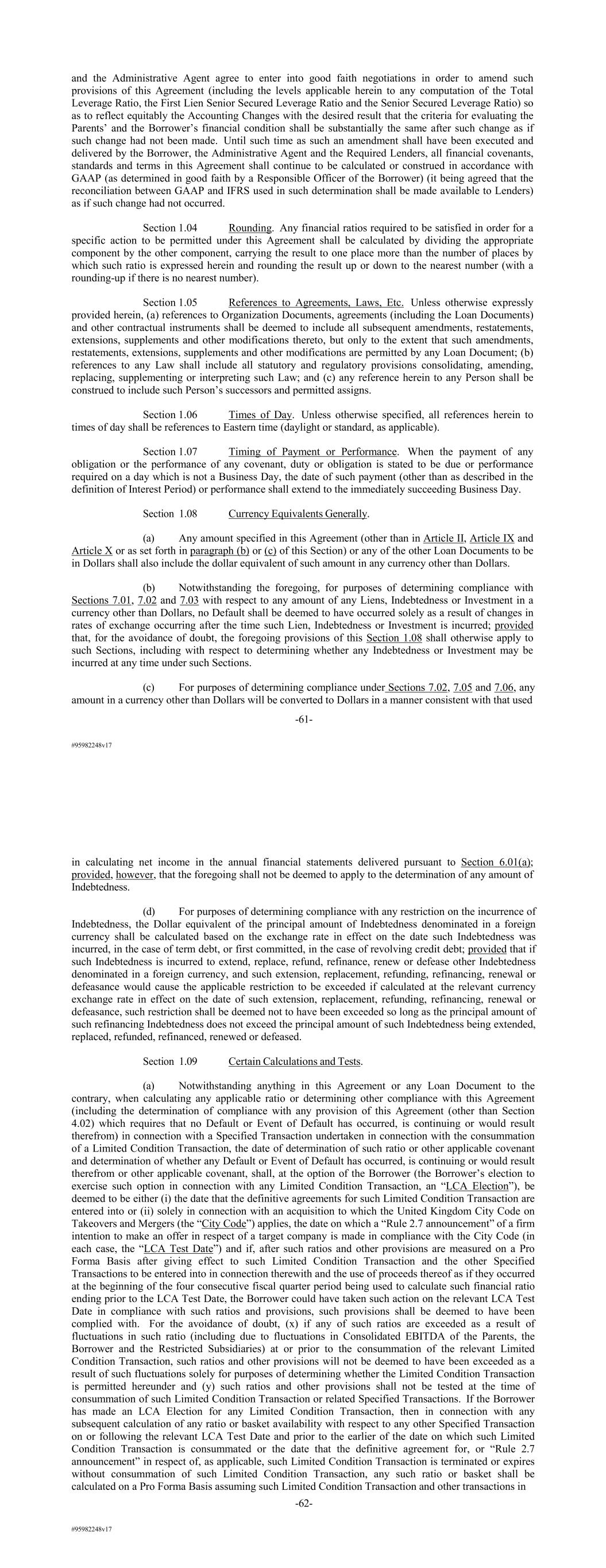 #95982248v17 and the Administrative Agent agree to enter into good faith negotiations in order to amend such provisions of this Agreement (including the levels applicable herein to any computation of the Total Leverage Ratio, the First Lien Senior Secured Leverage Ratio and the Senior Secured Leverage Ratio) so as to reflect equitably the Accounting Changes with the desired result that the criteria for evaluating the Parents’ and the Borrower’s financial condition shall be substantially the same after such change as if such change had not been made. Until such time as such an amendment shall have been executed and delivered by the Borrower, the Administrative Agent and the Required Lenders, all financial covenants, standards and terms in this Agreement shall continue to be calculated or construed in accordance with GAAP (as determined in good faith by a Responsible Officer of the Borrower) (it being agreed that the reconciliation between GAAP and IFRS used in such determination shall be made available to Lenders) as if such change had not occurred. Section 1.04 Rounding. Any financial ratios required to be satisfied in order for a specific action to be permitted under this Agreement shall be calculated by dividing the appropriate component by the other component, carrying the result to one place more than the number of places by which such ratio is expressed herein and rounding the result up or down to the nearest number (with a rounding-up if there is no nearest number). Section 1.05 References to Agreements, Laws, Etc. Unless otherwise expressly provided herein, (a) references to Organization Documents, agreements (including the Loan Documents) and other contractual instruments shall be deemed to include all subsequent amendments, restatements, extensions, supplements and other modifications thereto, but only to the extent that such amendments, restatements, extensions, supplements and other modifications are permitted by any Loan Document; (b) references to any Law shall include all statutory and regulatory provisions consolidating, amending, replacing, supplementing or interpreting such Law; and (c) any reference herein to any Person shall be construed to include such Person’s successors and permitted assigns. Section 1.06 Times of Day. Unless otherwise specified, all references herein to times of day shall be references to Eastern time (daylight or standard, as applicable). Section 1.07 Timing of Payment or Performance. When the payment of any obligation or the performance of any covenant, duty or obligation is stated to be due or performance required on a day which is not a Business Day, the date of such payment (other than as described in the definition of Interest Period) or performance shall extend to the immediately succeeding Business Day. Section 1.08 Currency Equivalents Generally. (a) Any amount specified in this Agreement (other than in Article II, Article IX and Article X or as set forth in paragraph (b) or (c) of this Section) or any of the other Loan Documents to be in Dollars shall also include the dollar equivalent of such amount in any currency other than Dollars. (b) Notwithstanding the foregoing, for purposes of determining compliance with Sections 7.01, 7.02 and 7.03 with respect to any amount of any Liens, Indebtedness or Investment in a currency other than Dollars, no Default shall be deemed to have occurred solely as a result of changes in rates of exchange occurring after the time such Lien, Indebtedness or Investment is incurred; provided that, for the avoidance of doubt, the foregoing provisions of this Section 1.08 shall otherwise apply to such Sections, including with respect to determining whether any Indebtedness or Investment may be incurred at any time under such Sections. (c) For purposes of determining compliance under Sections 7.02, 7.05 and 7.06, any amount in a currency other than Dollars will be converted to Dollars in a manner consistent with that used -61- #95982248v17 in calculating net income in the annual financial statements delivered pursuant to Section 6.01(a); provided, however, that the foregoing shall not be deemed to apply to the determination of any amount of Indebtedness. (d) For purposes of determining compliance with any restriction on the incurrence of Indebtedness, the Dollar equivalent of the principal amount of Indebtedness denominated in a foreign currency shall be calculated based on the exchange rate in effect on the date such Indebtedness was incurred, in the case of term debt, or first committed, in the case of revolving credit debt; provided that if such Indebtedness is incurred to extend, replace, refund, refinance, renew or defease other Indebtedness denominated in a foreign currency, and such extension, replacement, refunding, refinancing, renewal or defeasance would cause the applicable restriction to be exceeded if calculated at the relevant currency exchange rate in effect on the date of such extension, replacement, refunding, refinancing, renewal or defeasance, such restriction shall be deemed not to have been exceeded so long as the principal amount of such refinancing Indebtedness does not exceed the principal amount of such Indebtedness being extended, replaced, refunded, refinanced, renewed or defeased. Section 1.09 Certain Calculations and Tests. (a) Notwithstanding anything in this Agreement or any Loan Document to the contrary, when calculating any applicable ratio or determining other compliance with this Agreement (including the determination of compliance with any provision of this Agreement (other than Section 4.02) which requires that no Default or Event of Default has occurred, is continuing or would result therefrom) in connection with a Specified Transaction undertaken in connection with the consummation of a Limited Condition Transaction, the date of determination of such ratio or other applicable covenant and determination of whether any Default or Event of Default has occurred, is continuin