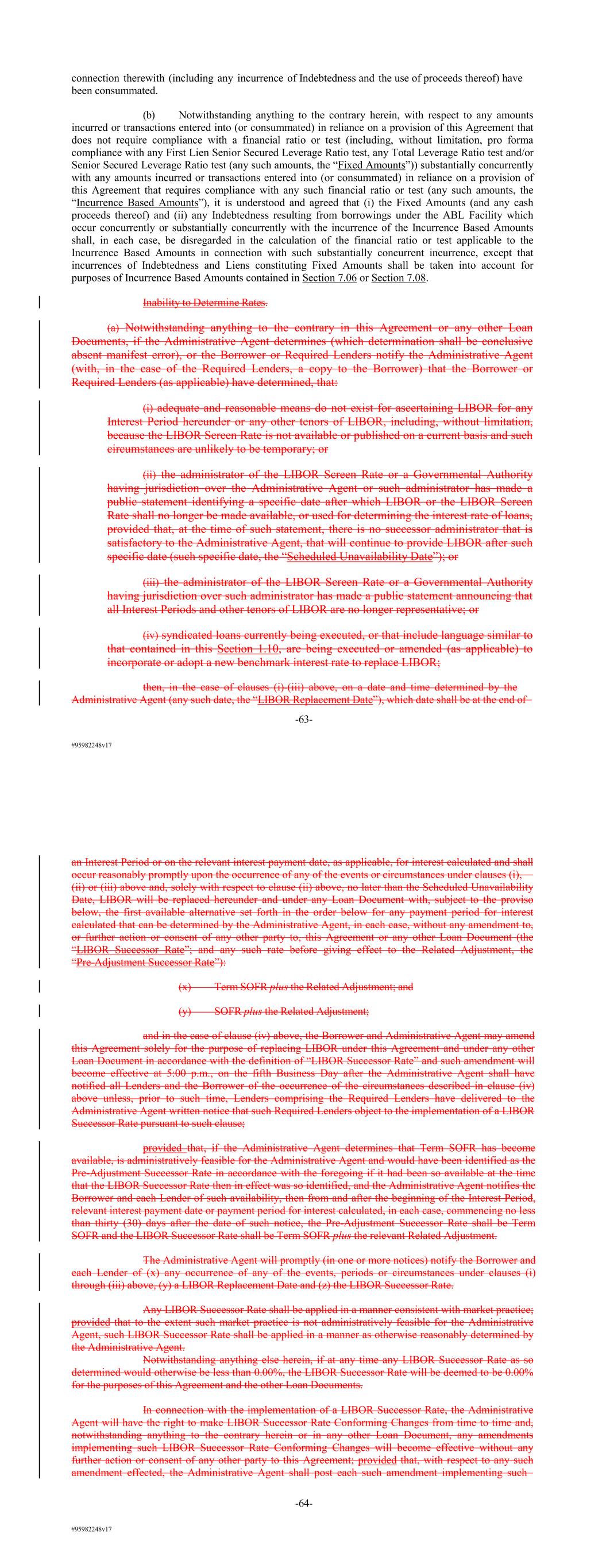 #95982248v17 connection therewith (including any incurrence of Indebtedness and the use of proceeds thereof) have been consummated. (b) Notwithstanding anything to the contrary herein, with respect to any amounts incurred or transactions entered into (or consummated) in reliance on a provision of this Agreement that does not require compliance with a financial ratio or test (including, without limitation, pro forma compliance with any First Lien Senior Secured Leverage Ratio test, any Total Leverage Ratio test and/or Senior Secured Leverage Ratio test (any such amounts, the “Fixed Amounts”)) substantially concurrently with any amounts incurred or transactions entered into (or consummated) in reliance on a provision of this Agreement that requires compliance with any such financial ratio or test (any such amounts, the “Incurrence Based Amounts”), it is understood and agreed that (i) the Fixed Amounts (and any cash proceeds thereof) and (ii) any Indebtedness resulting from borrowings under the ABL Facility which occur concurrently or substantially concurrently with the incurrence of the Incurrence Based Amounts shall, in each case, be disregarded in the calculation of the financial ratio or test applicable to the Incurrence Based Amounts in connection with such substantially concurrent incurrence, except that incurrences of Indebtedness and Liens constituting Fixed Amounts shall be taken into account for purposes of Incurrence Based Amounts contained in Section 7.06 or Section 7.08. Inability to Determine Rates. (a) Notwithstanding anything to the contrary in this Agreement or any other Loan Documents, if the Administrative Agent determines (which determination shall be conclusive absent manifest error), or the Borrower or Required Lenders notify the Administrative Agent (with, in the case of the Required Lenders, a copy to the Borrower) that the Borrower or Required Lenders (as applicable) have determined, that: (i) adequate and reasonable means do not exist for ascertaining LIBOR for any Interest Period hereunder or any other tenors of LIBOR, including, without limitation, because the LIBOR Screen Rate is not available or published on a current basis and such circumstances are unlikely to be temporary; or (ii) the administrator of the LIBOR Screen Rate or a Governmental Authority having jurisdiction over the Administrative Agent or such administrator has made a public statement identifying a specific date after which LIBOR or the LIBOR Screen Rate shall no longer be made available, or used for determining the interest rate of loans, provided that, at the time of such statement, there is no successor administrator that is satisfactory to the Administrative Agent, that will continue to provide LIBOR after such specific date (such specific date, the “Scheduled Unavailability Date”); or (iii) the administrator of the LIBOR Screen Rate or a Governmental Authority having jurisdiction over such administrator has made a public statement announcing that all Interest Periods and other tenors of LIBOR are no longer representative; or (iv) syndicated loans currently being executed, or that include language similar to that contained in this Section 1.10, are being executed or amended (as applicable) to incorporate or adopt a new benchmark interest rate to replace LIBOR; then, in the case of clauses (i)-(iii) above, on a date and time determined by the Administrative Agent (any such date, the “LIBOR Replacement Date”), which date shall be at the end of -63- #95982248v17 an Interest Period or on the relevant interest payment date, as applicable, for interest calculated and shall occur reasonably promptly upon the occurrence of any of the events or circumstances under clauses (i), (ii) or (iii) above and, solely with respect to clause (ii) above, no later than the Scheduled Unavailability Date, LIBOR will be replaced hereunder and under any Loan Document with, subject to the proviso below, the first available alternative set forth in the order below for any payment period for interest calculated that can be determined by the Administrative Agent, in each case, without any amendment to, or further action or consent of any other party to, this Agreement or any other Loan Document (the “LIBOR Successor Rate”; and any such rate before giving effect to the Related Adjustment, the “Pre-Adjustment Successor Rate”): (x) Term SOFR plus the Related Adjustment; and (y) SOFR plus the Related Adjustment; and in the case of clause (iv) above, the Borrower and Administrative Agent may amend this Agreement solely for the purpose of replacing LIBOR under this Agreement and under any other Loan Document in accordance with the definition of “LIBOR Successor Rate” and such amendment will become effective at 5:00 p.m., on the fifth Business Day after the Administrative Agent shall have notified all Lenders and the Borrower of the occurrence of the circumstances described in clause (iv) above unless, prior to such time, Lenders comprising the Required Lenders have delivered to the Administrative Agent written notice that such Required Lenders object to the implementation of a LIBOR Successor Rate pursuant to such clause; provided that, if the Administrative Agent determines that Term SOFR has become available, is administratively feasible for the Administrative Agent and would have been identified as the Pre-Adjustment Successor Rate in accordance with the foregoing if it had been so available at the time that the LIBOR Successor Rate then in effect was so identified, and the Administrative Agent notifies the Borrower and each Lender of such availability, then from and after the beginning of the Interest Period, relevant interest payment date or payment period for interest calculated, in each case, commencing no less than thirty (30) days after the date of such notice, the Pre-Adjustment Successor Rate shall be Term SOFR and the LIBOR Successor Rate shall be Term SOFR plus the relevant Related Adj