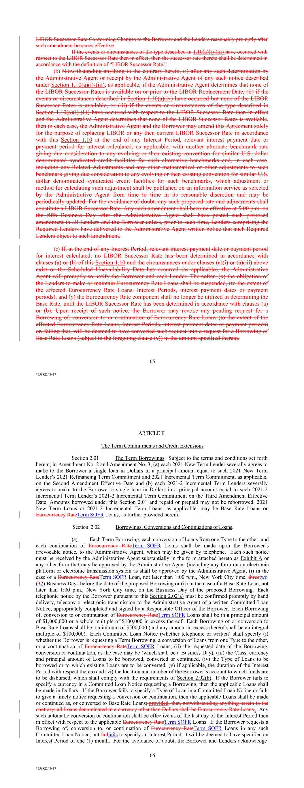 #95982248v17 LIBOR Successor Rate Conforming Changes to the Borrower and the Lenders reasonably promptly after such amendment becomes effective. If the events or circumstances of the type described in 1.10(a)(i)-(iii) have occurred with respect to the LIBOR Successor Rate then in effect, then the successor rate thereto shall be determined in accordance with the definition of “LIBOR Successor Rate.” (b) Notwithstanding anything to the contrary herein, (i) after any such determination by the Administrative Agent or receipt by the Administrative Agent of any such notice described under Section 1.10(a)(i)-(iii), as applicable, if the Administrative Agent determines that none of the LIBOR Successor Rates is available on or prior to the LIBOR Replacement Date, (ii) if the events or circumstances described in Section 1.10(a)(iv) have occurred but none of the LIBOR Successor Rates is available, or (iii) if the events or circumstances of the type described in Section 1.10(a)(i)-(iii) have occurred with respect to the LIBOR Successor Rate then in effect and the Administrative Agent determines that none of the LIBOR Successor Rates is available, then in each case, the Administrative Agent and the Borrower may amend this Agreement solely for the purpose of replacing LIBOR or any then current LIBOR Successor Rate in accordance with this Section 1.10 at the end of any Interest Period, relevant interest payment date or payment period for interest calculated, as applicable, with another alternate benchmark rate giving due consideration to any evolving or then existing convention for similar U.S. dollar denominated syndicated credit facilities for such alternative benchmarks and, in each case, including any Related Adjustments and any other mathematical or other adjustments to such benchmark giving due consideration to any evolving or then existing convention for similar U.S. dollar denominated syndicated credit facilities for such benchmarks, which adjustment or method for calculating such adjustment shall be published on an information service as selected by the Administrative Agent from time to time in its reasonable discretion and may be periodically updated. For the avoidance of doubt, any such proposed rate and adjustments shall constitute a LIBOR Successor Rate. Any such amendment shall become effective at 5:00 p.m. on the fifth Business Day after the Administrative Agent shall have posted such proposed amendment to all Lenders and the Borrower unless, prior to such time, Lenders comprising the Required Lenders have delivered to the Administrative Agent written notice that such Required Lenders object to such amendment. (c) If, at the end of any Interest Period, relevant interest payment date or payment period for interest calculated, no LIBOR Successor Rate has been determined in accordance with clauses (a) or (b) of this Section 1.10 and the circumstances under clauses (a)(i) or (a)(iii) above exist or the Scheduled Unavailability Date has occurred (as applicable), the Administrative Agent will promptly so notify the Borrower and each Lender. Thereafter, (x) the obligation of the Lenders to make or maintain Eurocurrency Rate Loans shall be suspended, (to the extent of the affected Eurocurrency Rate Loans, Interest Periods, interest payment dates or payment periods), and (y) the Eurocurrency Rate component shall no longer be utilized in determining the Base Rate, until the LIBOR Successor Rate has been determined in accordance with clauses (a) or (b). Upon receipt of such notice, the Borrower may revoke any pending request for a Borrowing of, conversion to or continuation of Eurocurrency Rate Loans (to the extent of the affected Eurocurrency Rate Loans, Interest Periods, interest payment dates or payment periods) or, failing that, will be deemed to have converted such request into a request for a Borrowing of Base Rate Loans (subject to the foregoing clause (y)) in the amount specified therein. -65- #95982248v17 ARTICLE II The Term Commitments and Credit Extensions Section 2.01 The Term Borrowings. Subject to the terms and conditions set forth herein, in Amendment No. 2 and Amendment No. 3, (a) each 2021 New Term Lender severally agrees to make to the Borrower a single loan in Dollars in a principal amount equal to such 2021 New Term Lender’s 2021 Refinancing Term Commitment and 2021 Incremental Term Commitment, as applicable, on the Second Amendment Effective Date and (b) each 2021-2 Incremental Term Lenders severally agrees to make to the Borrower a single loan in Dollars in a principal amount equal to such 2021-2 Incremental Term Lender’s 2021-2 Incremental Term Commitment on the Third Amendment Effective Date. Amounts borrowed under this Section 2.01 and repaid or prepaid may not be reborrowed. 2021 New Term Loans or 2021-2 Incremental Term Loans, as applicable, may be Base Rate Loans or Eurocurrency RateTerm SOFR Loans, as further provided herein. Section 2.02 Borrowings, Conversions and Continuations of Loans. (a) Each Term Borrowing, each conversion of Loans from one Type to the other, and each continuation of Eurocurrency RateTerm SOFR Loans shall be made upon the Borrower’s irrevocable notice, to the Administrative Agent, which may be given by telephone. Each such notice must be received by the Administrative Agent substantially in the form attached hereto as Exhibit A or any other form that may be approved by the Administrative Agent (including any form on an electronic platform or electronic transmission system as shall be approved by the Administrative Agent, (i) in the case of a Eurocurrency RateTerm SOFR Loan, not later than 1:00 p.m., New York City time, threetwo (32) Business Days before the date of the proposed Borrowing or (ii) in the case of a Base Rate Loan, not later than 1:00 p.m., New York City time, on the Business Day of the proposed Borrowing. Each telephonic notice by the Borrower pursuant to this Section 2.02(a) must be confirmed promptly by hand delivery, te