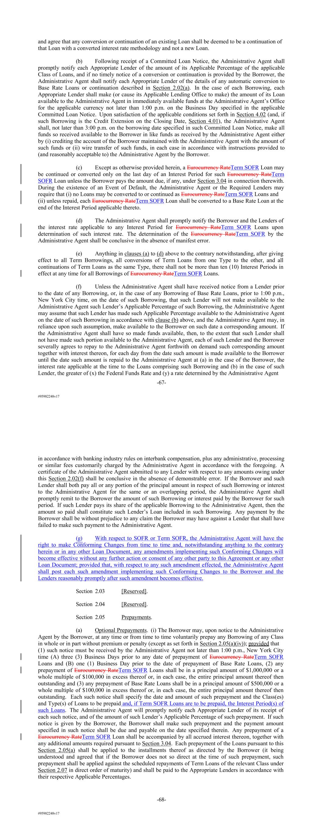 #95982248v17 and agree that any conversion or continuation of an existing Loan shall be deemed to be a continuation of that Loan with a converted interest rate methodology and not a new Loan. (b) Following receipt of a Committed Loan Notice, the Administrative Agent shall promptly notify each Appropriate Lender of the amount of its Applicable Percentage of the applicable Class of Loans, and if no timely notice of a conversion or continuation is provided by the Borrower, the Administrative Agent shall notify each Appropriate Lender of the details of any automatic conversion to Base Rate Loans or continuation described in Section 2.02(a). In the case of each Borrowing, each Appropriate Lender shall make (or cause its Applicable Lending Office to make) the amount of its Loan available to the Administrative Agent in immediately available funds at the Administrative Agent’s Office for the applicable currency not later than 1:00 p.m. on the Business Day specified in the applicable Committed Loan Notice. Upon satisfaction of the applicable conditions set forth in Section 4.02 (and, if such Borrowing is the Credit Extension on the Closing Date, Section 4.01), the Administrative Agent shall, not later than 3:00 p.m. on the borrowing date specified in such Committed Loan Notice, make all funds so received available to the Borrower in like funds as received by the Administrative Agent either by (i) crediting the account of the Borrower maintained with the Administrative Agent with the amount of such funds or (ii) wire transfer of such funds, in each case in accordance with instructions provided to (and reasonably acceptable to) the Administrative Agent by the Borrower. (c) Except as otherwise provided herein, a Eurocurrency RateTerm SOFR Loan may be continued or converted only on the last day of an Interest Period for such Eurocurrency RateTerm SOFR Loan unless the Borrower pays the amount due, if any, under Section 3.04 in connection therewith. During the existence of an Event of Default, the Administrative Agent or the Required Lenders may require that (i) no Loans may be converted to or continued as Eurocurrency RateTerm SOFR Loans and (ii) unless repaid, each Eurocurrency RateTerm SOFR Loan shall be converted to a Base Rate Loan at the end of the Interest Period applicable thereto. (d) The Administrative Agent shall promptly notify the Borrower and the Lenders of the interest rate applicable to any Interest Period for Eurocurrency RateTerm SOFR Loans upon determination of such interest rate. The determination of the Eurocurrency RateTerm SOFR by the Administrative Agent shall be conclusive in the absence of manifest error. (e) Anything in clauses (a) to (d) above to the contrary notwithstanding, after giving effect to all Term Borrowings, all conversions of Term Loans from one Type to the other, and all continuations of Term Loans as the same Type, there shall not be more than ten (10) Interest Periods in effect at any time for all Borrowings of Eurocurrency RateTerm SOFR Loans. (f) Unless the Administrative Agent shall have received notice from a Lender prior to the date of any Borrowing, or, in the case of any Borrowing of Base Rate Loans, prior to 1:00 p.m., New York City time, on the date of such Borrowing, that such Lender will not make available to the Administrative Agent such Lender’s Applicable Percentage of such Borrowing, the Administrative Agent may assume that such Lender has made such Applicable Percentage available to the Administrative Agent on the date of such Borrowing in accordance with clause (b) above, and the Administrative Agent may, in reliance upon such assumption, make available to the Borrower on such date a corresponding amount. If the Administrative Agent shall have so made funds available, then, to the extent that such Lender shall not have made such portion available to the Administrative Agent, each of such Lender and the Borrower severally agrees to repay to the Administrative Agent forthwith on demand such corresponding amount together with interest thereon, for each day from the date such amount is made available to the Borrower until the date such amount is repaid to the Administrative Agent at (a) in the case of the Borrower, the interest rate applicable at the time to the Loans comprising such Borrowing and (b) in the case of such Lender, the greater of (x) the Federal Funds Rate and (y) a rate determined by the Administrative Agent -67- #95982248v17 in accordance with banking industry rules on interbank compensation, plus any administrative, processing or similar fees customarily charged by the Administrative Agent in accordance with the foregoing. A certificate of the Administrative Agent submitted to any Lender with respect to any amounts owing under this Section 2.02(f) shall be conclusive in the absence of demonstrable error. If the Borrower and such Lender shall both pay all or any portion of the principal amount in respect of such Borrowing or interest to the Administrative Agent for the same or an overlapping period, the Administrative Agent shall promptly remit to the Borrower the amount of such Borrowing or interest paid by the Borrower for such period. If such Lender pays its share of the applicable Borrowing to the Administrative Agent, then the amount so paid shall constitute such Lender’s Loan included in such Borrowing. Any payment by the Borrower shall be without prejudice to any claim the Borrower may have against a Lender that shall have failed to make such payment to the Administrative Agent. (g) With respect to SOFR or Term SOFR, the Administrative Agent will have the right to make Conforming Changes from time to time and, notwithstanding anything to the contrary herein or in any other Loan Document, any amendments implementing such Conforming Changes will become effective without any further action or consent of any other party to this Agreement or any other Loan Document; provided that, with respect to any such amendment effected