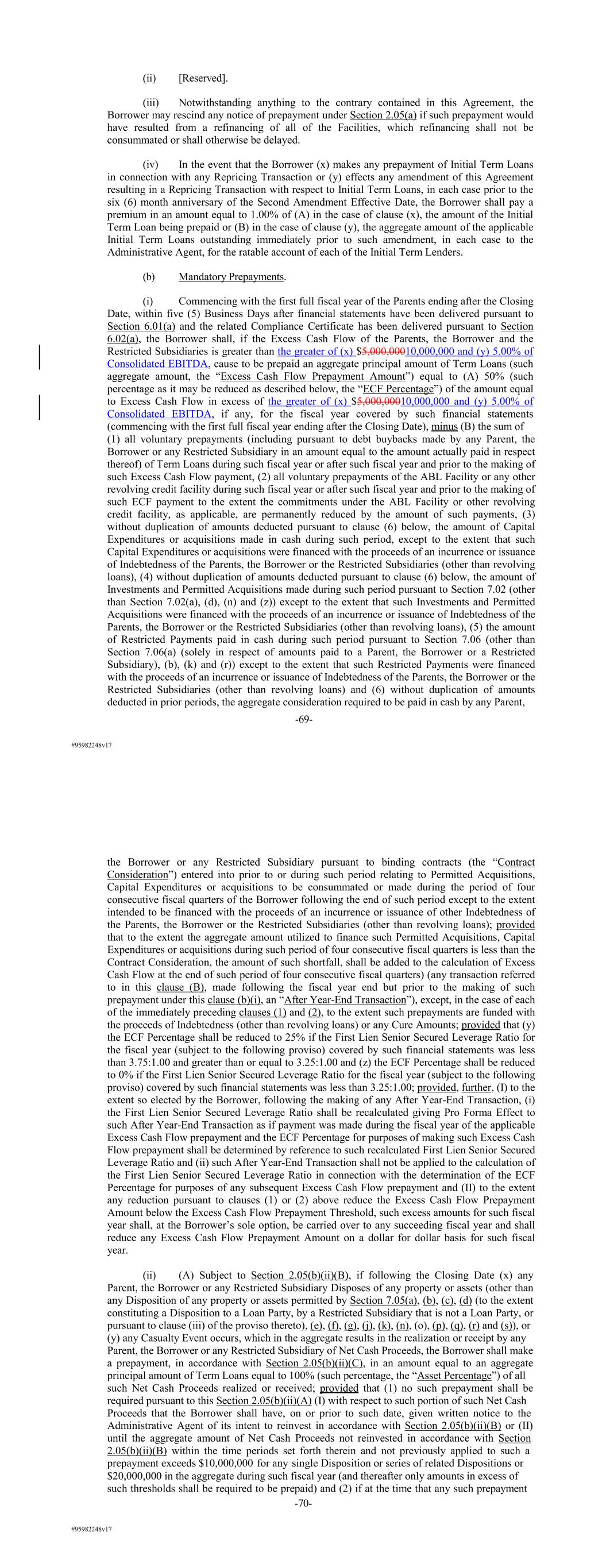 #95982248v17 (ii) [Reserved]. (iii) Notwithstanding anything to the contrary contained in this Agreement, the Borrower may rescind any notice of prepayment under Section 2.05(a) if such prepayment would have resulted from a refinancing of all of the Facilities, which refinancing shall not be consummated or shall otherwise be delayed. (iv) In the event that the Borrower (x) makes any prepayment of Initial Term Loans in connection with any Repricing Transaction or (y) effects any amendment of this Agreement resulting in a Repricing Transaction with respect to Initial Term Loans, in each case prior to the six (6) month anniversary of the Second Amendment Effective Date, the Borrower shall pay a premium in an amount equal to 1.00% of (A) in the case of clause (x), the amount of the Initial Term Loan being prepaid or (B) in the case of clause (y), the aggregate amount of the applicable Initial Term Loans outstanding immediately prior to such amendment, in each case to the Administrative Agent, for the ratable account of each of the Initial Term Lenders. (b) Mandatory Prepayments. (i) Commencing with the first full fiscal year of the Parents ending after the Closing Date, within five (5) Business Days after financial statements have been delivered pursuant to Section 6.01(a) and the related Compliance Certificate has been delivered pursuant to Section 6.02(a), the Borrower shall, if the Excess Cash Flow of the Parents, the Borrower and the Restricted Subsidiaries is greater than the greater of (x) $5,000,00010,000,000 and (y) 5.00% of Consolidated EBITDA, cause to be prepaid an aggregate principal amount of Term Loans (such aggregate amount, the “Excess Cash Flow Prepayment Amount”) equal to (A) 50% (such percentage as it may be reduced as described below, the “ECF Percentage”) of the amount equal to Excess Cash Flow in excess of the greater of (x) $5,000,00010,000,000 and (y) 5.00% of Consolidated EBITDA, if any, for the fiscal year covered by such financial statements (commencing with the first full fiscal year ending after the Closing Date), minus (B) the sum of (1) all voluntary prepayments (including pursuant to debt buybacks made by any Parent, the Borrower or any Restricted Subsidiary in an amount equal to the amount actually paid in respect thereof) of Term Loans during such fiscal year or after such fiscal year and prior to the making of such Excess Cash Flow payment, (2) all voluntary prepayments of the ABL Facility or any other revolving credit facility during such fiscal year or after such fiscal year and prior to the making of such ECF payment to the extent the commitments under the ABL Facility or other revolving credit facility, as applicable, are permanently reduced by the amount of such payments, (3) without duplication of amounts deducted pursuant to clause (6) below, the amount of Capital Expenditures or acquisitions made in cash during such period, except to the extent that such Capital Expenditures or acquisitions were financed with the proceeds of an incurrence or issuance of Indebtedness of the Parents, the Borrower or the Restricted Subsidiaries (other than revolving loans), (4) without duplication of amounts deducted pursuant to clause (6) below, the amount of Investments and Permitted Acquisitions made during such period pursuant to Section 7.02 (other than Section 7.02(a), (d), (n) and (z)) except to the extent that such Investments and Permitted Acquisitions were financed with the proceeds of an incurrence or issuance of Indebtedness of the Parents, the Borrower or the Restricted Subsidiaries (other than revolving loans), (5) the amount of Restricted Payments paid in cash during such period pursuant to Section 7.06 (other than Section 7.06(a) (solely in respect of amounts paid to a Parent, the Borrower or a Restricted Subsidiary), (b), (k) and (r)) except to the extent that such Restricted Payments were financed with the proceeds of an incurrence or issuance of Indebtedness of the Parents, the Borrower or the Restricted Subsidiaries (other than revolving loans) and (6) without duplication of amounts deducted in prior periods, the aggregate consideration required to be paid in cash by any Parent, -69- #95982248v17 the Borrower or any Restricted Subsidiary pursuant to binding contracts (the “Contract Consideration”) entered into prior to or during such period relating to Permitted Acquisitions, Capital Expenditures or acquisitions to be consummated or made during the period of four consecutive fiscal quarters of the Borrower following the end of such period except to the extent intended to be financed with the proceeds of an incurrence or issuance of other Indebtedness of the Parents, the Borrower or the Restricted Subsidiaries (other than revolving loans); provided that to the extent the aggregate amount utilized to finance such Permitted Acquisitions, Capital Expenditures or acquisitions during such period of four consecutive fiscal quarters is less than the Contract Consideration, the amount of such shortfall, shall be added to the calculation of Excess Cash Flow at the end of such period of four consecutive fiscal quarters) (any transaction referred to in this clause (B), made following the fiscal year end but prior to the making of such prepayment under this clause (b)(i), an “After Year-End Transaction”), except, in the case of each of the immediately preceding clauses (1) and (2), to the extent such prepayments are funded with the proceeds of Indebtedness (other than revolving loans) or any Cure Amounts; provided that (y) the ECF Percentage shall be reduced to 25% if the First Lien Senior Secured Leverage Ratio for the fiscal year (subject to the following proviso) covered by such financial statements was less than 3.75:1.00 and greater than or equal to 3.25:1.00 and (z) the ECF Percentage shall be reduced to 0% if the First Lien Senior Secured Leverage Ratio for the fiscal year (subject to the following proviso) covered by such financial statem