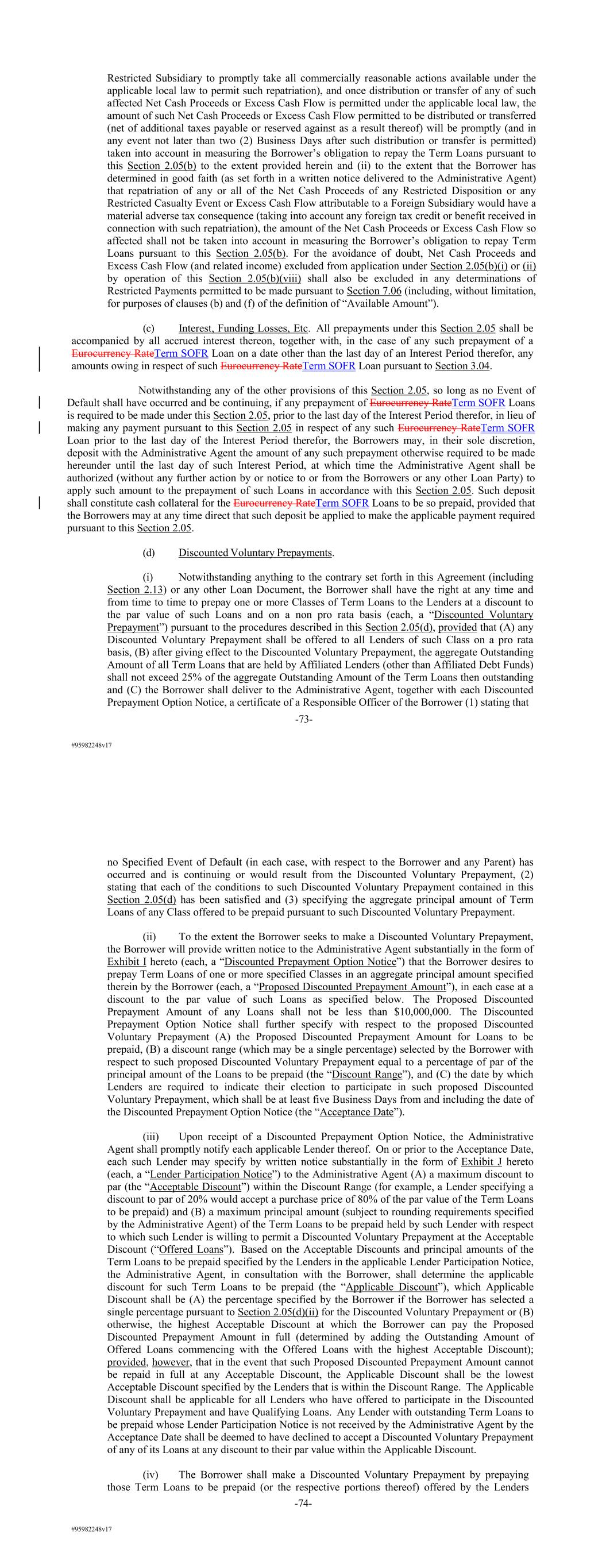 #95982248v17 Restricted Subsidiary to promptly take all commercially reasonable actions available under the applicable local law to permit such repatriation), and once distribution or transfer of any of such affected Net Cash Proceeds or Excess Cash Flow is permitted under the applicable local law, the amount of such Net Cash Proceeds or Excess Cash Flow permitted to be distributed or transferred (net of additional taxes payable or reserved against as a result thereof) will be promptly (and in any event not later than two (2) Business Days after such distribution or transfer is permitted) taken into account in measuring the Borrower’s obligation to repay the Term Loans pursuant to this Section 2.05(b) to the extent provided herein and (ii) to the extent that the Borrower has determined in good faith (as set forth in a written notice delivered to the Administrative Agent) that repatriation of any or all of the Net Cash Proceeds of any Restricted Disposition or any Restricted Casualty Event or Excess Cash Flow attributable to a Foreign Subsidiary would have a material adverse tax consequence (taking into account any foreign tax credit or benefit received in connection with such repatriation), the amount of the Net Cash Proceeds or Excess Cash Flow so affected shall not be taken into account in measuring the Borrower’s obligation to repay Term Loans pursuant to this Section 2.05(b). For the avoidance of doubt, Net Cash Proceeds and Excess Cash Flow (and related income) excluded from application under Section 2.05(b)(i) or (ii) by operation of this Section 2.05(b)(viii) shall also be excluded in any determinations of Restricted Payments permitted to be made pursuant to Section 7.06 (including, without limitation, for purposes of clauses (b) and (f) of the definition of “Available Amount”). (c) Interest, Funding Losses, Etc. All prepayments under this Section 2.05 shall be accompanied by all accrued interest thereon, together with, in the case of any such prepayment of a Eurocurrency RateTerm SOFR Loan on a date other than the last day of an Interest Period therefor, any amounts owing in respect of such Eurocurrency RateTerm SOFR Loan pursuant to Section 3.04. Notwithstanding any of the other provisions of this Section 2.05, so long as no Event of Default shall have occurred and be continuing, if any prepayment of Eurocurrency RateTerm SOFR Loans is required to be made under this Section 2.05, prior to the last day of the Interest Period therefor, in lieu of making any payment pursuant to this Section 2.05 in respect of any such Eurocurrency RateTerm SOFR Loan prior to the last day of the Interest Period therefor, the Borrowers may, in their sole discretion, deposit with the Administrative Agent the amount of any such prepayment otherwise required to be made hereunder until the last day of such Interest Period, at which time the Administrative Agent shall be authorized (without any further action by or notice to or from the Borrowers or any other Loan Party) to apply such amount to the prepayment of such Loans in accordance with this Section 2.05. Such deposit shall constitute cash collateral for the Eurocurrency RateTerm SOFR Loans to be so prepaid, provided that the Borrowers may at any time direct that such deposit be applied to make the applicable payment required pursuant to this Section 2.05. (d) Discounted Voluntary Prepayments. (i) Notwithstanding anything to the contrary set forth in this Agreement (including Section 2.13) or any other Loan Document, the Borrower shall have the right at any time and from time to time to prepay one or more Classes of Term Loans to the Lenders at a discount to the par value of such Loans and on a non pro rata basis (each, a “Discounted Voluntary Prepayment”) pursuant to the procedures described in this Section 2.05(d), provided that (A) any Discounted Voluntary Prepayment shall be offered to all Lenders of such Class on a pro rata basis, (B) after giving effect to the Discounted Voluntary Prepayment, the aggregate Outstanding Amount of all Term Loans that are held by Affiliated Lenders (other than Affiliated Debt Funds) shall not exceed 25% of the aggregate Outstanding Amount of the Term Loans then outstanding and (C) the Borrower shall deliver to the Administrative Agent, together with each Discounted Prepayment Option Notice, a certificate of a Responsible Officer of the Borrower (1) stating that -73- #95982248v17 no Specified Event of Default (in each case, with respect to the Borrower and any Parent) has occurred and is continuing or would result from the Discounted Voluntary Prepayment, (2) stating that each of the conditions to such Discounted Voluntary Prepayment contained in this Section 2.05(d) has been satisfied and (3) specifying the aggregate principal amount of Term Loans of any Class offered to be prepaid pursuant to such Discounted Voluntary Prepayment. (ii) To the extent the Borrower seeks to make a Discounted Voluntary Prepayment, the Borrower will provide written notice to the Administrative Agent substantially in the form of Exhibit I hereto (each, a “Discounted Prepayment Option Notice”) that the Borrower desires to prepay Term Loans of one or more specified Classes in an aggregate principal amount specified therein by the Borrower (each, a “Proposed Discounted Prepayment Amount”), in each case at a discount to the par value of such Loans as specified below. The Proposed Discounted Prepayment Amount of any Loans shall not be less than $10,000,000. The Discounted Prepayment Option Notice shall further specify with respect to the proposed Discounted Voluntary Prepayment (A) the Proposed Discounted Prepayment Amount for Loans to be prepaid, (B) a discount range (which may be a single percentage) selected by the Borrower with respect to such proposed Discounted Voluntary Prepayment equal to a percentage of par of the principal amount of the Loans to be prepaid (the “Discount Range”), and (C) the date by which Len