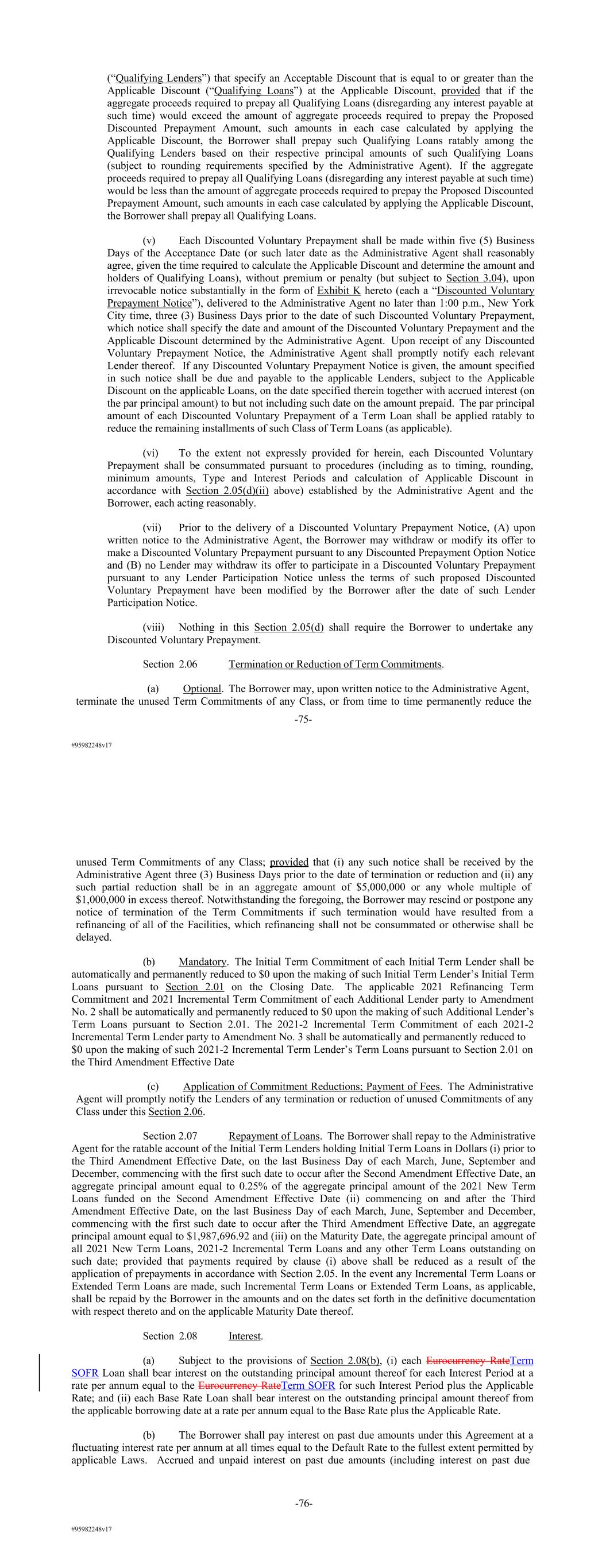 #95982248v17 (“Qualifying Lenders”) that specify an Acceptable Discount that is equal to or greater than the Applicable Discount (“Qualifying Loans”) at the Applicable Discount, provided that if the aggregate proceeds required to prepay all Qualifying Loans (disregarding any interest payable at such time) would exceed the amount of aggregate proceeds required to prepay the Proposed Discounted Prepayment Amount, such amounts in each case calculated by applying the Applicable Discount, the Borrower shall prepay such Qualifying Loans ratably among the Qualifying Lenders based on their respective principal amounts of such Qualifying Loans (subject to rounding requirements specified by the Administrative Agent). If the aggregate proceeds required to prepay all Qualifying Loans (disregarding any interest payable at such time) would be less than the amount of aggregate proceeds required to prepay the Proposed Discounted Prepayment Amount, such amounts in each case calculated by applying the Applicable Discount, the Borrower shall prepay all Qualifying Loans. (v) Each Discounted Voluntary Prepayment shall be made within five (5) Business Days of the Acceptance Date (or such later date as the Administrative Agent shall reasonably agree, given the time required to calculate the Applicable Discount and determine the amount and holders of Qualifying Loans), without premium or penalty (but subject to Section 3.04), upon irrevocable notice substantially in the form of Exhibit K hereto (each a “Discounted Voluntary Prepayment Notice”), delivered to the Administrative Agent no later than 1:00 p.m., New York City time, three (3) Business Days prior to the date of such Discounted Voluntary Prepayment, which notice shall specify the date and amount of the Discounted Voluntary Prepayment and the Applicable Discount determined by the Administrative Agent. Upon receipt of any Discounted Voluntary Prepayment Notice, the Administrative Agent shall promptly notify each relevant Lender thereof. If any Discounted Voluntary Prepayment Notice is given, the amount specified in such notice shall be due and payable to the applicable Lenders, subject to the Applicable Discount on the applicable Loans, on the date specified therein together with accrued interest (on the par principal amount) to but not including such date on the amount prepaid. The par principal amount of each Discounted Voluntary Prepayment of a Term Loan shall be applied ratably to reduce the remaining installments of such Class of Term Loans (as applicable). (vi) To the extent not expressly provided for herein, each Discounted Voluntary Prepayment shall be consummated pursuant to procedures (including as to timing, rounding, minimum amounts, Type and Interest Periods and calculation of Applicable Discount in accordance with Section 2.05(d)(ii) above) established by the Administrative Agent and the Borrower, each acting reasonably. (vii) Prior to the delivery of a Discounted Voluntary Prepayment Notice, (A) upon written notice to the Administrative Agent, the Borrower may withdraw or modify its offer to make a Discounted Voluntary Prepayment pursuant to any Discounted Prepayment Option Notice and (B) no Lender may withdraw its offer to participate in a Discounted Voluntary Prepayment pursuant to any Lender Participation Notice unless the terms of such proposed Discounted Voluntary Prepayment have been modified by the Borrower after the date of such Lender Participation Notice. (viii) Nothing in this Section 2.05(d) shall require the Borrower to undertake any Discounted Voluntary Prepayment. Section 2.06 Termination or Reduction of Term Commitments. (a) Optional. The Borrower may, upon written notice to the Administrative Agent, terminate the unused Term Commitments of any Class, or from time to time permanently reduce the -75- #95982248v17 unused Term Commitments of any Class; provided that (i) any such notice shall be received by the Administrative Agent three (3) Business Days prior to the date of termination or reduction and (ii) any such partial reduction shall be in an aggregate amount of $5,000,000 or any whole multiple of $1,000,000 in excess thereof. Notwithstanding the foregoing, the Borrower may rescind or postpone any notice of termination of the Term Commitments if such termination would have resulted from a refinancing of all of the Facilities, which refinancing shall not be consummated or otherwise shall be delayed. (b) Mandatory. The Initial Term Commitment of each Initial Term Lender shall be automatically and permanently reduced to $0 upon the making of such Initial Term Lender’s Initial Term Loans pursuant to Section 2.01 on the Closing Date. The applicable 2021 Refinancing Term Commitment and 2021 Incremental Term Commitment of each Additional Lender party to Amendment No. 2 shall be automatically and permanently reduced to $0 upon the making of such Additional Lender’s Term Loans pursuant to Section 2.01. The 2021-2 Incremental Term Commitment of each 2021-2 Incremental Term Lender party to Amendment No. 3 shall be automatically and permanently reduced to $0 upon the making of such 2021-2 Incremental Term Lender’s Term Loans pursuant to Section 2.01 on the Third Amendment Effective Date (c) Application of Commitment Reductions; Payment of Fees. The Administrative Agent will promptly notify the Lenders of any termination or reduction of unused Commitments of any Class under this Section 2.06. Section 2.07 Repayment of Loans. The Borrower shall repay to the Administrative Agent for the ratable account of the Initial Term Lenders holding Initial Term Loans in Dollars (i) prior to the Third Amendment Effective Date, on the last Business Day of each March, June, September and December, commencing with the first such date to occur after the Second Amendment Effective Date, an aggregate principal amount equal to 0.25% of the aggregate principal amount of the 2021 New Term Loans funded on the Second Amendment Effective Dat
