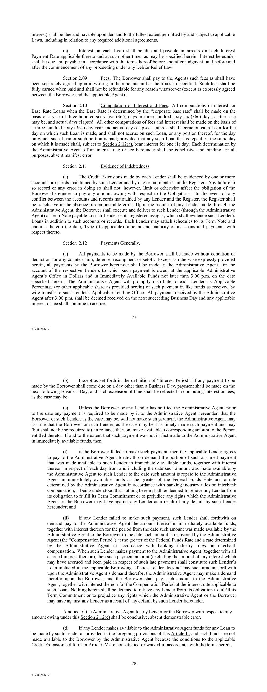 #95982248v17 interest) shall be due and payable upon demand to the fullest extent permitted by and subject to applicable Laws, including in relation to any required additional agreements. (c) Interest on each Loan shall be due and payable in arrears on each Interest Payment Date applicable thereto and at such other times as may be specified herein. Interest hereunder shall be due and payable in accordance with the terms hereof before and after judgment, and before and after the commencement of any proceeding under any Debtor Relief Law. Section 2.09 Fees. The Borrower shall pay to the Agents such fees as shall have been separately agreed upon in writing in the amounts and at the times so specified. Such fees shall be fully earned when paid and shall not be refundable for any reason whatsoever (except as expressly agreed between the Borrower and the applicable Agent). Section 2.10 Computation of Interest and Fees. All computations of interest for Base Rate Loans when the Base Rate is determined by the “corporate base rate” shall be made on the basis of a year of three hundred sixty five (365) days or three hundred sixty six (366) days, as the case may be, and actual days elapsed. All other computations of fees and interest shall be made on the basis of a three hundred sixty (360) day year and actual days elapsed. Interest shall accrue on each Loan for the day on which such Loan is made, and shall not accrue on such Loan, or any portion thereof, for the day on which such Loan or such portion is paid; provided that any such Loan that is repaid on the same day on which it is made shall, subject to Section 2.12(a), bear interest for one (1) day. Each determination by the Administrative Agent of an interest rate or fee hereunder shall be conclusive and binding for all purposes, absent manifest error. Section 2.11 Evidence of Indebtedness. (a) The Credit Extensions made by each Lender shall be evidenced by one or more accounts or records maintained by such Lender and by one or more entries in the Register. Any failure to so record or any error in doing so shall not, however, limit or otherwise affect the obligation of the Borrower hereunder to pay any amount owing with respect to the Obligations. In the event of any conflict between the accounts and records maintained by any Lender and the Register, the Register shall be conclusive in the absence of demonstrable error. Upon the request of any Lender made through the Administrative Agent, the Borrower shall execute and deliver to such Lender (through the Administrative Agent) a Term Note payable to such Lender or its registered assigns, which shall evidence such Lender’s Loans in addition to such accounts or records. Each Lender may attach schedules to its Term Note and endorse thereon the date, Type (if applicable), amount and maturity of its Loans and payments with respect thereto. Section 2.12 Payments Generally. (a) All payments to be made by the Borrower shall be made without condition or deduction for any counterclaim, defense, recoupment or setoff. Except as otherwise expressly provided herein, all payments by the Borrower hereunder shall be made to the Administrative Agent, for the account of the respective Lenders to which such payment is owed, at the applicable Administrative Agent’s Office in Dollars and in Immediately Available Funds not later than 3:00 p.m. on the date specified herein. The Administrative Agent will promptly distribute to each Lender its Applicable Percentage (or other applicable share as provided herein) of such payment in like funds as received by wire transfer to such Lender’s Applicable Lending Office. All payments received by the Administrative Agent after 3:00 p.m. shall be deemed received on the next succeeding Business Day and any applicable interest or fee shall continue to accrue. -77- #95982248v17 (b) Except as set forth in the definition of “Interest Period”, if any payment to be made by the Borrower shall come due on a day other than a Business Day, payment shall be made on the next following Business Day, and such extension of time shall be reflected in computing interest or fees, as the case may be. (c) Unless the Borrower or any Lender has notified the Administrative Agent, prior to the date any payment is required to be made by it to the Administrative Agent hereunder, that the Borrower or such Lender, as the case may be, will not make such payment, the Administrative Agent may assume that the Borrower or such Lender, as the case may be, has timely made such payment and may (but shall not be so required to), in reliance thereon, make available a corresponding amount to the Person entitled thereto. If and to the extent that such payment was not in fact made to the Administrative Agent in immediately available funds, then: (i) if the Borrower failed to make such payment, then the applicable Lender agrees to pay to the Administrative Agent forthwith on demand the portion of such assumed payment that was made available to such Lender in immediately available funds, together with interest thereon in respect of each day from and including the date such amount was made available by the Administrative Agent to such Lender to the date such amount is repaid to the Administrative Agent in immediately available funds at the greater of the Federal Funds Rate and a rate determined by the Administrative Agent in accordance with banking industry rules on interbank compensation, it being understood that nothing herein shall be deemed to relieve any Lender from its obligation to fulfill its Term Commitment or to prejudice any rights which the Administrative Agent or the Borrower may have against any Lender as a result of any default by such Lender hereunder; and (ii) if any Lender failed to make such payment, such Lender shall forthwith on demand pay to the Administrative Agent the amount thereof in immediately available funds, together with interest thereon for the period from the date such amount was 
