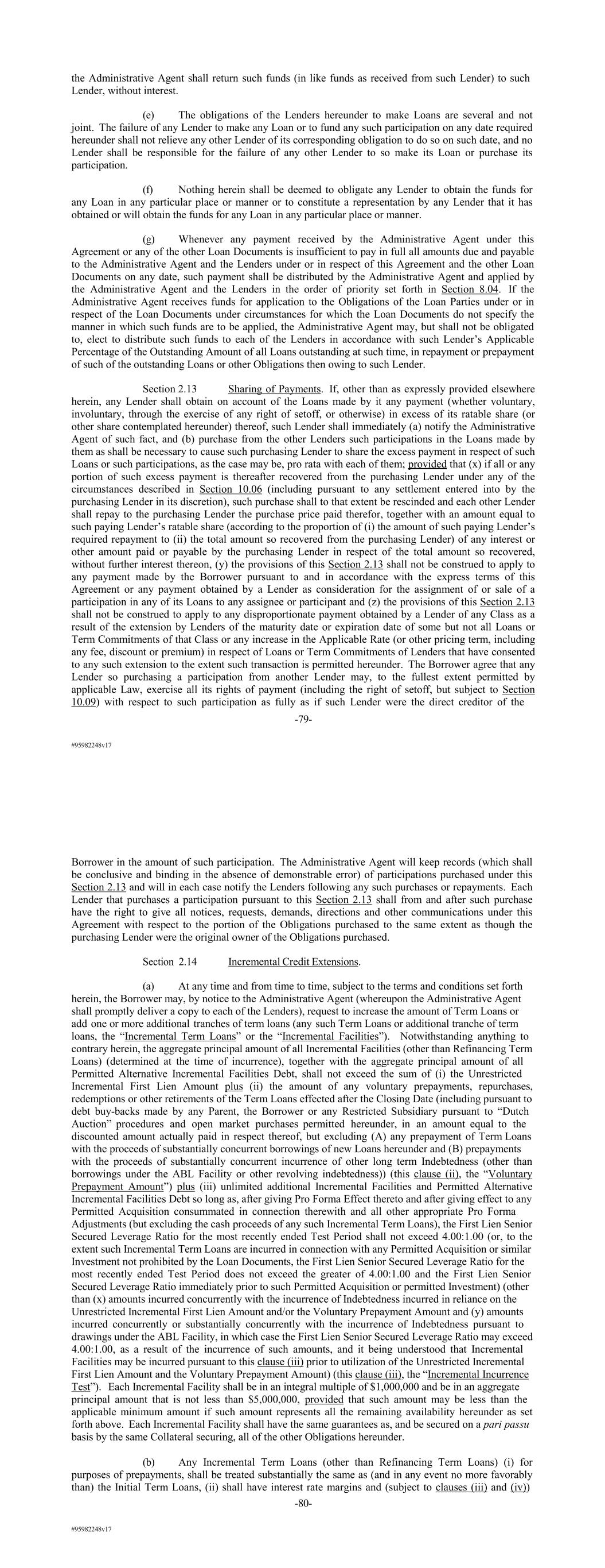 #95982248v17 the Administrative Agent shall return such funds (in like funds as received from such Lender) to such Lender, without interest. (e) The obligations of the Lenders hereunder to make Loans are several and not joint. The failure of any Lender to make any Loan or to fund any such participation on any date required hereunder shall not relieve any other Lender of its corresponding obligation to do so on such date, and no Lender shall be responsible for the failure of any other Lender to so make its Loan or purchase its participation. (f) Nothing herein shall be deemed to obligate any Lender to obtain the funds for any Loan in any particular place or manner or to constitute a representation by any Lender that it has obtained or will obtain the funds for any Loan in any particular place or manner. (g) Whenever any payment received by the Administrative Agent under this Agreement or any of the other Loan Documents is insufficient to pay in full all amounts due and payable to the Administrative Agent and the Lenders under or in respect of this Agreement and the other Loan Documents on any date, such payment shall be distributed by the Administrative Agent and applied by the Administrative Agent and the Lenders in the order of priority set forth in Section 8.04. If the Administrative Agent receives funds for application to the Obligations of the Loan Parties under or in respect of the Loan Documents under circumstances for which the Loan Documents do not specify the manner in which such funds are to be applied, the Administrative Agent may, but shall not be obligated to, elect to distribute such funds to each of the Lenders in accordance with such Lender’s Applicable Percentage of the Outstanding Amount of all Loans outstanding at such time, in repayment or prepayment of such of the outstanding Loans or other Obligations then owing to such Lender. Section 2.13 Sharing of Payments. If, other than as expressly provided elsewhere herein, any Lender shall obtain on account of the Loans made by it any payment (whether voluntary, involuntary, through the exercise of any right of setoff, or otherwise) in excess of its ratable share (or other share contemplated hereunder) thereof, such Lender shall immediately (a) notify the Administrative Agent of such fact, and (b) purchase from the other Lenders such participations in the Loans made by them as shall be necessary to cause such purchasing Lender to share the excess payment in respect of such Loans or such participations, as the case may be, pro rata with each of them; provided that (x) if all or any portion of such excess payment is thereafter recovered from the purchasing Lender under any of the circumstances described in Section 10.06 (including pursuant to any settlement entered into by the purchasing Lender in its discretion), such purchase shall to that extent be rescinded and each other Lender shall repay to the purchasing Lender the purchase price paid therefor, together with an amount equal to such paying Lender’s ratable share (according to the proportion of (i) the amount of such paying Lender’s required repayment to (ii) the total amount so recovered from the purchasing Lender) of any interest or other amount paid or payable by the purchasing Lender in respect of the total amount so recovered, without further interest thereon, (y) the provisions of this Section 2.13 shall not be construed to apply to any payment made by the Borrower pursuant to and in accordance with the express terms of this Agreement or any payment obtained by a Lender as consideration for the assignment of or sale of a participation in any of its Loans to any assignee or participant and (z) the provisions of this Section 2.13 shall not be construed to apply to any disproportionate payment obtained by a Lender of any Class as a result of the extension by Lenders of the maturity date or expiration date of some but not all Loans or Term Commitments of that Class or any increase in the Applicable Rate (or other pricing term, including any fee, discount or premium) in respect of Loans or Term Commitments of Lenders that have consented to any such extension to the extent such transaction is permitted hereunder. The Borrower agree that any Lender so purchasing a participation from another Lender may, to the fullest extent permitted by applicable Law, exercise all its rights of payment (including the right of setoff, but subject to Section 10.09) with respect to such participation as fully as if such Lender were the direct creditor of the -79- #95982248v17 Borrower in the amount of such participation. The Administrative Agent will keep records (which shall be conclusive and binding in the absence of demonstrable error) of participations purchased under this Section 2.13 and will in each case notify the Lenders following any such purchases or repayments. Each Lender that purchases a participation pursuant to this Section 2.13 shall from and after such purchase have the right to give all notices, requests, demands, directions and other communications under this Agreement with respect to the portion of the Obligations purchased to the same extent as though the purchasing Lender were the original owner of the Obligations purchased. Section 2.14 Incremental Credit Extensions. (a) At any time and from time to time, subject to the terms and conditions set forth herein, the Borrower may, by notice to the Administrative Agent (whereupon the Administrative Agent shall promptly deliver a copy to each of the Lenders), request to increase the amount of Term Loans or add one or more additional tranches of term loans (any such Term Loans or additional tranche of term loans, the “Incremental Term Loans” or the “Incremental Facilities”). Notwithstanding anything to contrary herein, the aggregate principal amount of all Incremental Facilities (other than Refinancing Term Loans) (determined at the time of incurrence), together with the aggregate principal amount of all Permi
