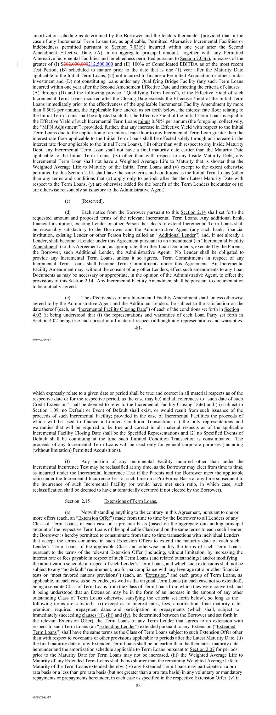 #95982248v17 amortization schedule as determined by the Borrower and the lenders thereunder (provided that in the case of any Incremental Term Loans (or, as applicable, Permitted Alternative Incremental Facilities or Indebtedness permitted pursuant to Section 7.03(r)) incurred within one year after the Second Amendment Effective Date, (A) in an aggregate principal amount, together with any Permitted Alternative Incremental Facilities and Indebtedness permitted pursuant to Section 7.03(r), in excess of the greater of (I) $202,000,000212,500,000 and (II) 100% of Consolidated EBITDA as of the most recent Test Period, (B) scheduled to mature prior to the date that is one (1) year after the Maturity Date applicable to the Initial Term Loans, (C) not incurred to finance a Permitted Acquisition or other similar Investment and (D) not constituting loans under any Qualifying Bridge Facility (any such Term Loans incurred within one year after the Second Amendment Effective Date and meeting the criteria of clauses (A) through (D) and the following proviso, “Qualifying Term Loans”), if the Effective Yield of such Incremental Term Loans incurred after the Closing Date exceeds the Effective Yield of the Initial Term Loans immediately prior to the effectiveness of the applicable Incremental Facility Amendment by more than 0.50% per annum, the Applicable Rate and/or, as set forth below, the interest rate floor relating to the Initial Term Loans shall be adjusted such that the Effective Yield of the Initial Term Loans is equal to the Effective Yield of such Incremental Term Loans minus 0.50% per annum (the foregoing, collectively, the “MFN Adjustment”); provided, further, that any increase in Effective Yield with respect to the Initial Term Loans due to the application of an interest rate floor to any Incremental Term Loan greater than the interest rate floor applicable to the Initial Term Loans shall be effected solely through an increase in the interest rate floor applicable to the Initial Term Loans), (iii) other than with respect to any Inside Maturity Debt, any Incremental Term Loan shall not have a final maturity date earlier than the Maturity Date applicable to the Initial Term Loans, (iv) other than with respect to any Inside Maturity Debt, any Incremental Term Loan shall not have a Weighted Average Life to Maturity that is shorter than the Weighted Average Life to Maturity of the Initial Term Loans and (v) except to the extent otherwise permitted by this Section 2.14, shall have the same terms and conditions as the Initial Term Loans (other than any terms and conditions that (x) apply only to periods after the then Latest Maturity Date with respect to the Term Loans, (y) are otherwise added for the benefit of the Term Lenders hereunder or (z) are otherwise reasonably satisfactory to the Administrative Agent). (c) [Reserved]. (d) Each notice from the Borrower pursuant to this Section 2.14 shall set forth the requested amount and proposed terms of the relevant Incremental Term Loans. Any additional bank, financial institution, existing Lender or other Person that elects to extend Incremental Term Loans shall be reasonably satisfactory to the Borrower and the Administrative Agent (any such bank, financial institution, existing Lender or other Person being called an “Additional Lender”) and, if not already a Lender, shall become a Lender under this Agreement pursuant to an amendment (an “Incremental Facility Amendment”) to this Agreement and, as appropriate, the other Loan Documents, executed by the Parents, the Borrower, such Additional Lender, the Administrative Agent. No Lender shall be obligated to provide any Incremental Term Loans, unless it so agrees. Term Commitments in respect of any Incremental Term Loans shall become Term Commitments under this Agreement. An Incremental Facility Amendment may, without the consent of any other Lenders, effect such amendments to any Loan Documents as may be necessary or appropriate, in the opinion of the Administrative Agent, to effect the provisions of this Section 2.14. Any Incremental Facility Amendment shall be pursuant to documentation to be mutually agreed. (e) The effectiveness of any Incremental Facility Amendment shall, unless otherwise agreed to by the Administrative Agent and the Additional Lenders, be subject to the satisfaction on the date thereof (each, an “Incremental Facility Closing Date”) of each of the conditions set forth in Section 4.02 (it being understood that (i) the representations and warranties of each Loan Party set forth in Section 4.02 being true and correct in all material respect (although any representations and warranties -81- #95982248v17 which expressly relate to a given date or period shall be true and correct in all material respects as of the respective date or for the respective period, as the case may be) and all references to “such date of such Credit Extension” shall be deemed to refer to the Incremental Facility Closing Date) and (ii) subject to Section 1.09, no Default or Event of Default shall exist, or would result from such issuance of the proceeds of such Incremental Facility; provided in the case of Incremental Facilities the proceeds of which will be used to finance a Limited Condition Transaction, (1) the only representations and warranties that will be required to be true and correct in all material respects as of the applicable Incremental Facility Closing Date shall be the Specified Representations and (2) no Specified Events of Default shall be continuing at the time such Limited Condition Transaction is consummated. The proceeds of any Incremental Term Loans will be used only for general corporate purposes (including (without limitation) Permitted Acquisitions). (f) Any portion of any Incremental Facility incurred other than under the Incremental Incurrence Test may be reclassified at any time, as the Borrower may elect from time to time, as incurred under the Incremental Incur