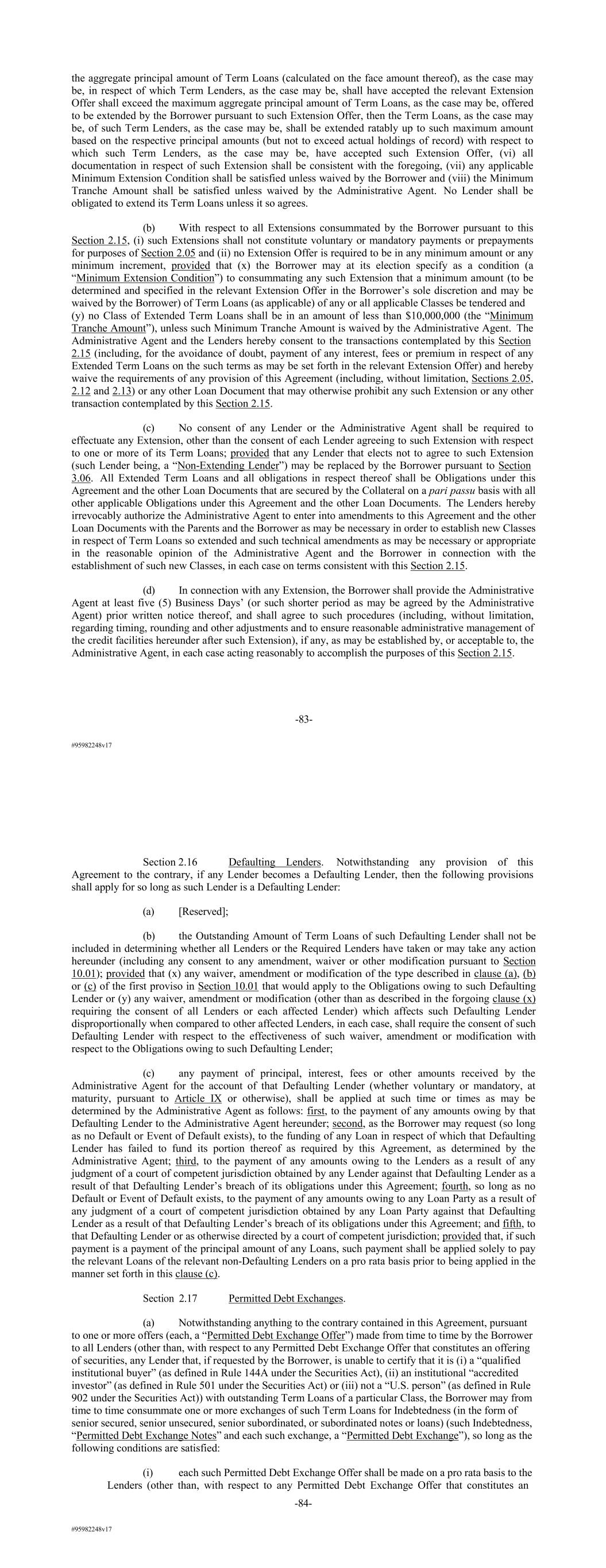 #95982248v17 the aggregate principal amount of Term Loans (calculated on the face amount thereof), as the case may be, in respect of which Term Lenders, as the case may be, shall have accepted the relevant Extension Offer shall exceed the maximum aggregate principal amount of Term Loans, as the case may be, offered to be extended by the Borrower pursuant to such Extension Offer, then the Term Loans, as the case may be, of such Term Lenders, as the case may be, shall be extended ratably up to such maximum amount based on the respective principal amounts (but not to exceed actual holdings of record) with respect to which such Term Lenders, as the case may be, have accepted such Extension Offer, (vi) all documentation in respect of such Extension shall be consistent with the foregoing, (vii) any applicable Minimum Extension Condition shall be satisfied unless waived by the Borrower and (viii) the Minimum Tranche Amount shall be satisfied unless waived by the Administrative Agent. No Lender shall be obligated to extend its Term Loans unless it so agrees. (b) With respect to all Extensions consummated by the Borrower pursuant to this Section 2.15, (i) such Extensions shall not constitute voluntary or mandatory payments or prepayments for purposes of Section 2.05 and (ii) no Extension Offer is required to be in any minimum amount or any minimum increment, provided that (x) the Borrower may at its election specify as a condition (a “Minimum Extension Condition”) to consummating any such Extension that a minimum amount (to be determined and specified in the relevant Extension Offer in the Borrower’s sole discretion and may be waived by the Borrower) of Term Loans (as applicable) of any or all applicable Classes be tendered and (y) no Class of Extended Term Loans shall be in an amount of less than $10,000,000 (the “Minimum Tranche Amount”), unless such Minimum Tranche Amount is waived by the Administrative Agent. The Administrative Agent and the Lenders hereby consent to the transactions contemplated by this Section 2.15 (including, for the avoidance of doubt, payment of any interest, fees or premium in respect of any Extended Term Loans on the such terms as may be set forth in the relevant Extension Offer) and hereby waive the requirements of any provision of this Agreement (including, without limitation, Sections 2.05, 2.12 and 2.13) or any other Loan Document that may otherwise prohibit any such Extension or any other transaction contemplated by this Section 2.15. (c) No consent of any Lender or the Administrative Agent shall be required to effectuate any Extension, other than the consent of each Lender agreeing to such Extension with respect to one or more of its Term Loans; provided that any Lender that elects not to agree to such Extension (such Lender being, a “Non-Extending Lender”) may be replaced by the Borrower pursuant to Section 3.06. All Extended Term Loans and all obligations in respect thereof shall be Obligations under this Agreement and the other Loan Documents that are secured by the Collateral on a pari passu basis with all other applicable Obligations under this Agreement and the other Loan Documents. The Lenders hereby irrevocably authorize the Administrative Agent to enter into amendments to this Agreement and the other Loan Documents with the Parents and the Borrower as may be necessary in order to establish new Classes in respect of Term Loans so extended and such technical amendments as may be necessary or appropriate in the reasonable opinion of the Administrative Agent and the Borrower in connection with the establishment of such new Classes, in each case on terms consistent with this Section 2.15. (d) In connection with any Extension, the Borrower shall provide the Administrative Agent at least five (5) Business Days’ (or such shorter period as may be agreed by the Administrative Agent) prior written notice thereof, and shall agree to such procedures (including, without limitation, regarding timing, rounding and other adjustments and to ensure reasonable administrative management of the credit facilities hereunder after such Extension), if any, as may be established by, or acceptable to, the Administrative Agent, in each case acting reasonably to accomplish the purposes of this Section 2.15. -83- #95982248v17 Section 2.16 Defaulting Lenders. Notwithstanding any provision of this Agreement to the contrary, if any Lender becomes a Defaulting Lender, then the following provisions shall apply for so long as such Lender is a Defaulting Lender: (a) [Reserved]; (b) the Outstanding Amount of Term Loans of such Defaulting Lender shall not be included in determining whether all Lenders or the Required Lenders have taken or may take any action hereunder (including any consent to any amendment, waiver or other modification pursuant to Section 10.01); provided that (x) any waiver, amendment or modification of the type described in clause (a), (b) or (c) of the first proviso in Section 10.01 that would apply to the Obligations owing to such Defaulting Lender or (y) any waiver, amendment or modification (other than as described in the forgoing clause (x) requiring the consent of all Lenders or each affected Lender) which affects such Defaulting Lender disproportionally when compared to other affected Lenders, in each case, shall require the consent of such Defaulting Lender with respect to the effectiveness of such waiver, amendment or modification with respect to the Obligations owing to such Defaulting Lender; (c) any payment of principal, interest, fees or other amounts received by the Administrative Agent for the account of that Defaulting Lender (whether voluntary or mandatory, at maturity, pursuant to Article IX or otherwise), shall be applied at such time or times as may be determined by the Administrative Agent as follows: first, to the payment of any amounts owing by that Defaulting Lender to the Administrative Agent hereunder; second, as the Borrower may re