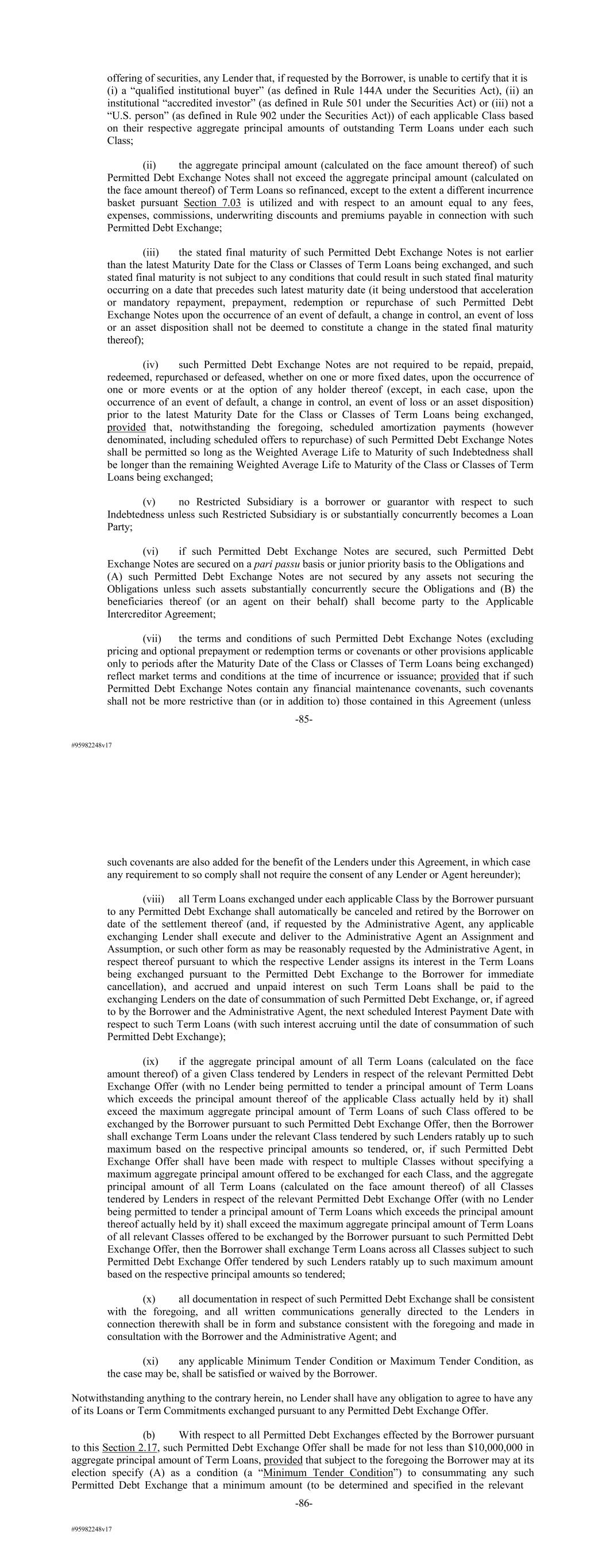 #95982248v17 offering of securities, any Lender that, if requested by the Borrower, is unable to certify that it is (i) a “qualified institutional buyer” (as defined in Rule 144A under the Securities Act), (ii) an institutional “accredited investor” (as defined in Rule 501 under the Securities Act) or (iii) not a “U.S. person” (as defined in Rule 902 under the Securities Act)) of each applicable Class based on their respective aggregate principal amounts of outstanding Term Loans under each such Class; (ii) the aggregate principal amount (calculated on the face amount thereof) of such Permitted Debt Exchange Notes shall not exceed the aggregate principal amount (calculated on the face amount thereof) of Term Loans so refinanced, except to the extent a different incurrence basket pursuant Section 7.03 is utilized and with respect to an amount equal to any fees, expenses, commissions, underwriting discounts and premiums payable in connection with such Permitted Debt Exchange; (iii) the stated final maturity of such Permitted Debt Exchange Notes is not earlier than the latest Maturity Date for the Class or Classes of Term Loans being exchanged, and such stated final maturity is not subject to any conditions that could result in such stated final maturity occurring on a date that precedes such latest maturity date (it being understood that acceleration or mandatory repayment, prepayment, redemption or repurchase of such Permitted Debt Exchange Notes upon the occurrence of an event of default, a change in control, an event of loss or an asset disposition shall not be deemed to constitute a change in the stated final maturity thereof); (iv) such Permitted Debt Exchange Notes are not required to be repaid, prepaid, redeemed, repurchased or defeased, whether on one or more fixed dates, upon the occurrence of one or more events or at the option of any holder thereof (except, in each case, upon the occurrence of an event of default, a change in control, an event of loss or an asset disposition) prior to the latest Maturity Date for the Class or Classes of Term Loans being exchanged, provided that, notwithstanding the foregoing, scheduled amortization payments (however denominated, including scheduled offers to repurchase) of such Permitted Debt Exchange Notes shall be permitted so long as the Weighted Average Life to Maturity of such Indebtedness shall be longer than the remaining Weighted Average Life to Maturity of the Class or Classes of Term Loans being exchanged; (v) no Restricted Subsidiary is a borrower or guarantor with respect to such Indebtedness unless such Restricted Subsidiary is or substantially concurrently becomes a Loan Party; (vi) if such Permitted Debt Exchange Notes are secured, such Permitted Debt Exchange Notes are secured on a pari passu basis or junior priority basis to the Obligations and (A) such Permitted Debt Exchange Notes are not secured by any assets not securing the Obligations unless such assets substantially concurrently secure the Obligations and (B) the beneficiaries thereof (or an agent on their behalf) shall become party to the Applicable Intercreditor Agreement; (vii) the terms and conditions of such Permitted Debt Exchange Notes (excluding pricing and optional prepayment or redemption terms or covenants or other provisions applicable only to periods after the Maturity Date of the Class or Classes of Term Loans being exchanged) reflect market terms and conditions at the time of incurrence or issuance; provided that if such Permitted Debt Exchange Notes contain any financial maintenance covenants, such covenants shall not be more restrictive than (or in addition to) those contained in this Agreement (unless -85- #95982248v17 such covenants are also added for the benefit of the Lenders under this Agreement, in which case any requirement to so comply shall not require the consent of any Lender or Agent hereunder); (viii) all Term Loans exchanged under each applicable Class by the Borrower pursuant to any Permitted Debt Exchange shall automatically be canceled and retired by the Borrower on date of the settlement thereof (and, if requested by the Administrative Agent, any applicable exchanging Lender shall execute and deliver to the Administrative Agent an Assignment and Assumption, or such other form as may be reasonably requested by the Administrative Agent, in respect thereof pursuant to which the respective Lender assigns its interest in the Term Loans being exchanged pursuant to the Permitted Debt Exchange to the Borrower for immediate cancellation), and accrued and unpaid interest on such Term Loans shall be paid to the exchanging Lenders on the date of consummation of such Permitted Debt Exchange, or, if agreed to by the Borrower and the Administrative Agent, the next scheduled Interest Payment Date with respect to such Term Loans (with such interest accruing until the date of consummation of such Permitted Debt Exchange); (ix) if the aggregate principal amount of all Term Loans (calculated on the face amount thereof) of a given Class tendered by Lenders in respect of the relevant Permitted Debt Exchange Offer (with no Lender being permitted to tender a principal amount of Term Loans which exceeds the principal amount thereof of the applicable Class actually held by it) shall exceed the maximum aggregate principal amount of Term Loans of such Class offered to be exchanged by the Borrower pursuant to such Permitted Debt Exchange Offer, then the Borrower shall exchange Term Loans under the relevant Class tendered by such Lenders ratably up to such maximum based on the respective principal amounts so tendered, or, if such Permitted Debt Exchange Offer shall have been made with respect to multiple Classes without specifying a maximum aggregate principal amount offered to be exchanged for each Class, and the aggregate principal amount of all Term Loans (calculated on the face amount thereof) of all Classes tendered by Lenders in respect of the relev