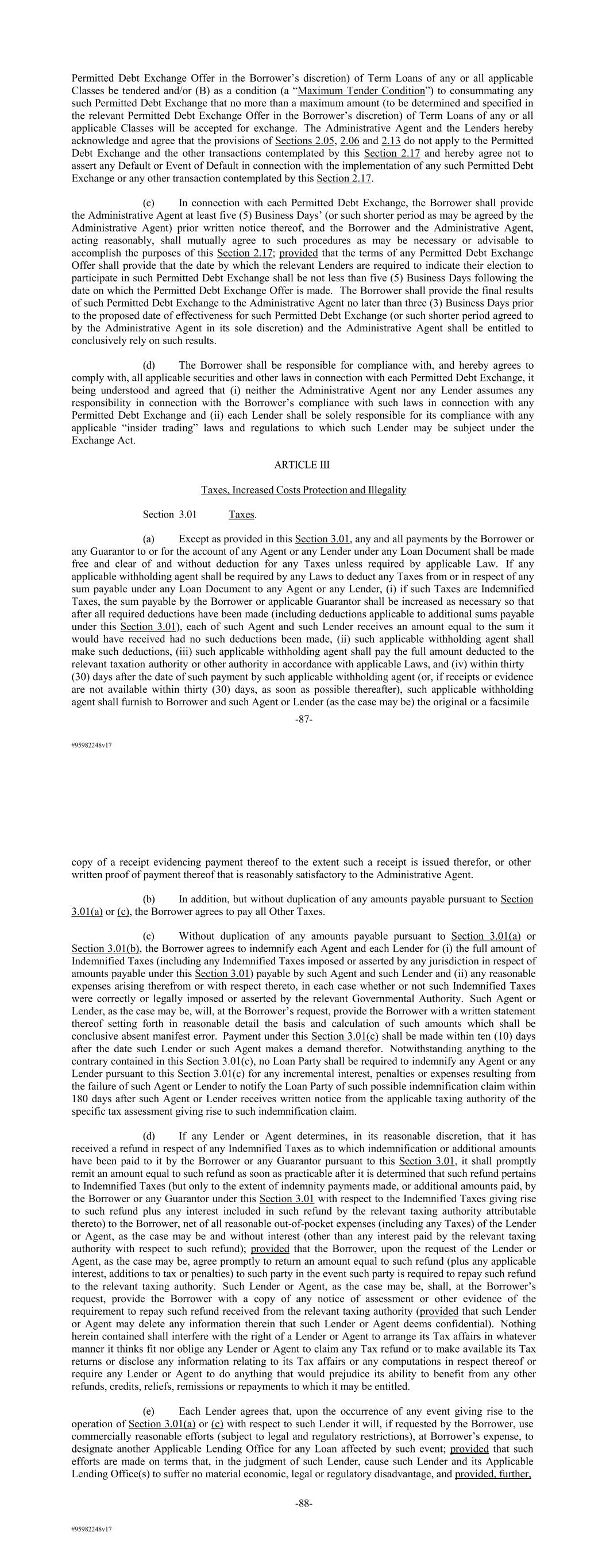 #95982248v17 Permitted Debt Exchange Offer in the Borrower’s discretion) of Term Loans of any or all applicable Classes be tendered and/or (B) as a condition (a “Maximum Tender Condition”) to consummating any such Permitted Debt Exchange that no more than a maximum amount (to be determined and specified in the relevant Permitted Debt Exchange Offer in the Borrower’s discretion) of Term Loans of any or all applicable Classes will be accepted for exchange. The Administrative Agent and the Lenders hereby acknowledge and agree that the provisions of Sections 2.05, 2.06 and 2.13 do not apply to the Permitted Debt Exchange and the other transactions contemplated by this Section 2.17 and hereby agree not to assert any Default or Event of Default in connection with the implementation of any such Permitted Debt Exchange or any other transaction contemplated by this Section 2.17. (c) In connection with each Permitted Debt Exchange, the Borrower shall provide the Administrative Agent at least five (5) Business Days’ (or such shorter period as may be agreed by the Administrative Agent) prior written notice thereof, and the Borrower and the Administrative Agent, acting reasonably, shall mutually agree to such procedures as may be necessary or advisable to accomplish the purposes of this Section 2.17; provided that the terms of any Permitted Debt Exchange Offer shall provide that the date by which the relevant Lenders are required to indicate their election to participate in such Permitted Debt Exchange shall be not less than five (5) Business Days following the date on which the Permitted Debt Exchange Offer is made. The Borrower shall provide the final results of such Permitted Debt Exchange to the Administrative Agent no later than three (3) Business Days prior to the proposed date of effectiveness for such Permitted Debt Exchange (or such shorter period agreed to by the Administrative Agent in its sole discretion) and the Administrative Agent shall be entitled to conclusively rely on such results. (d) The Borrower shall be responsible for compliance with, and hereby agrees to comply with, all applicable securities and other laws in connection with each Permitted Debt Exchange, it being understood and agreed that (i) neither the Administrative Agent nor any Lender assumes any responsibility in connection with the Borrower’s compliance with such laws in connection with any Permitted Debt Exchange and (ii) each Lender shall be solely responsible for its compliance with any applicable “insider trading” laws and regulations to which such Lender may be subject under the Exchange Act. ARTICLE III Taxes, Increased Costs Protection and Illegality Section 3.01 Taxes. (a) Except as provided in this Section 3.01, any and all payments by the Borrower or any Guarantor to or for the account of any Agent or any Lender under any Loan Document shall be made free and clear of and without deduction for any Taxes unless required by applicable Law. If any applicable withholding agent shall be required by any Laws to deduct any Taxes from or in respect of any sum payable under any Loan Document to any Agent or any Lender, (i) if such Taxes are Indemnified Taxes, the sum payable by the Borrower or applicable Guarantor shall be increased as necessary so that after all required deductions have been made (including deductions applicable to additional sums payable under this Section 3.01), each of such Agent and such Lender receives an amount equal to the sum it would have received had no such deductions been made, (ii) such applicable withholding agent shall make such deductions, (iii) such applicable withholding agent shall pay the full amount deducted to the relevant taxation authority or other authority in accordance with applicable Laws, and (iv) within thirty (30) days after the date of such payment by such applicable withholding agent (or, if receipts or evidence are not available within thirty (30) days, as soon as possible thereafter), such applicable withholding agent shall furnish to Borrower and such Agent or Lender (as the case may be) the original or a facsimile -87- #95982248v17 copy of a receipt evidencing payment thereof to the extent such a receipt is issued therefor, or other written proof of payment thereof that is reasonably satisfactory to the Administrative Agent. (b) In addition, but without duplication of any amounts payable pursuant to Section 3.01(a) or (c), the Borrower agrees to pay all Other Taxes. (c) Without duplication of any amounts payable pursuant to Section 3.01(a) or Section 3.01(b), the Borrower agrees to indemnify each Agent and each Lender for (i) the full amount of Indemnified Taxes (including any Indemnified Taxes imposed or asserted by any jurisdiction in respect of amounts payable under this Section 3.01) payable by such Agent and such Lender and (ii) any reasonable expenses arising therefrom or with respect thereto, in each case whether or not such Indemnified Taxes were correctly or legally imposed or asserted by the relevant Governmental Authority. Such Agent or Lender, as the case may be, will, at the Borrower’s request, provide the Borrower with a written statement thereof setting forth in reasonable detail the basis and calculation of such amounts which shall be conclusive absent manifest error. Payment under this Section 3.01(c) shall be made within ten (10) days after the date such Lender or such Agent makes a demand therefor. Notwithstanding anything to the contrary contained in this Section 3.01(c), no Loan Party shall be required to indemnify any Agent or any Lender pursuant to this Section 3.01(c) for any incremental interest, penalties or expenses resulting from the failure of such Agent or Lender to notify the Loan Party of such possible indemnification claim within 180 days after such Agent or Lender receives written notice from the applicable taxing authority of the specific tax assessment giving rise to such indemnification claim. (d) If any Lend