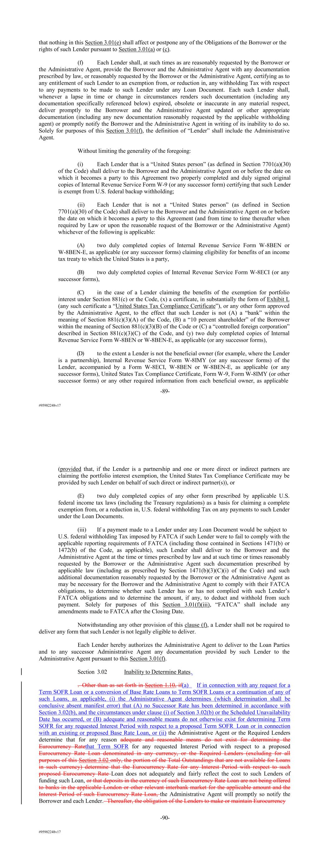 #95982248v17 that nothing in this Section 3.01(e) shall affect or postpone any of the Obligations of the Borrower or the rights of such Lender pursuant to Section 3.01(a) or (c). (f) Each Lender shall, at such times as are reasonably requested by the Borrower or the Administrative Agent, provide the Borrower and the Administrative Agent with any documentation prescribed by law, or reasonably requested by the Borrower or the Administrative Agent, certifying as to any entitlement of such Lender to an exemption from, or reduction in, any withholding Tax with respect to any payments to be made to such Lender under any Loan Document. Each such Lender shall, whenever a lapse in time or change in circumstances renders such documentation (including any documentation specifically referenced below) expired, obsolete or inaccurate in any material respect, deliver promptly to the Borrower and the Administrative Agent updated or other appropriate documentation (including any new documentation reasonably requested by the applicable withholding agent) or promptly notify the Borrower and the Administrative Agent in writing of its inability to do so. Solely for purposes of this Section 3.01(f), the definition of “Lender” shall include the Administrative Agent. Without limiting the generality of the foregoing: (i) Each Lender that is a “United States person” (as defined in Section 7701(a)(30) of the Code) shall deliver to the Borrower and the Administrative Agent on or before the date on which it becomes a party to this Agreement two properly completed and duly signed original copies of Internal Revenue Service Form W-9 (or any successor form) certifying that such Lender is exempt from U.S. federal backup withholding; (ii) Each Lender that is not a “United States person” (as defined in Section 7701(a)(30) of the Code) shall deliver to the Borrower and the Administrative Agent on or before the date on which it becomes a party to this Agreement (and from time to time thereafter when required by Law or upon the reasonable request of the Borrower or the Administrative Agent) whichever of the following is applicable: (A) two duly completed copies of Internal Revenue Service Form W-8BEN or W-8BEN-E, as applicable (or any successor forms) claiming eligibility for benefits of an income tax treaty to which the United States is a party, (B) two duly completed copies of Internal Revenue Service Form W-8ECI (or any successor forms), (C) in the case of a Lender claiming the benefits of the exemption for portfolio interest under Section 881(c) or the Code, (x) a certificate, in substantially the form of Exhibit L (any such certificate a “United States Tax Compliance Certificate”), or any other form approved by the Administrative Agent, to the effect that such Lender is not (A) a “bank” within the meaning of Section 881(c)(3)(A) of the Code, (B) a “10 percent shareholder” of the Borrower within the meaning of Section 881(c)(3)(B) of the Code or (C) a “controlled foreign corporation” described in Section 881(c)(3)(C) of the Code, and (y) two duly completed copies of Internal Revenue Service Form W-8BEN or W-8BEN-E, as applicable (or any successor forms), (D) to the extent a Lender is not the beneficial owner (for example, where the Lender is a partnership), Internal Revenue Service Form W-8IMY (or any successor forms) of the Lender, accompanied by a Form W-8ECI, W-8BEN or W-8BEN-E, as applicable (or any successor forms), United States Tax Compliance Certificate, Form W-9, Form W-8IMY (or other successor forms) or any other required information from each beneficial owner, as applicable -89- #95982248v17 (provided that, if the Lender is a partnership and one or more direct or indirect partners are claiming the portfolio interest exemption, the United States Tax Compliance Certificate may be provided by such Lender on behalf of such direct or indirect partner(s)), or (E) two duly completed copies of any other form prescribed by applicable U.S. federal income tax laws (including the Treasury regulations) as a basis for claiming a complete exemption from, or a reduction in, U.S. federal withholding Tax on any payments to such Lender under the Loan Documents. (iii) If a payment made to a Lender under any Loan Document would be subject to U.S. federal withholding Tax imposed by FATCA if such Lender were to fail to comply with the applicable reporting requirements of FATCA (including those contained in Sections 1471(b) or 1472(b) of the Code, as applicable), such Lender shall deliver to the Borrower and the Administrative Agent at the time or times prescribed by law and at such time or times reasonably requested by the Borrower or the Administrative Agent such documentation prescribed by applicable law (including as prescribed by Section 1471(b)(3)(C)(i) of the Code) and such additional documentation reasonably requested by the Borrower or the Administrative Agent as may be necessary for the Borrower and the Administrative Agent to comply with their FATCA obligations, to determine whether such Lender has or has not complied with such Lender’s FATCA obligations and to determine the amount, if any, to deduct and withhold from such payment. Solely for purposes of this Section 3.01(f)(iii), “FATCA” shall include any amendments made to FATCA after the Closing Date. Notwithstanding any other provision of this clause (f), a Lender shall not be required to deliver any form that such Lender is not legally eligible to deliver. Each Lender hereby authorizes the Administrative Agent to deliver to the Loan Parties and to any successor Administrative Agent any documentation provided by such Lender to the Administrative Agent pursuant to this Section 3.01(f). Section 3.02 Inability to Determine Rates. . Other than as set forth in Section 1.10, if(a) If in connection with any request for a Term SOFR Loan or a conversion of Base Rate Loans to Term SOFR Loans or a continuation of any of such Loans, as applicable,