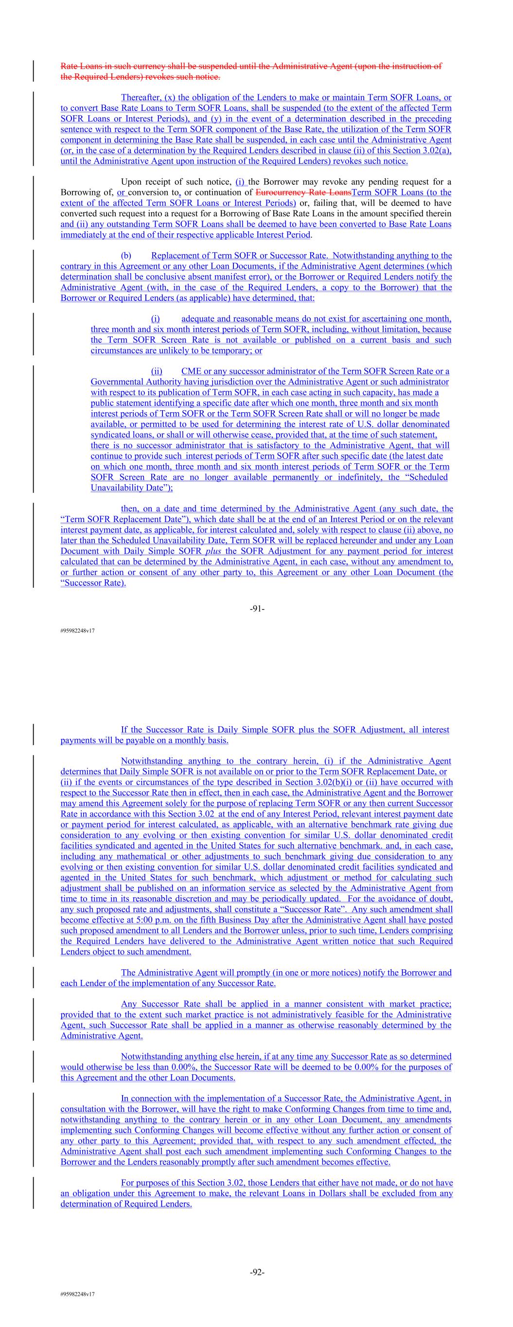 #95982248v17 Rate Loans in such currency shall be suspended until the Administrative Agent (upon the instruction of the Required Lenders) revokes such notice. Thereafter, (x) the obligation of the Lenders to make or maintain Term SOFR Loans, or to convert Base Rate Loans to Term SOFR Loans, shall be suspended (to the extent of the affected Term SOFR Loans or Interest Periods), and (y) in the event of a determination described in the preceding sentence with respect to the Term SOFR component of the Base Rate, the utilization of the Term SOFR component in determining the Base Rate shall be suspended, in each case until the Administrative Agent (or, in the case of a determination by the Required Lenders described in clause (ii) of this Section 3.02(a), until the Administrative Agent upon instruction of the Required Lenders) revokes such notice. Upon receipt of such notice, (i) the Borrower may revoke any pending request for a Borrowing of, or conversion to, or continuation of Eurocurrency Rate LoansTerm SOFR Loans (to the extent of the affected Term SOFR Loans or Interest Periods) or, failing that, will be deemed to have converted such request into a request for a Borrowing of Base Rate Loans in the amount specified therein and (ii) any outstanding Term SOFR Loans shall be deemed to have been converted to Base Rate Loans immediately at the end of their respective applicable Interest Period. (b) Replacement of Term SOFR or Successor Rate. Notwithstanding anything to the contrary in this Agreement or any other Loan Documents, if the Administrative Agent determines (which determination shall be conclusive absent manifest error), or the Borrower or Required Lenders notify the Administrative Agent (with, in the case of the Required Lenders, a copy to the Borrower) that the Borrower or Required Lenders (as applicable) have determined, that: (i) adequate and reasonable means do not exist for ascertaining one month, three month and six month interest periods of Term SOFR, including, without limitation, because the Term SOFR Screen Rate is not available or published on a current basis and such circumstances are unlikely to be temporary; or (ii) CME or any successor administrator of the Term SOFR Screen Rate or a Governmental Authority having jurisdiction over the Administrative Agent or such administrator with respect to its publication of Term SOFR, in each case acting in such capacity, has made a public statement identifying a specific date after which one month, three month and six month interest periods of Term SOFR or the Term SOFR Screen Rate shall or will no longer be made available, or permitted to be used for determining the interest rate of U.S. dollar denominated syndicated loans, or shall or will otherwise cease, provided that, at the time of such statement, there is no successor administrator that is satisfactory to the Administrative Agent, that will continue to provide such interest periods of Term SOFR after such specific date (the latest date on which one month, three month and six month interest periods of Term SOFR or the Term SOFR Screen Rate are no longer available permanently or indefinitely, the “Scheduled Unavailability Date”); then, on a date and time determined by the Administrative Agent (any such date, the “Term SOFR Replacement Date”), which date shall be at the end of an Interest Period or on the relevant interest payment date, as applicable, for interest calculated and, solely with respect to clause (ii) above, no later than the Scheduled Unavailability Date, Term SOFR will be replaced hereunder and under any Loan Document with Daily Simple SOFR plus the SOFR Adjustment for any payment period for interest calculated that can be determined by the Administrative Agent, in each case, without any amendment to, or further action or consent of any other party to, this Agreement or any other Loan Document (the “Successor Rate). -91- #95982248v17 If the Successor Rate is Daily Simple SOFR plus the SOFR Adjustment, all interest payments will be payable on a monthly basis. Notwithstanding anything to the contrary herein, (i) if the Administrative Agent determines that Daily Simple SOFR is not available on or prior to the Term SOFR Replacement Date, or (ii) if the events or circumstances of the type described in Section 3.02(b)(i) or (ii) have occurred with respect to the Successor Rate then in effect, then in each case, the Administrative Agent and the Borrower may amend this Agreement solely for the purpose of replacing Term SOFR or any then current Successor Rate in accordance with this Section 3.02 at the end of any Interest Period, relevant interest payment date or payment period for interest calculated, as applicable, with an alternative benchmark rate giving due consideration to any evolving or then existing convention for similar U.S. dollar denominated credit facilities syndicated and agented in the United States for such alternative benchmark. and, in each case, including any mathematical or other adjustments to such benchmark giving due consideration to any evolving or then existing convention for similar U.S. dollar denominated credit facilities syndicated and agented in the United States for such benchmark, which adjustment or method for calculating such adjustment shall be published on an information service as selected by the Administrative Agent from time to time in its reasonable discretion and may be periodically updated. For the avoidance of doubt, any such proposed rate and adjustments, shall constitute a “Successor Rate”. Any such amendment shall become effective at 5:00 p.m. on the fifth Business Day after the Administrative Agent shall have posted such proposed amendment to all Lenders and the Borrower unless, prior to such time, Lenders comprising the Required Lenders have delivered to the Administrative Agent written notice that such Required Lenders object to such amendment. The Administrative Agent will promptly (in one or more notices) no