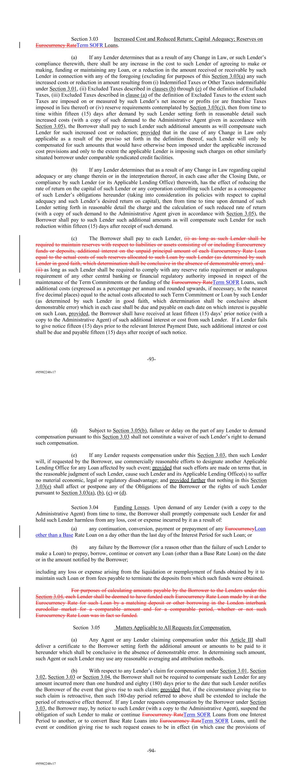 #95982248v17 Section 3.03 Increased Cost and Reduced Return; Capital Adequacy; Reserves on Eurocurrency RateTerm SOFR Loans. (a) If any Lender determines that as a result of any Change in Law, or such Lender’s compliance therewith, there shall be any increase in the cost to such Lender of agreeing to make or making, funding or maintaining any Loan, or a reduction in the amount received or receivable by such Lender in connection with any of the foregoing (excluding for purposes of this Section 3.03(a) any such increased costs or reduction in amount resulting from (i) Indemnified Taxes or Other Taxes indemnifiable under Section 3.01, (ii) Excluded Taxes described in clauses (b) through (e) of the definition of Excluded Taxes, (iii) Excluded Taxes described in clause (a) of the definition of Excluded Taxes to the extent such Taxes are imposed on or measured by such Lender’s net income or profits (or are franchise Taxes imposed in lieu thereof) or (iv) reserve requirements contemplated by Section 3.03(c)), then from time to time within fifteen (15) days after demand by such Lender setting forth in reasonable detail such increased costs (with a copy of such demand to the Administrative Agent given in accordance with Section 3.05), the Borrower shall pay to such Lender such additional amounts as will compensate such Lender for such increased cost or reduction; provided that in the case of any Change in Law only applicable as a result of the proviso set forth in the definition thereof, such Lender will only be compensated for such amounts that would have otherwise been imposed under the applicable increased cost provisions and only to the extent the applicable Lender is imposing such charges on other similarly situated borrower under comparable syndicated credit facilities. (b) If any Lender determines that as a result of any Change in Law regarding capital adequacy or any change therein or in the interpretation thereof, in each case after the Closing Date, or compliance by such Lender (or its Applicable Lending Office) therewith, has the effect of reducing the rate of return on the capital of such Lender or any corporation controlling such Lender as a consequence of such Lender’s obligations hereunder (taking into consideration its policies with respect to capital adequacy and such Lender’s desired return on capital), then from time to time upon demand of such Lender setting forth in reasonable detail the charge and the calculation of such reduced rate of return (with a copy of such demand to the Administrative Agent given in accordance with Section 3.05), the Borrower shall pay to such Lender such additional amounts as will compensate such Lender for such reduction within fifteen (15) days after receipt of such demand. (c) The Borrower shall pay to each Lender, (i) as long as such Lender shall be required to maintain reserves with respect to liabilities or assets consisting of or including Eurocurrency funds or deposits, additional interest on the unpaid principal amount of each Eurocurrency Rate Loan equal to the actual costs of such reserves allocated to such Loan by such Lender (as determined by such Lender in good faith, which determination shall be conclusive in the absence of demonstrable error), and (ii) as long as such Lender shall be required to comply with any reserve ratio requirement or analogous requirement of any other central banking or financial regulatory authority imposed in respect of the maintenance of the Term Commitments or the funding of the Eurocurrency RateTerm SOFR Loans, such additional costs (expressed as a percentage per annum and rounded upwards, if necessary, to the nearest five decimal places) equal to the actual costs allocated to such Term Commitment or Loan by such Lender (as determined by such Lender in good faith, which determination shall be conclusive absent demonstrable error) which in each case shall be due and payable on each date on which interest is payable on such Loan, provided, the Borrower shall have received at least fifteen (15) days’ prior notice (with a copy to the Administrative Agent) of such additional interest or cost from such Lender. If a Lender fails to give notice fifteen (15) days prior to the relevant Interest Payment Date, such additional interest or cost shall be due and payable fifteen (15) days after receipt of such notice. -93- #95982248v17 (d) Subject to Section 3.05(b), failure or delay on the part of any Lender to demand compensation pursuant to this Section 3.03 shall not constitute a waiver of such Lender’s right to demand such compensation. (e) If any Lender requests compensation under this Section 3.03, then such Lender will, if requested by the Borrower, use commercially reasonable efforts to designate another Applicable Lending Office for any Loan affected by such event; provided that such efforts are made on terms that, in the reasonable judgment of such Lender, cause such Lender and its Applicable Lending Office(s) to suffer no material economic, legal or regulatory disadvantage; and provided further that nothing in this Section 3.03(e) shall affect or postpone any of the Obligations of the Borrower or the rights of such Lender pursuant to Section 3.03(a), (b), (c) or (d). Section 3.04 Funding Losses. Upon demand of any Lender (with a copy to the Administrative Agent) from time to time, the Borrower shall promptly compensate such Lender for and hold such Lender harmless from any loss, cost or expense incurred by it as a result of: (a) any continuation, conversion, payment or prepayment of any EurocurrencyLoan other than a Base Rate Loan on a day other than the last day of the Interest Period for such Loan; or (b) any failure by the Borrower (for a reason other than the failure of such Lender to make a Loan) to prepay, borrow, continue or convert any Loan (other than a Base Rate Loan) on the date or in the amount notified by the Borrower; including any loss or expense arising from the liquidation or reemp