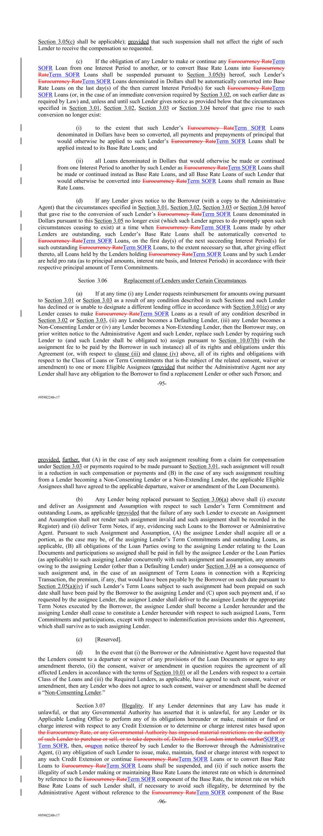 #95982248v17 Section 3.05(c) shall be applicable); provided that such suspension shall not affect the right of such Lender to receive the compensation so requested. (c) If the obligation of any Lender to make or continue any Eurocurrency RateTerm SOFR Loan from one Interest Period to another, or to convert Base Rate Loans into Eurocurrency RateTerm SOFR Loans shall be suspended pursuant to Section 3.05(b) hereof, such Lender’s Eurocurrency RateTerm SOFR Loans denominated in Dollars shall be automatically converted into Base Rate Loans on the last day(s) of the then current Interest Period(s) for such Eurocurrency RateTerm SOFR Loans (or, in the case of an immediate conversion required by Section 3.02, on such earlier date as required by Law) and, unless and until such Lender gives notice as provided below that the circumstances specified in Section 3.01, Section 3.02, Section 3.03 or Section 3.04 hereof that gave rise to such conversion no longer exist: (i) to the extent that such Lender’s Eurocurrency RateTerm SOFR Loans denominated in Dollars have been so converted, all payments and prepayments of principal that would otherwise be applied to such Lender’s Eurocurrency RateTerm SOFR Loans shall be applied instead to its Base Rate Loans; and (ii) all Loans denominated in Dollars that would otherwise be made or continued from one Interest Period to another by such Lender as Eurocurrency RateTerm SOFR Loans shall be made or continued instead as Base Rate Loans, and all Base Rate Loans of such Lender that would otherwise be converted into Eurocurrency RateTerm SOFR Loans shall remain as Base Rate Loans. (d) If any Lender gives notice to the Borrower (with a copy to the Administrative Agent) that the circumstances specified in Section 3.01, Section 3.02, Section 3.03 or Section 3.04 hereof that gave rise to the conversion of such Lender’s Eurocurrency RateTerm SOFR Loans denominated in Dollars pursuant to this Section 3.05 no longer exist (which such Lender agrees to do promptly upon such circumstances ceasing to exist) at a time when Eurocurrency RateTerm SOFR Loans made by other Lenders are outstanding, such Lender’s Base Rate Loans shall be automatically converted to Eurocurrency RateTerm SOFR Loans, on the first day(s) of the next succeeding Interest Period(s) for such outstanding Eurocurrency RateTerm SOFR Loans, to the extent necessary so that, after giving effect thereto, all Loans held by the Lenders holding Eurocurrency RateTerm SOFR Loans and by such Lender are held pro rata (as to principal amounts, interest rate basis, and Interest Periods) in accordance with their respective principal amount of Term Commitments. Section 3.06 Replacement of Lenders under Certain Circumstances. (a) If at any time (i) any Lender requests reimbursement for amounts owing pursuant to Section 3.01 or Section 3.03 as a result of any condition described in such Sections and such Lender has declined or is unable to designate a different lending office in accordance with Section 3.01(e) or any Lender ceases to make Eurocurrency RateTerm SOFR Loans as a result of any condition described in Section 3.02 or Section 3.03, (ii) any Lender becomes a Defaulting Lender, (iii) any Lender becomes a Non-Consenting Lender or (iv) any Lender becomes a Non-Extending Lender, then the Borrower may, on prior written notice to the Administrative Agent and such Lender, replace such Lender by requiring such Lender to (and such Lender shall be obligated to) assign pursuant to Section 10.07(b) (with the assignment fee to be paid by the Borrower in such instance) all of its rights and obligations under this Agreement (or, with respect to clause (iii) and clause (iv) above, all of its rights and obligations with respect to the Class of Loans or Term Commitments that is the subject of the related consent, waiver or amendment) to one or more Eligible Assignees (provided that neither the Administrative Agent nor any Lender shall have any obligation to the Borrower to find a replacement Lender or other such Person; and -95- #95982248v17 provided, further, that (A) in the case of any such assignment resulting from a claim for compensation under Section 3.03 or payments required to be made pursuant to Section 3.01, such assignment will result in a reduction in such compensation or payments and (B) in the case of any such assignment resulting from a Lender becoming a Non-Consenting Lender or a Non-Extending Lender, the applicable Eligible Assignees shall have agreed to the applicable departure, waiver or amendment of the Loan Documents). (b) Any Lender being replaced pursuant to Section 3.06(a) above shall (i) execute and deliver an Assignment and Assumption with respect to such Lender’s Term Commitment and outstanding Loans, as applicable (provided that the failure of any such Lender to execute an Assignment and Assumption shall not render such assignment invalid and such assignment shall be recorded in the Register) and (ii) deliver Term Notes, if any, evidencing such Loans to the Borrower or Administrative Agent. Pursuant to such Assignment and Assumption, (A) the assignee Lender shall acquire all or a portion, as the case may be, of the assigning Lender’s Term Commitments and outstanding Loans, as applicable, (B) all obligations of the Loan Parties owing to the assigning Lender relating to the Loan Documents and participations so assigned shall be paid in full by the assignee Lender or the Loan Parties (as applicable) to such assigning Lender concurrently with such assignment and assumption, any amounts owing to the assigning Lender (other than a Defaulting Lender) under Section 3.04 as a consequence of such assignment and, in the case of an assignment of Term Loans in connection with a Repricing Transaction, the premium, if any, that would have been payable by the Borrower on such date pursuant to Section 2.05(a)(iv) if such Lender’s Term Loans subject to such assignment had been prepaid on such date shall have been
