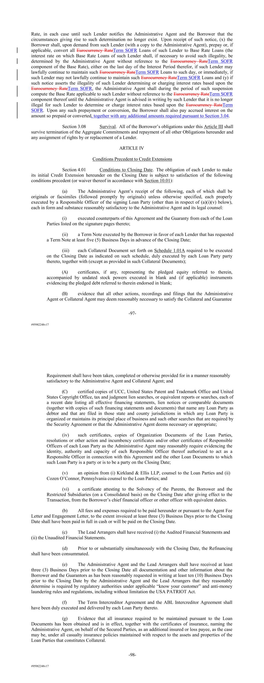 #95982248v17 Rate, in each case until such Lender notifies the Administrative Agent and the Borrower that the circumstances giving rise to such determination no longer exist. Upon receipt of such notice, (x) the Borrower shall, upon demand from such Lender (with a copy to the Administrative Agent), prepay or, if applicable, convert all Eurocurrency RateTerm SOFR Loans of such Lender to Base Rate Loans (the interest rate on which Base Rate Loans of such Lender shall, if necessary to avoid such illegality, be determined by the Administrative Agent without reference to the Eurocurrency RateTerm SOFR component of the Base Rate), either on the last day of the Interest Period therefor, if such Lender may lawfully continue to maintain such Eurocurrency RateTerm SOFR Loans to such day, or immediately, if such Lender may not lawfully continue to maintain such Eurocurrency RateTerm SOFR Loans and (y) if such notice asserts the illegality of such Lender determining or charging interest rates based upon the Eurocurrency RateTerm SOFR, the Administrative Agent shall during the period of such suspension compute the Base Rate applicable to such Lender without reference to the Eurocurrency RateTerm SOFR component thereof until the Administrative Agent is advised in writing by such Lender that it is no longer illegal for such Lender to determine or charge interest rates based upon the Eurocurrency RateTerm SOFR. Upon any such prepayment or conversion, the Borrower shall also pay accrued interest on the amount so prepaid or converted, together with any additional amounts required pursuant to Section 3.04. Section 3.08 Survival. All of the Borrower’s obligations under this Article III shall survive termination of the Aggregate Commitments and repayment of all other Obligations hereunder and any assignment of rights by or replacement of a Lender. ARTICLE IV Conditions Precedent to Credit Extensions Section 4.01 Conditions to Closing Date. The obligation of each Lender to make its initial Credit Extension hereunder on the Closing Date is subject to satisfaction of the following conditions precedent (or waiver thereof in accordance with Section 10.01): (a) The Administrative Agent’s receipt of the following, each of which shall be originals or facsimiles (followed promptly by originals) unless otherwise specified, each properly executed by a Responsible Officer of the signing Loan Party (other than in respect of (a)(i)(v) below), each in form and substance reasonably satisfactory to the Administrative Agent and its legal counsel: (i) executed counterparts of this Agreement and the Guaranty from each of the Loan Parties listed on the signature pages thereto; (ii) a Term Note executed by the Borrower in favor of each Lender that has requested a Term Note at least five (5) Business Days in advance of the Closing Date; (iii) each Collateral Document set forth on Schedule 1.01A required to be executed on the Closing Date as indicated on such schedule, duly executed by each Loan Party party thereto, together with (except as provided in such Collateral Documents); (A) certificates, if any, representing the pledged equity referred to therein, accompanied by undated stock powers executed in blank and (if applicable) instruments evidencing the pledged debt referred to therein endorsed in blank; (B) evidence that all other actions, recordings and filings that the Administrative Agent or Collateral Agent may deem reasonably necessary to satisfy the Collateral and Guarantee -97- #95982248v17 Requirement shall have been taken, completed or otherwise provided for in a manner reasonably satisfactory to the Administrative Agent and Collateral Agent; and (C) certified copies of UCC, United States Patent and Trademark Office and United States Copyright Office, tax and judgment lien searches, or equivalent reports or searches, each of a recent date listing all effective financing statements, lien notices or comparable documents (together with copies of such financing statements and documents) that name any Loan Party as debtor and that are filed in those state and county jurisdictions in which any Loan Party is organized or maintains its principal place of business and such other searches that are required by the Security Agreement or that the Administrative Agent deems necessary or appropriate; (iv) such certificates, copies of Organization Documents of the Loan Parties, resolutions or other action and incumbency certificates and/or other certificates of Responsible Officers of each Loan Party as the Administrative Agent may reasonably require evidencing the identity, authority and capacity of each Responsible Officer thereof authorized to act as a Responsible Officer in connection with this Agreement and the other Loan Documents to which such Loan Party is a party or is to be a party on the Closing Date; (v) an opinion from (i) Kirkland & Ellis LLP, counsel to the Loan Parties and (ii) Cozen O’Connor, Pennsylvania counsel to the Loan Parties; and (vi) a certificate attesting to the Solvency of the Parents, the Borrower and the Restricted Subsidiaries (on a Consolidated basis) on the Closing Date after giving effect to the Transaction, from the Borrower’s chief financial officer or other officer with equivalent duties. (b) All fees and expenses required to be paid hereunder or pursuant to the Agent Fee Letter and Engagement Letter, to the extent invoiced at least three (3) Business Days prior to the Closing Date shall have been paid in full in cash or will be paid on the Closing Date. (c) The Lead Arrangers shall have received (i) the Audited Financial Statements and (ii) the Unaudited Financial Statements. (d) Prior to or substantially simultaneously with the Closing Date, the Refinancing shall have been consummated. (e) The Administrative Agent and the Lead Arrangers shall have received at least three (3) Business Days prior to the Closing Date all documentation and other information about the Borrower and the Guarant